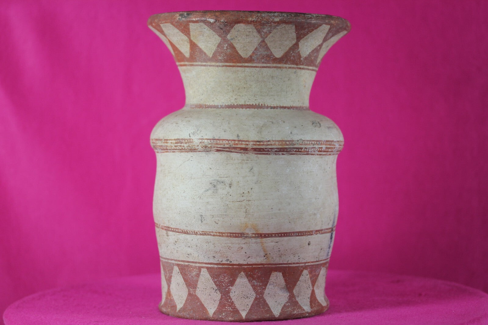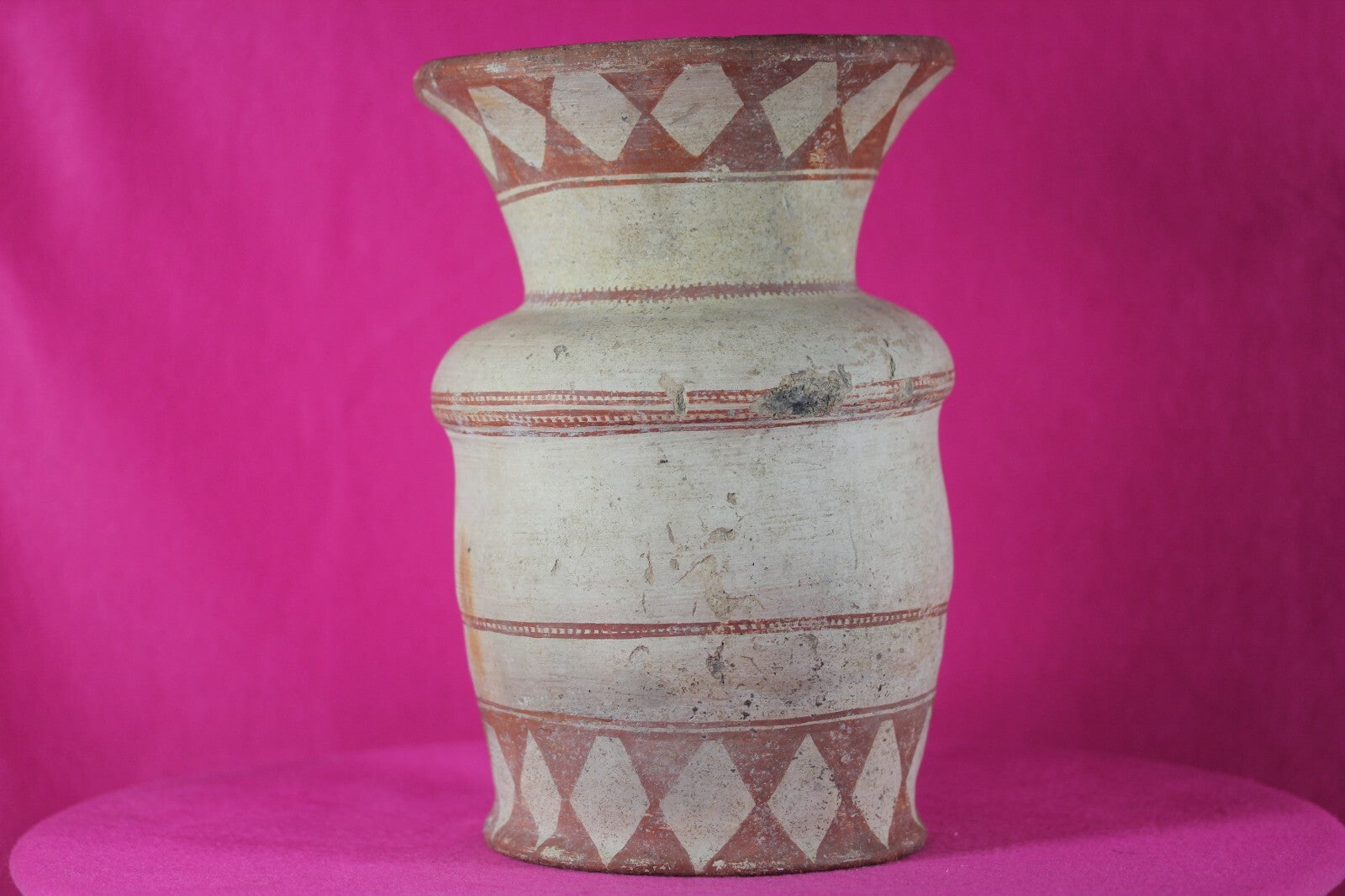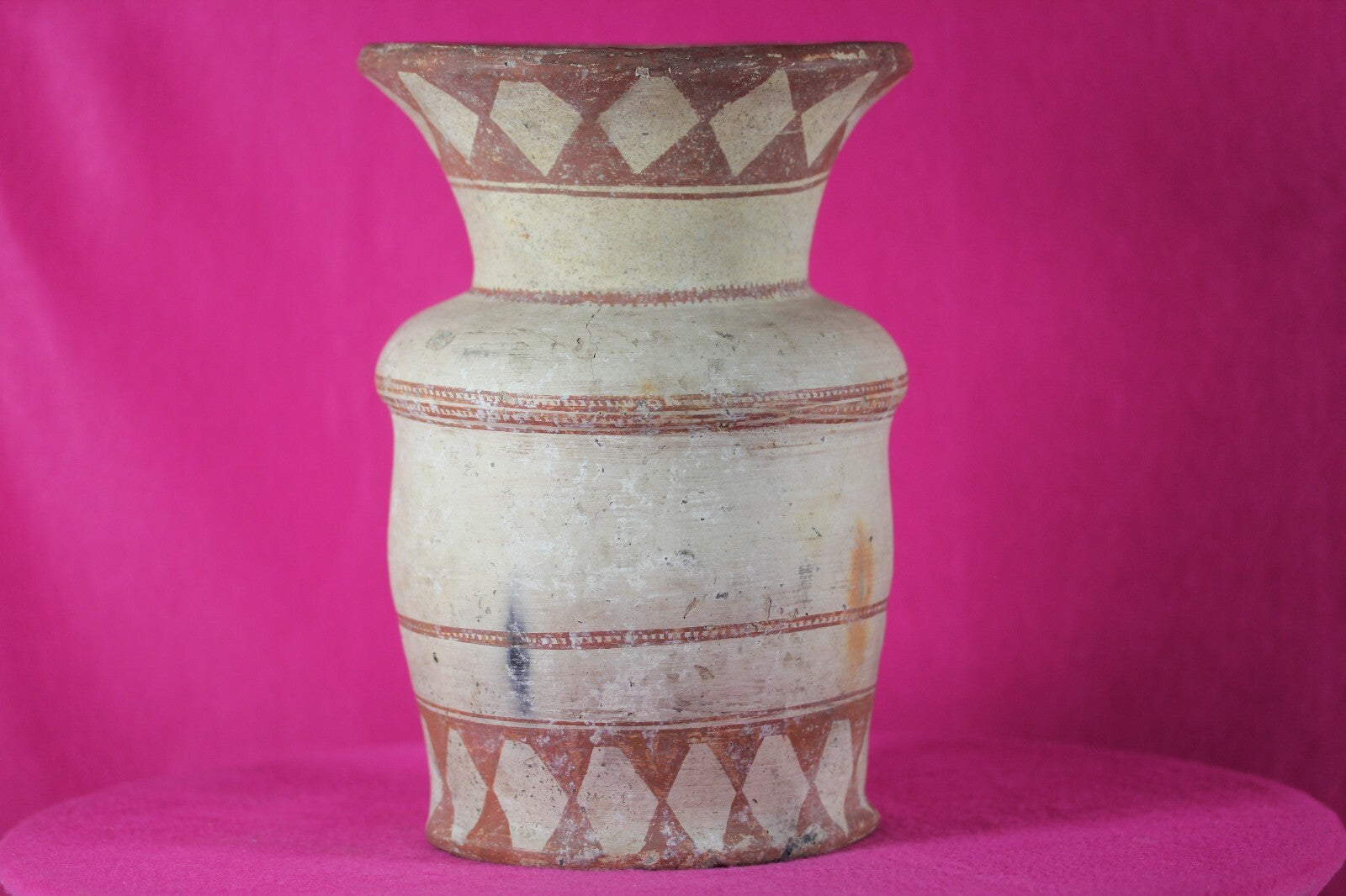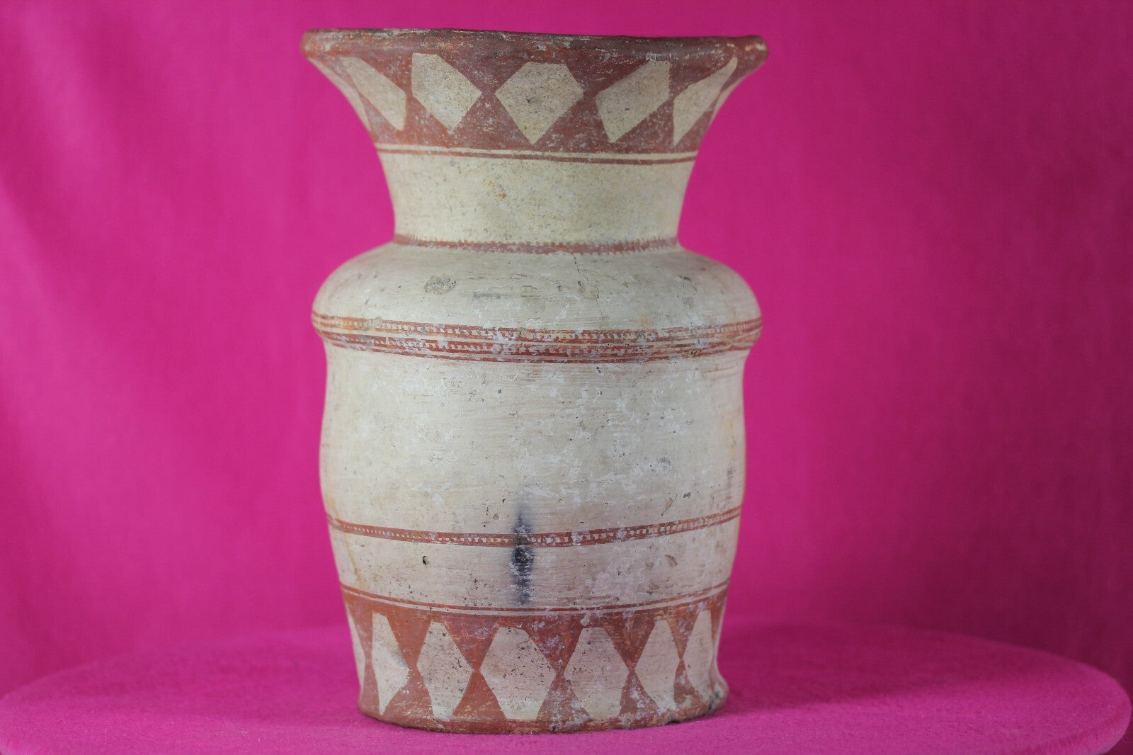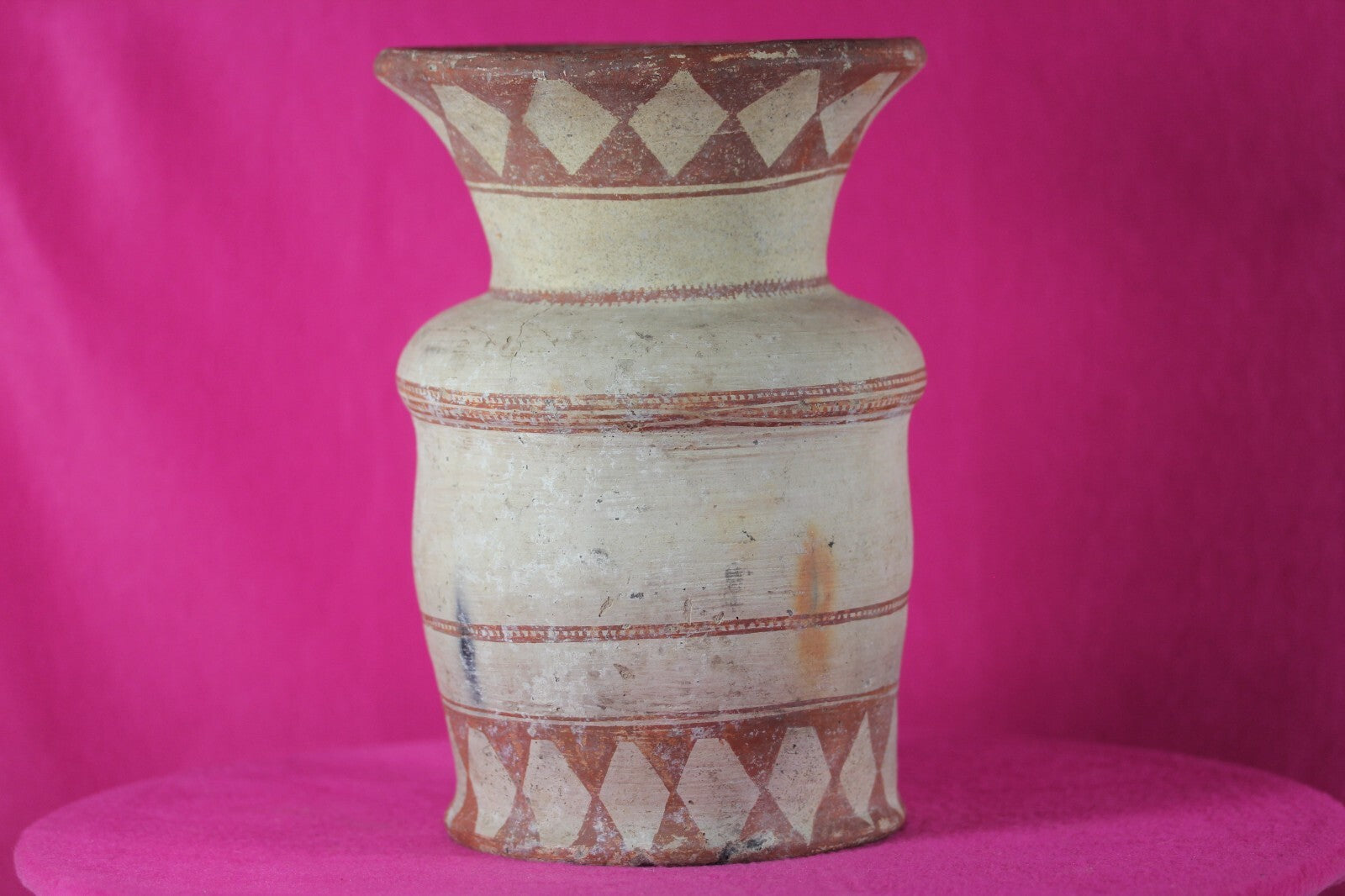 Museum Quality. Large pottery jar having a wide flared funnel type mouth, rounded rimmed shoulder and slightly bulbous cylindrical body. Cream slip ground with red-brown painted geometric bands and wide diamond element bands at the top and base rims. Overall scattered surface deposits. Approximately 1/3 of the base rim is restored and some scattered restoration and repairs to the mouth.