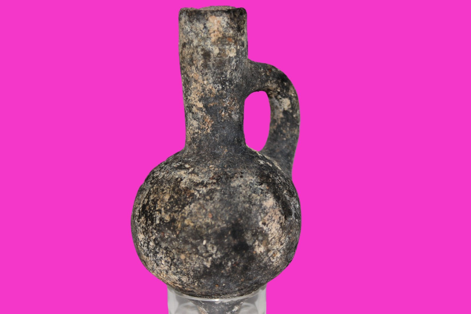 Dimensions: 2 ¾ inches tall, 2 inches wide, weighs 53 grams. Provenance: Excavated in Jerusalem in the 1980’s. Acquired by the Hamadian Antiquities Gallery in The Old City of Jerusalem. Export to the United States approved by the Israeli Antiquities Authority in 2025. Acquired by The Artifact City Collection in September 2025. Description: Blackware rounded bottom juglet. Mineral deposits indicative of approximately 3000 years of underground burial. Small rim chips and surface loss. No repairs or restorations found. Overall Excellent condition. King David is often looked upon as the most successful military conqueror in the history of the Israelite nation. By the end of his reign in 971 BC, the boundaries of Israel and the neighboring vassal kingdoms who paid tribute to David stretched across the Fertile Crescent from the Wadi of Egypt to the River Euphrates.