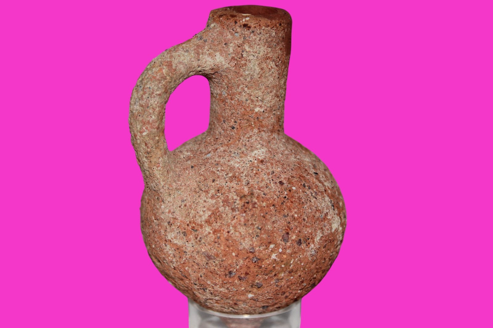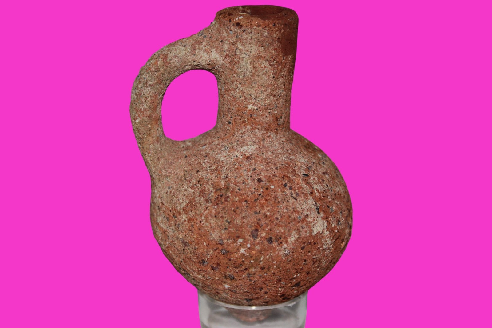 Dimensions: 3 ½ inches tall, 2 ½ inches wide, weighs 89 grams. Provenance: Excavated in Jerusalem in the 1980’s. Acquired by the Hamadian Antiquities Gallery in The Old City of Jerusalem. Export to the United States approved by the Israeli Antiquities Authority in 2025. Acquired by The Artifact City Collection in September 2025. Description: Redware rounded bottom juglet. Mineral deposits indicative of approximately 3000 years of underground burial. Small rim chips and surface loss. Top of spout repaired. Overall Fair condition. King David is often looked upon as the most successful military conqueror in the history of the Israelite nation. By the end of his reign in 971 BC, the boundaries of Israel and the neighboring vassal kingdoms who paid tribute to David stretched across the Fertile Crescent from the Wadi of Egypt to the River Euphrates.