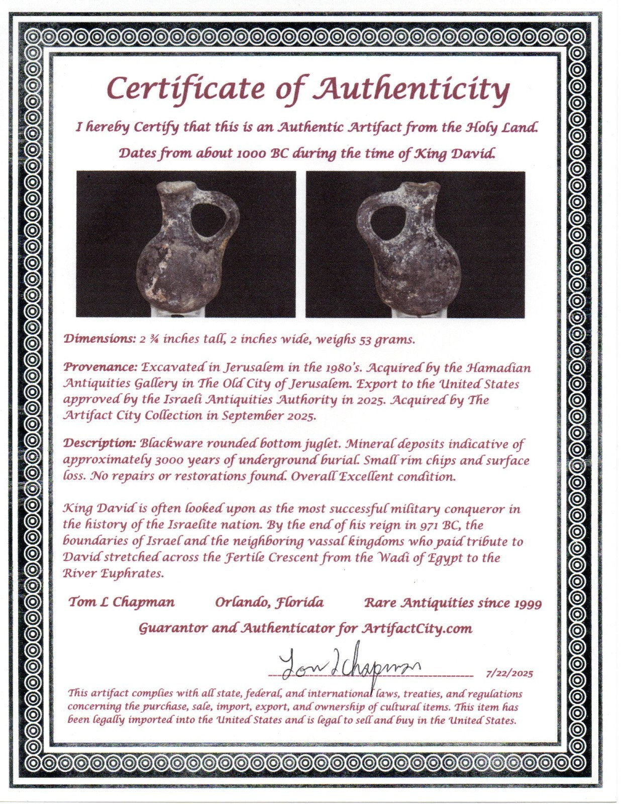 Dimensions: 2 ¾ inches tall, 2 inches wide, weighs 53 grams. Provenance: Excavated in Jerusalem in the 1980’s. Acquired by the Hamadian Antiquities Gallery in The Old City of Jerusalem. Export to the United States approved by the Israeli Antiquities Authority in 2025. Acquired by The Artifact City Collection in September 2025. Description: Blackware rounded bottom juglet. Mineral deposits indicative of approximately 3000 years of underground burial. Small rim chips and surface loss. No repairs or restorations found. Overall Excellent condition. King David is often looked upon as the most successful military conqueror in the history of the Israelite nation. By the end of his reign in 971 BC, the boundaries of Israel and the neighboring vassal kingdoms who paid tribute to David stretched across the Fertile Crescent from the Wadi of Egypt to the River Euphrates.