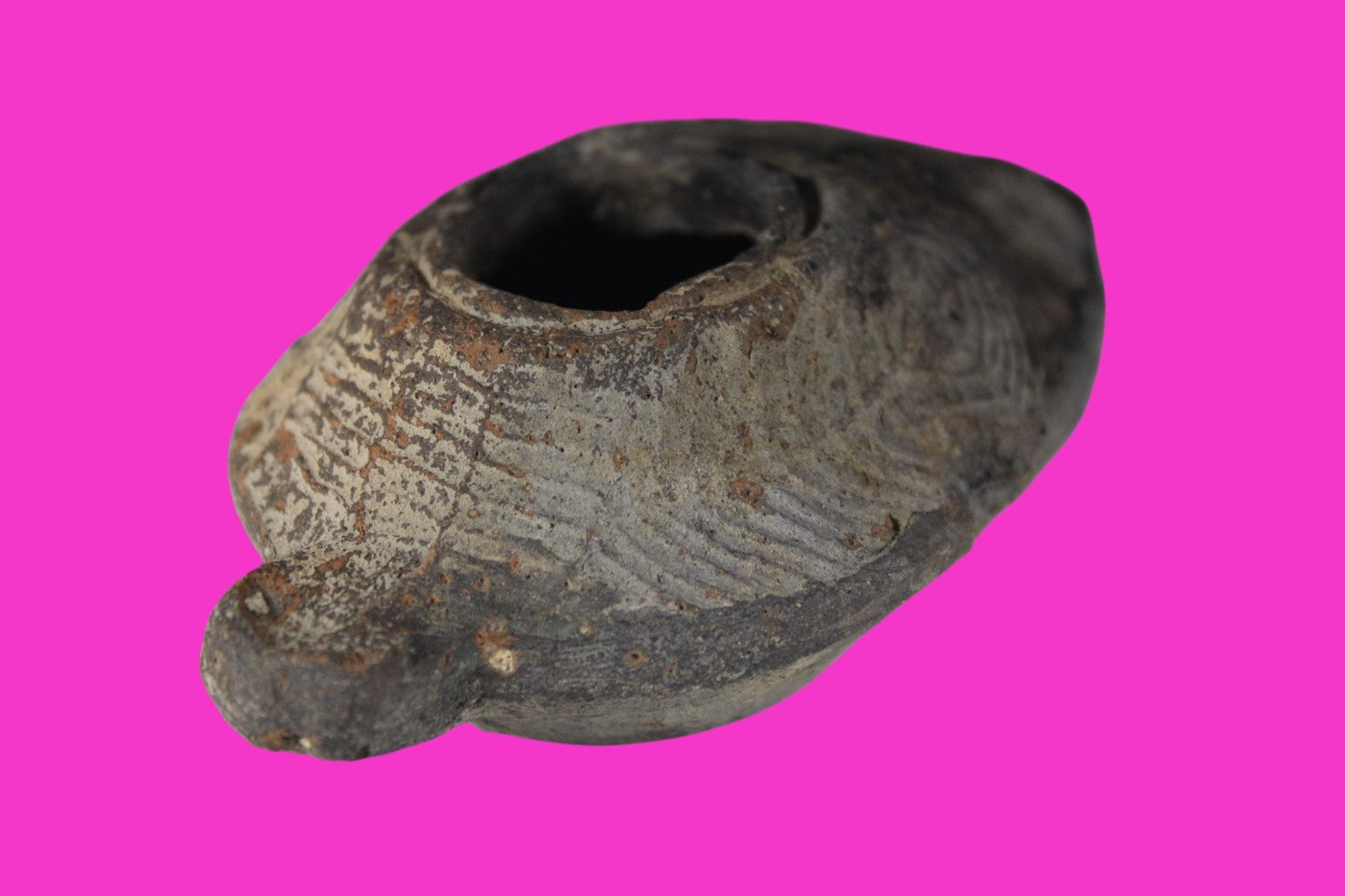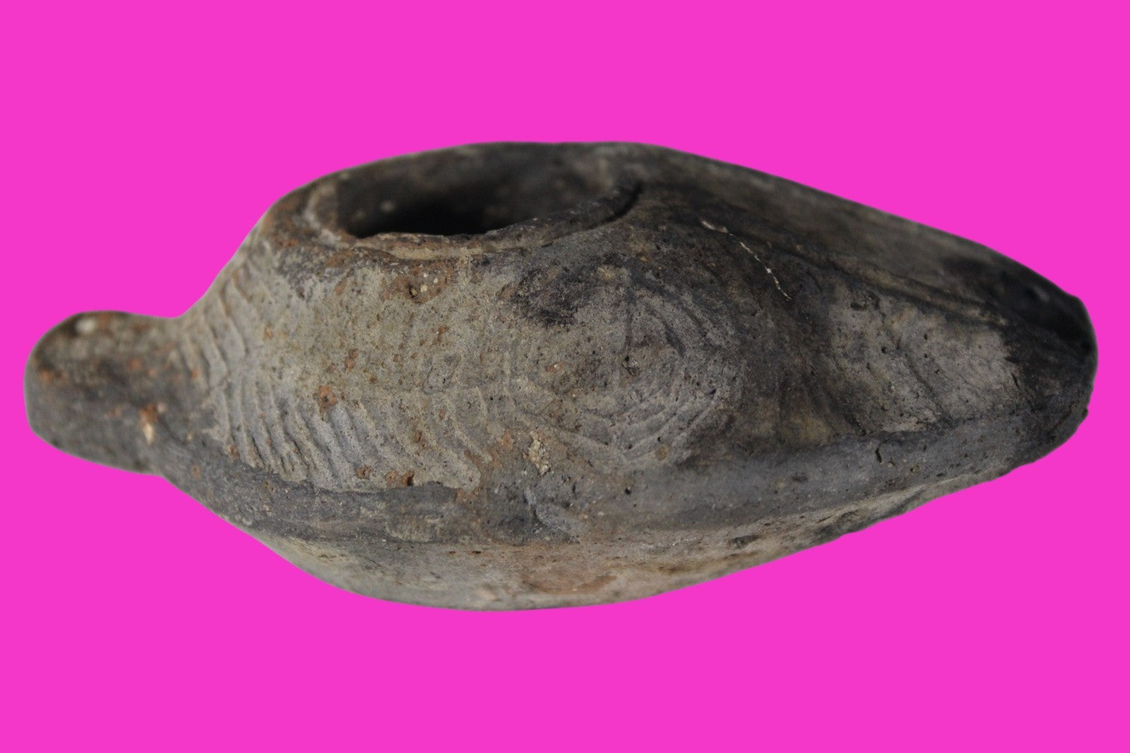 Dimensions: 3 ¾ inches long, 2 ½ inches wide, 1 ½ inches tall, weighs 84 grams. Provenance: Excavated in Judea in the late 1990’s. Ex Private Tel Aviv Collection. Acquired by the Hamadian Antiquities Gallery in The Old City of Jerusalem. Export to the United States approved by the Israeli Antiquities Authority in 2025. Acquired by The Artifact City Collection in September 2025. Description: Terracotta oil lamp made from a two-part mold. Oil from animal fat or olives were used with a wick to provide lighting. Oil lamps were mass produced in large quantities throughout the Holy Land and surrounding areas. Their use was significant in both Jewish and early Christian religious ceremonies. They were the equivalent of today’s “light bulbs”.