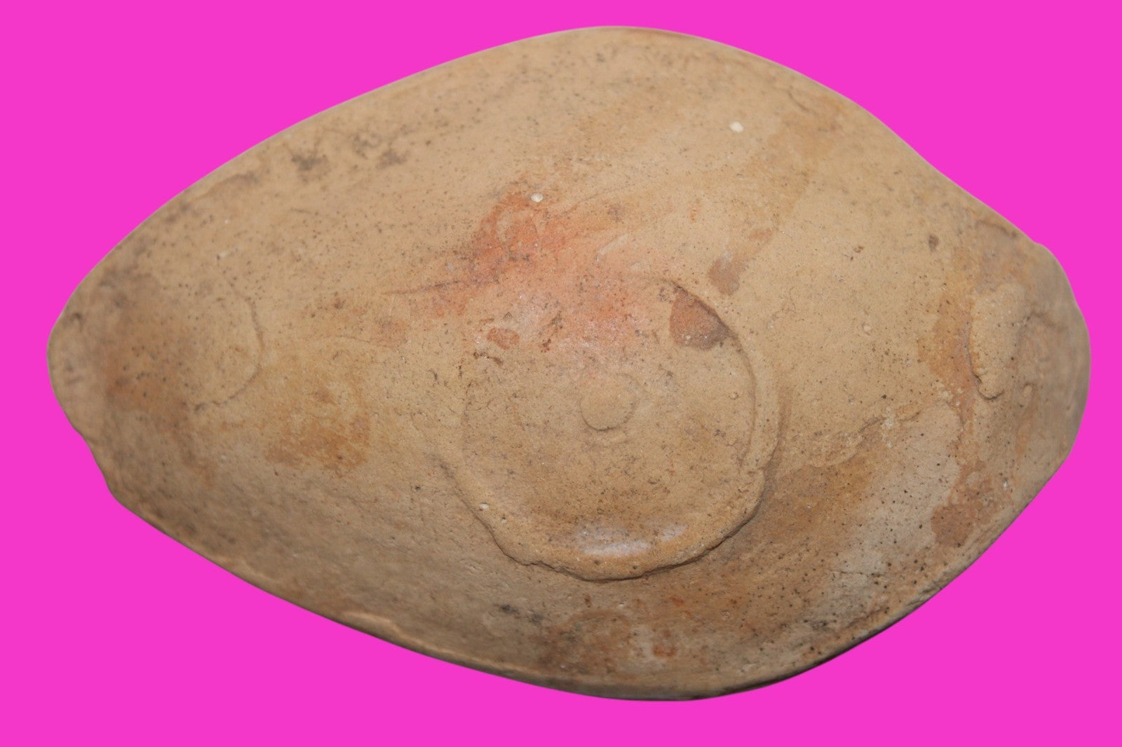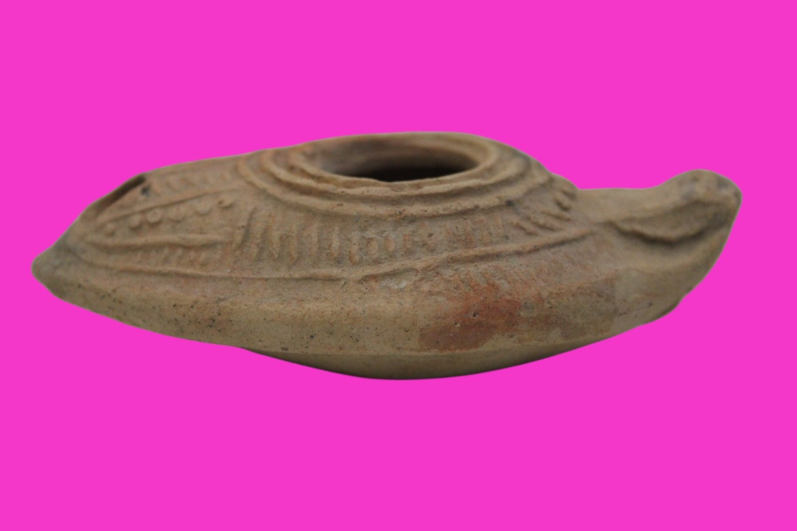 Dimensions: 3 ¾ inches long, 2 ¼ inches wide, 1 inch tall, weighs 64 grams. Provenance: Excavated in Judea in the late 1990’s. Ex Private Tel Aviv Collection. Acquired by the Hamadian Antiquities Gallery in The Old City of Jerusalem. Export to the United States approved by the Israeli Antiquities Authority in 2025. Acquired by The Artifact City Collection in September 2025. Description: Terracotta oil lamp made from a two-part mold. Oil from animal fat or olives were used with a wick to provide lighting. Oil lamps were mass produced in large quantities throughout the Holy Land and surrounding areas. Their use was significant in both Jewish and early Christian religious ceremonies. They were the equivalent of today’s “light bulbs”.