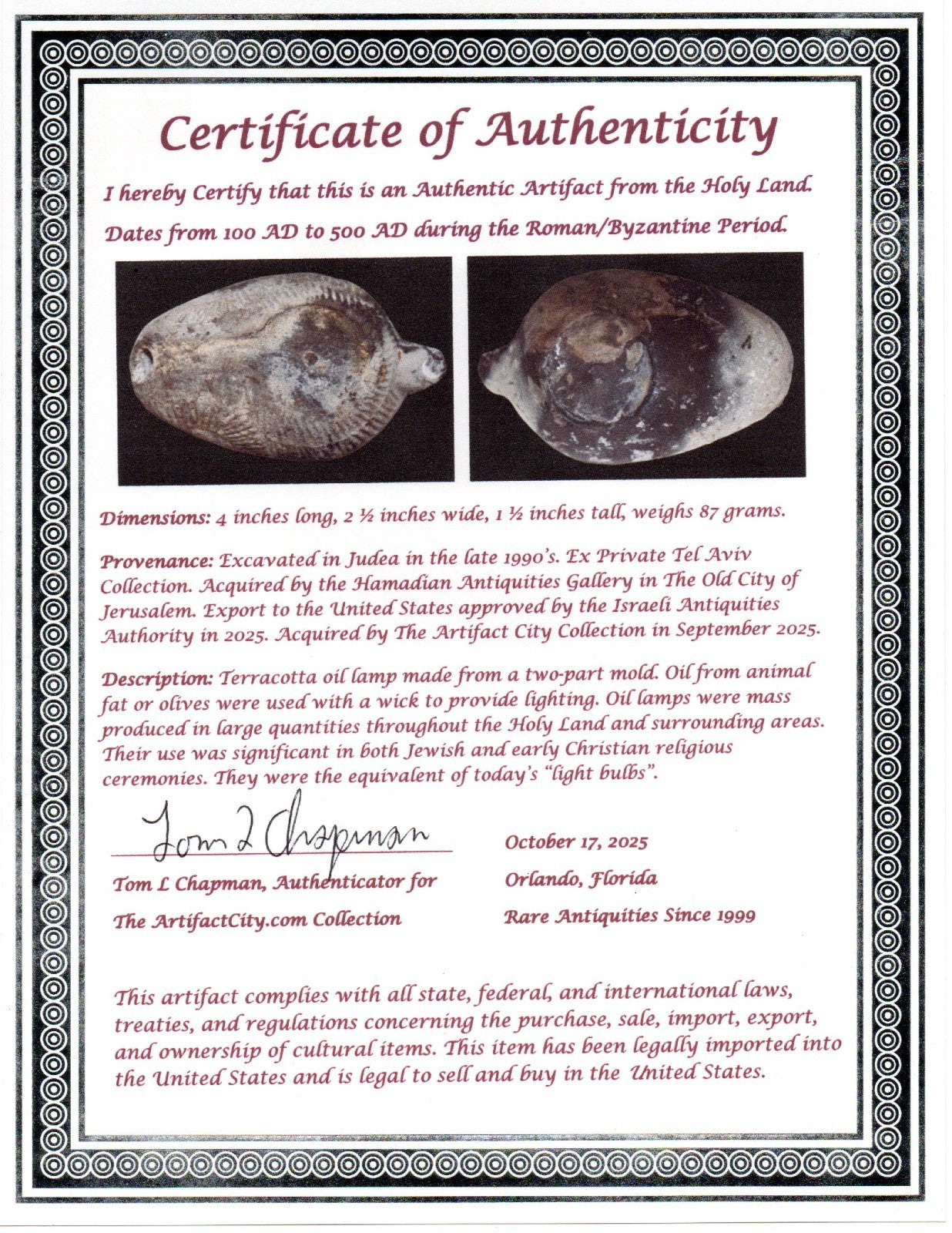Dimensions: 4 inches long, 2 ½ inches wide, 1 ½ inches tall, weighs 87 grams. Provenance: Excavated in Judea in the late 1990’s. Ex Private Tel Aviv Collection. Acquired by the Hamadian Antiquities Gallery in The Old City of Jerusalem. Export to the United States approved by the Israeli Antiquities Authority in 2025. Acquired by The Artifact City Collection in September 2025. Description: Terracotta oil lamp made from a two-part mold. Oil from animal fat or olives were used with a wick to provide lighting. Oil lamps were mass produced in large quantities throughout the Holy Land and surrounding areas. Their use was significant in both Jewish and early Christian religious ceremonies. They were the equivalent of today’s “light bulbs”.