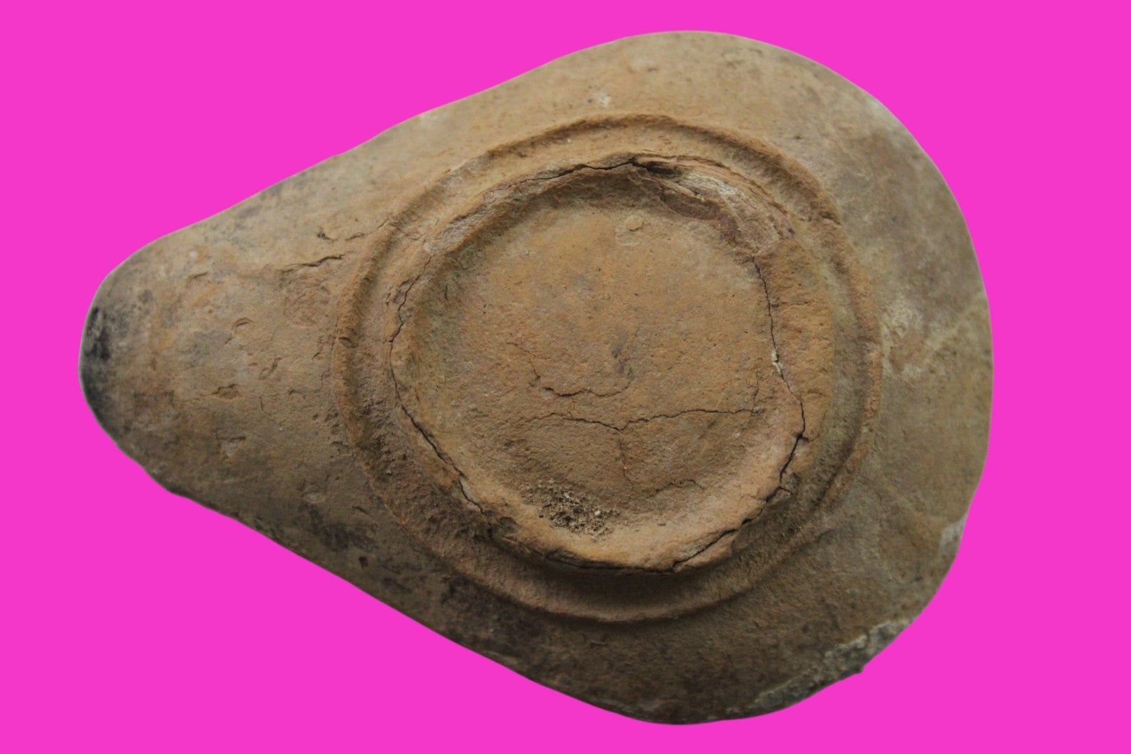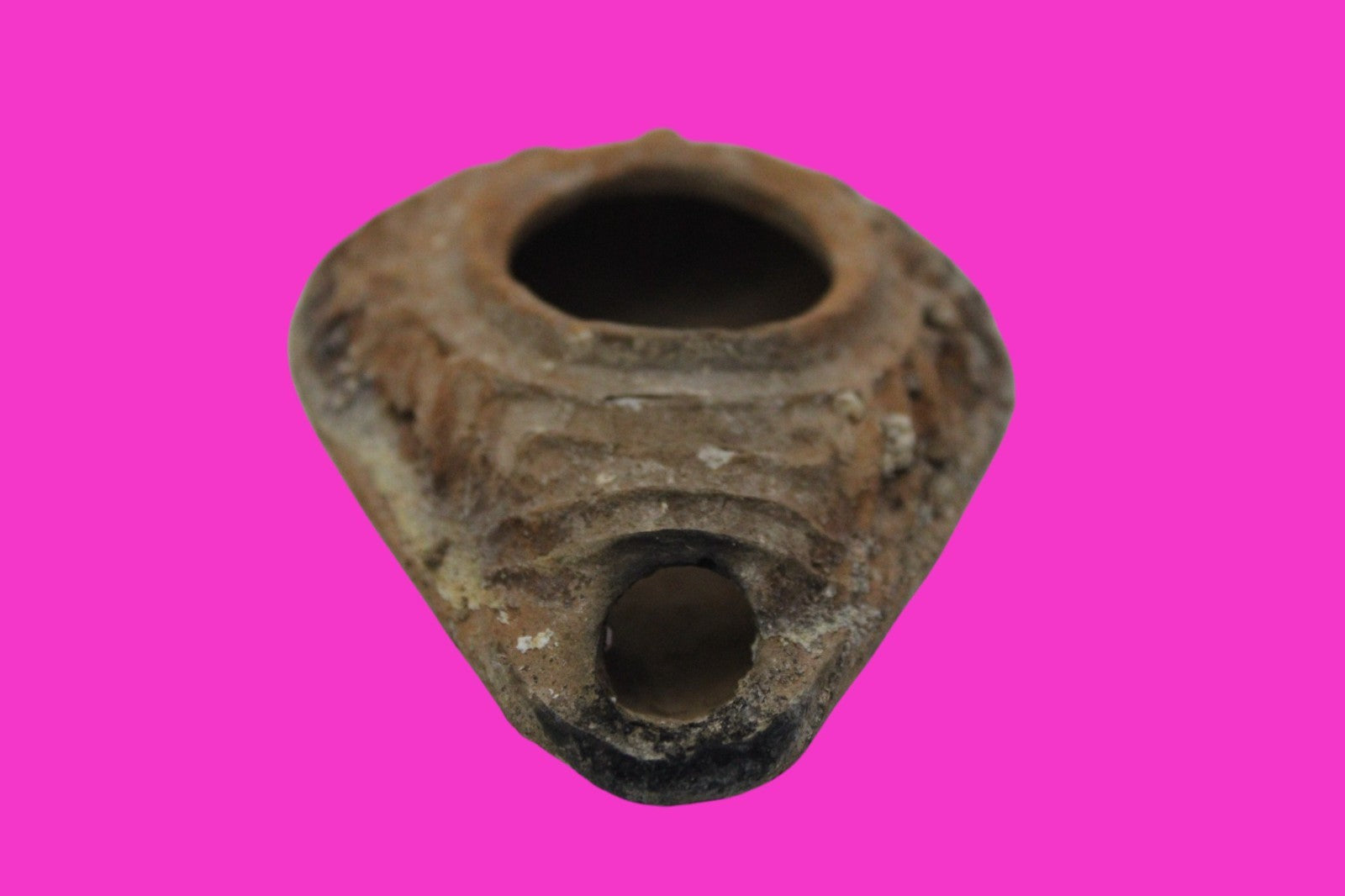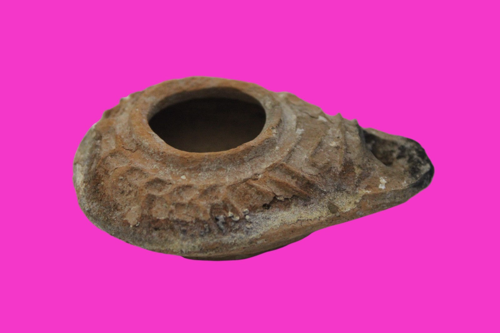 Dimensions: 3 inches long, 2 ¼ inches wide, 1 inch tall, weighs 35 grams. Provenance: Ex. Private NYC Collection, acquired in the USA Market. Ex. Palmyra Heritage Fine Art Gallery, Downtown Manhattan, New York City, 2025. Acquired by The Artifact City Collection in 2025. Description: Terracotta oil lamp made from a two-part mold. Oil from animal fat or olives were used with a wick to provide lighting. Oil lamps were mass produced in large quantities throughout the Holy Land and surrounding areas. Their use was significant in both Jewish and early Christian religious ceremonies. They were the equivalent of today’s “light bulbs”.