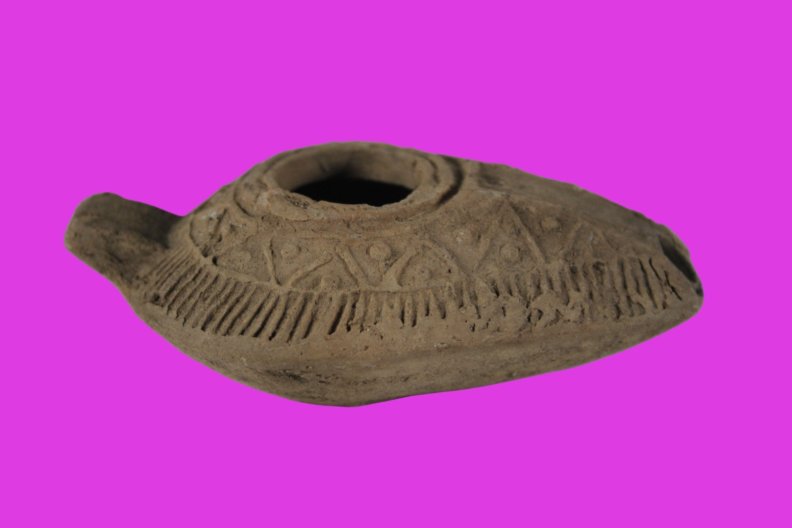 Dimensions: 3 ¾ inches long, 2 ½ inches wide, 1 ¼ inches tall, weighs 57 grams. Provenance: Ex. Private Tel Aviv collection. Collected in the 1990’s. Acquired by John McIntosh, MSE, MBA, Ancient Artifacts & Treasures, Winter Park, Florida in 2022. Acquired by The Artifact City collection in 2025. Description: Redware oil lamp made from a two-part mold. Oil from animal fat or olives were used with a wick to provide lighting. Oil lamps were mass produced in large quantities throughout the Holy Land and surrounding areas. Their use was significant in both Jewish and early Christian religious ceremonies. They were the equivalent of today’s “light bulbs”.