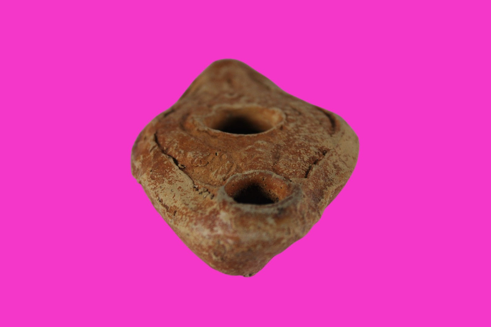 Dimensions: 3 ¾ inches long, 2 ¼ inches wide, 1 inch tall, weighs 84 grams. Provenance: Ex. Private Tel Aviv collection. Collected in the 1990’s. Acquired by John McIntosh, MSE, MBA, Ancient Artifacts & Treasures, Winter Park, Florida in 2022. Acquired by The Artifact City collection in 2025. Description: Redware oil lamp made from a two-part mold. Oil from animal fat or olives were used with a wick to provide lighting. Oil lamps were mass produced in large quantities throughout the Holy Land and surrounding areas. Their use was significant in both Jewish and early Christian religious ceremonies. They were the equivalent of today’s “light bulbs”.