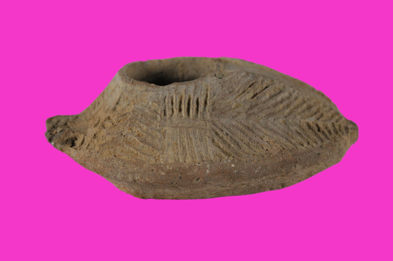 Dimensions: 4 inches long, 2 ½ inches wide, 1 ¼ inches tall, weighs 88 grams. Provenance: Ex. Private Tel Aviv collection. Collected in the 1990’s. Acquired by John McIntosh, MSE, MBA, Ancient Artifacts & Treasures, Winter Park, Florida in 2022. Acquired by The Artifact City collection in 2025. Description: Redware oil lamp made from a two-part mold. Oil from animal fat or olives were used with a wick to provide lighting. Oil lamps were mass produced in large quantities throughout the Holy Land and surrounding areas. Their use was significant in both Jewish and early Christian religious ceremonies. They were the equivalent of today’s “light bulbs”.