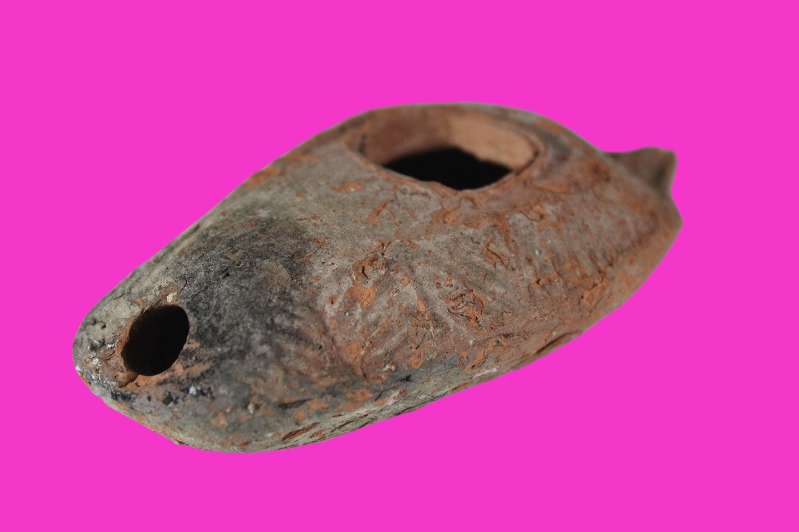 Dimensions: 4 inches long, 2 ¼ inches wide, 1 ¼ inches tall, weighs 66 grams. Provenance: Excavated in Judea in the late 1990’s. Ex Private Tel Aviv Collection. Acquired by the Hamadian Antiquities Gallery in The Old City of Jerusalem. Export to the United States approved by the Israeli Antiquities Authority in 2025. Acquired by The Artifact City Collection in September 2025. Description: Terracotta oil lamp made from a two-part mold. Oil from animal fat or olives was used with a wick to provide lighting. Oil lamps were mass produced in large quantities throughout the Holy Land and surrounding areas. Their use was significant in both Jewish and early Christian religious ceremonies. They were the equivalent of today’s “light bulbs”.