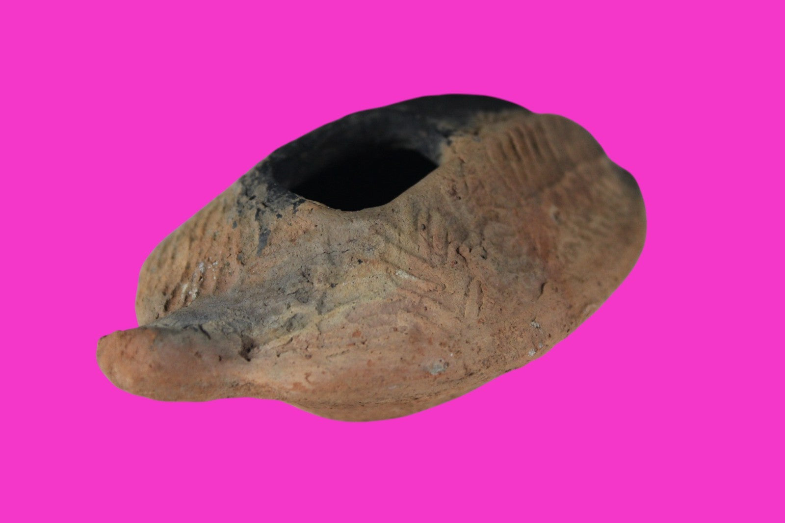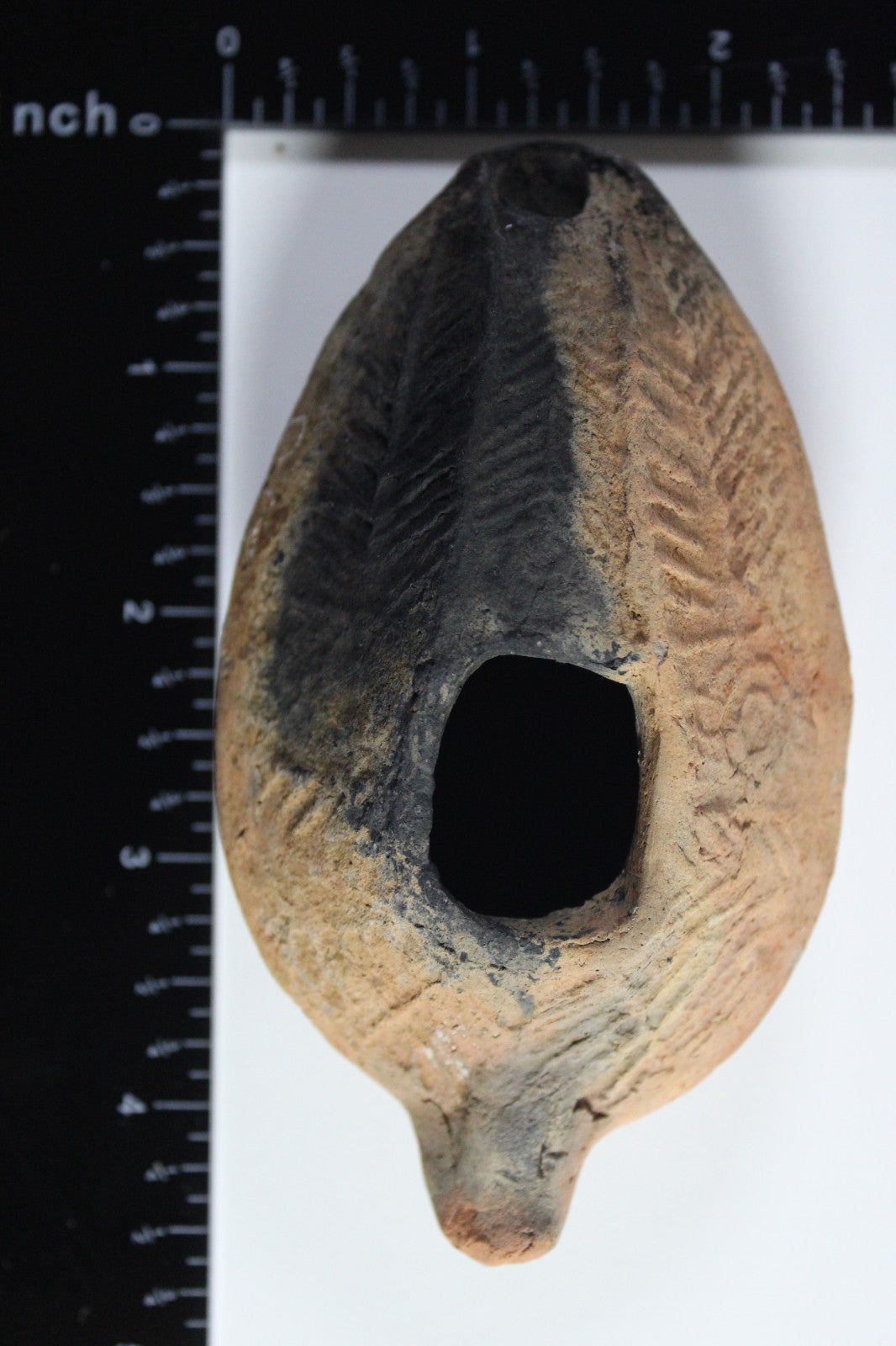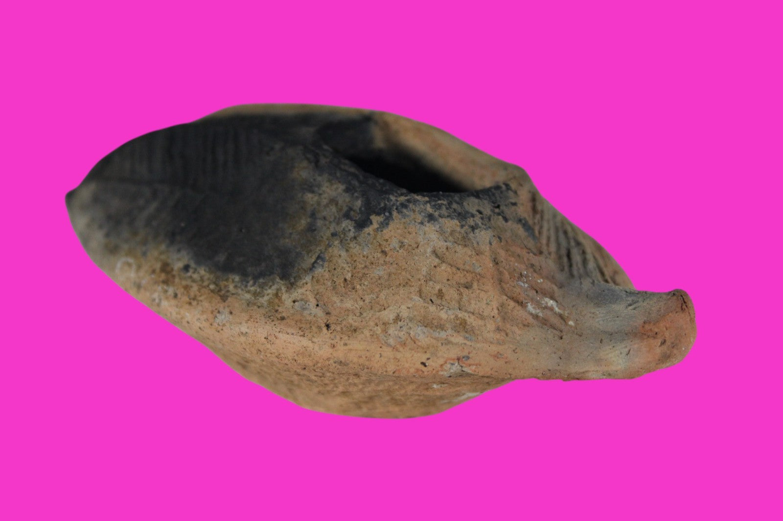 Dimensions: 4 ¼ inches long, 2 ½ inches wide, 1 ½ inches tall, weighs 84 grams. Provenance: Excavated in Judea in the late 1990’s. Ex Private Tel Aviv Collection. Acquired by the Hamadian Antiquities Gallery in The Old City of Jerusalem. Export to the United States approved by the Israeli Antiquities Authority in 2025. Acquired by The Artifact City Collection in September 2025. Description: Terracotta oil lamp made from a two-part mold. Oil from animal fat or olives was used with a wick to provide lighting. Oil lamps were mass produced in large quantities throughout the Holy Land and surrounding areas. Their use was significant in both Jewish and early Christian religious ceremonies. They were the equivalent of today’s “light bulbs”.