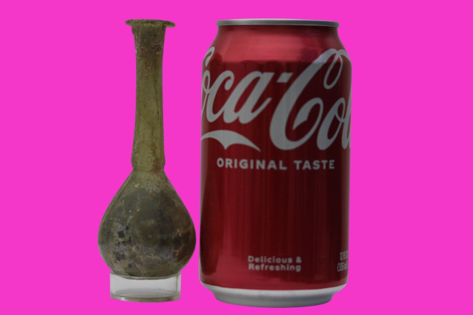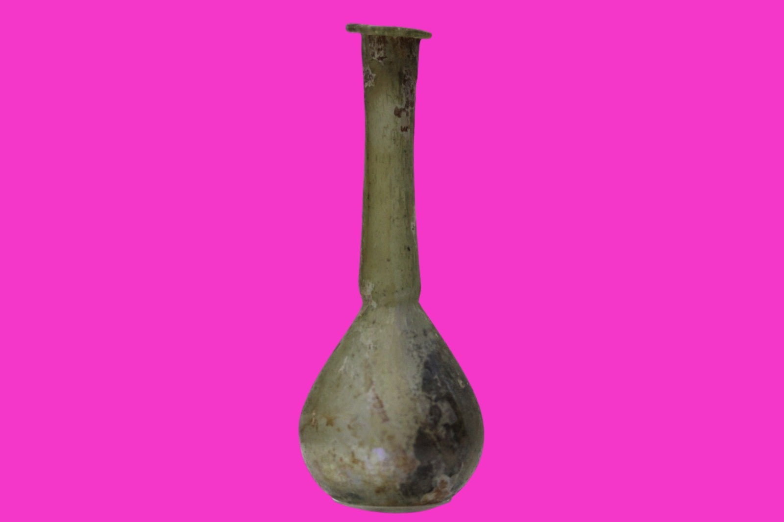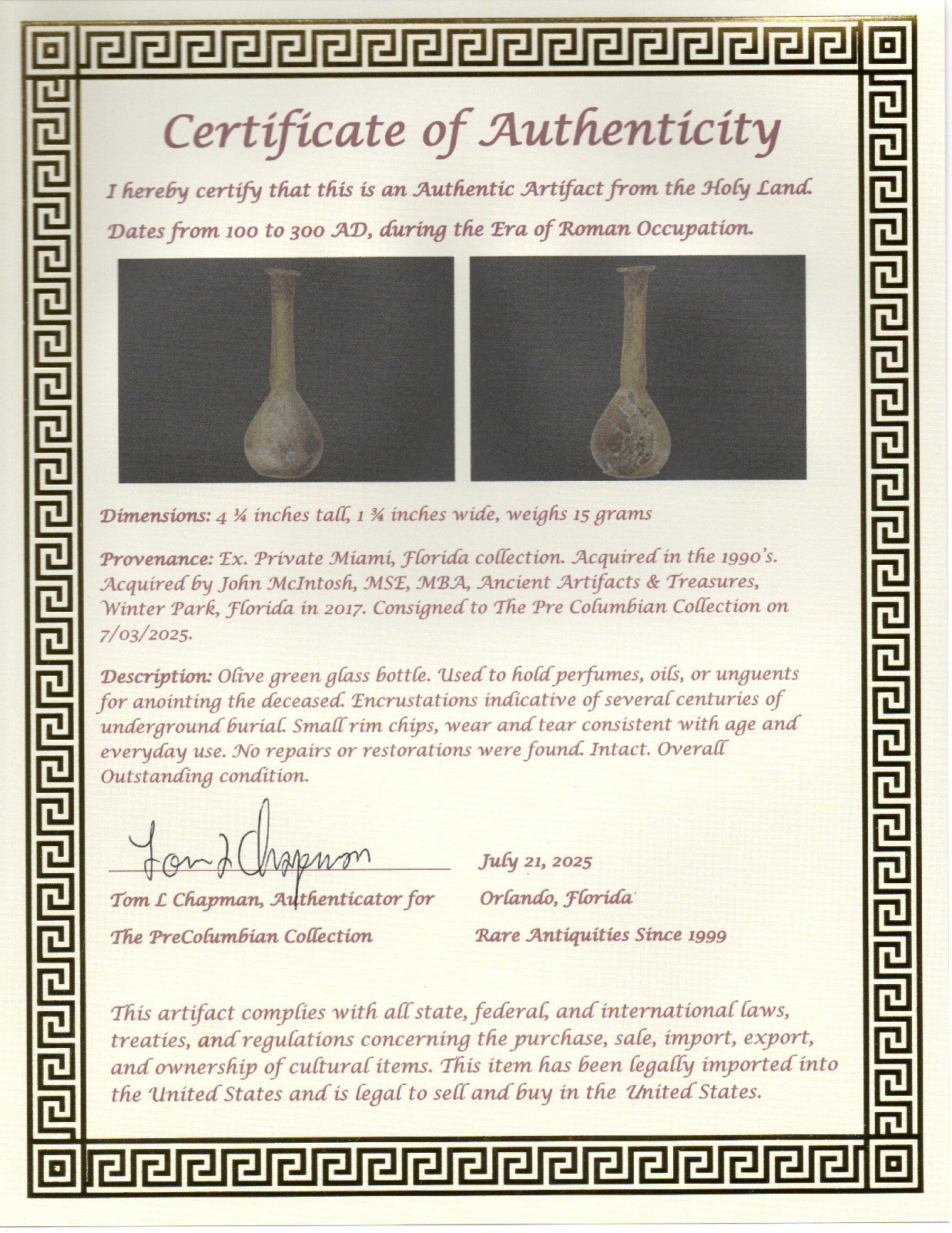 Dimensions: 4 ¼ inches tall, 1 ¾ inches wide, weighs 15 gramsProvenance: Ex. Private Miami, Florida collection. Acquired in the 1990’s. Acquired by John McIntosh, MSE, MBA, Ancient Artifacts & Treasures, Winter Park, Florida in 2017. Consigned to The Pre Columbian Collection on 7/03/2025.Description: Olive green glass bottle. Used to hold perfumes, oils, or unguents for anointing the deceased. Encrustations indicative of several centuries of underground burial. Small rim chips, wear and tear consistent with age and everyday use. No repairs or restorations were found. Intact. Overall Outstanding condition.