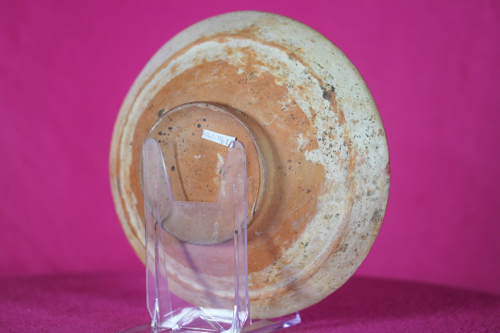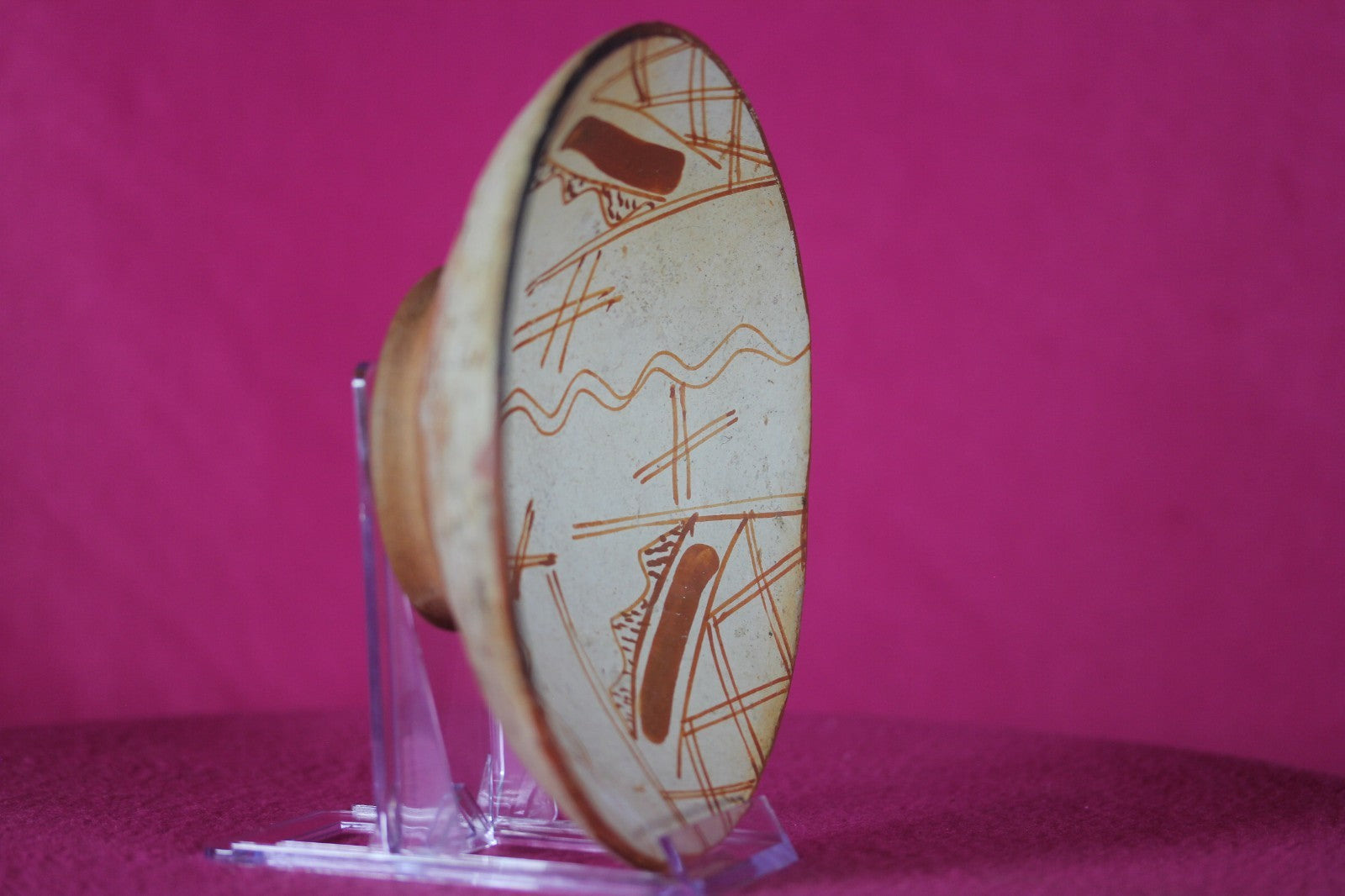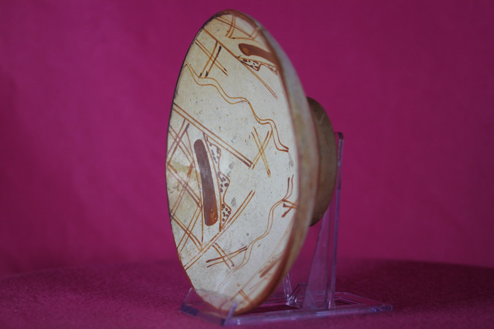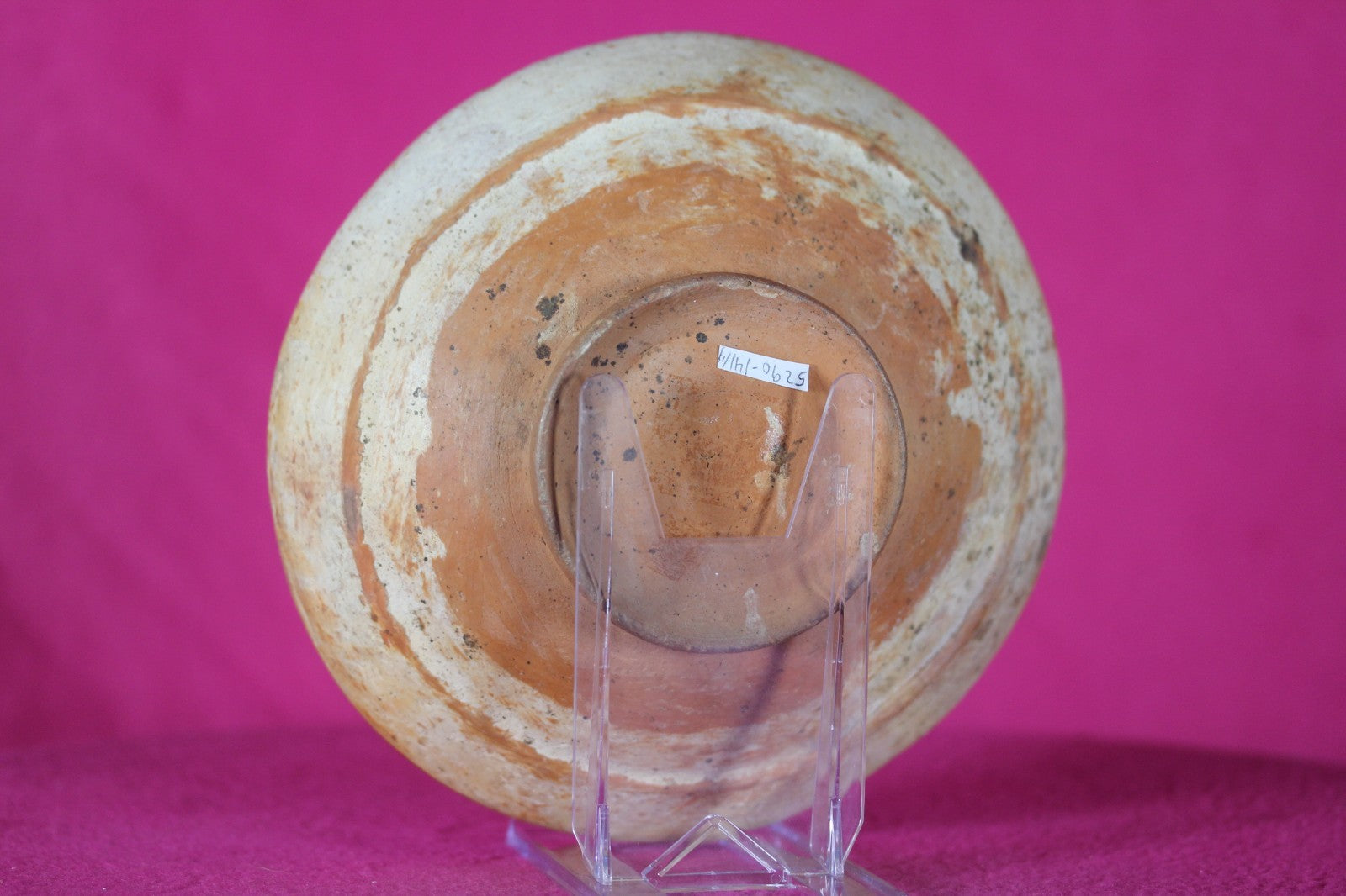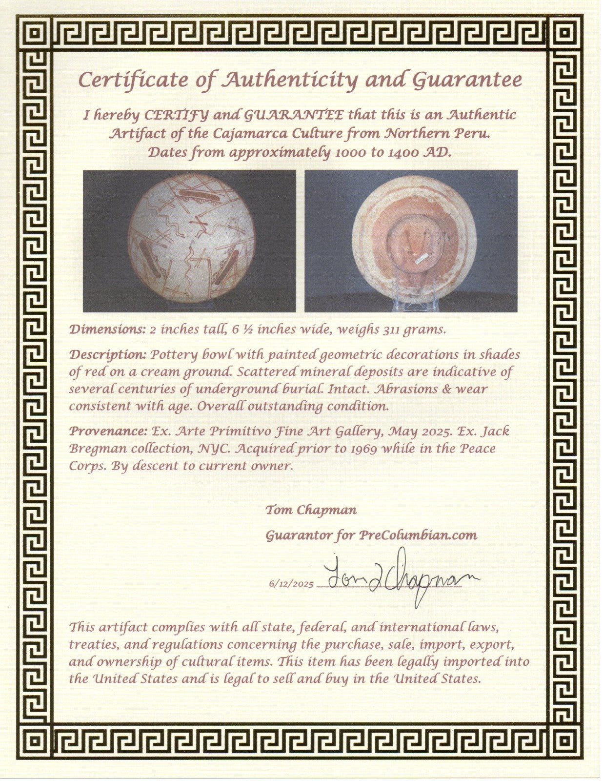 Dimensions: 2 inches tall, 6 ½ inches wide, weighs 311 grams.Description: Pottery bowl with painted geometric decorations in shades of red on a cream ground. Scattered mineral deposits are indicative of several centuries of underground burial. Intact. Abrasions & wear consistent with age. Overall outstanding condition.Provenance: Ex. Arte Primitivo Fine Art Gallery, May 2025. Ex. Jack Bregman collection, NYC. Acquired prior to 1969 while in the Peace Corps. By descent to current owner.
