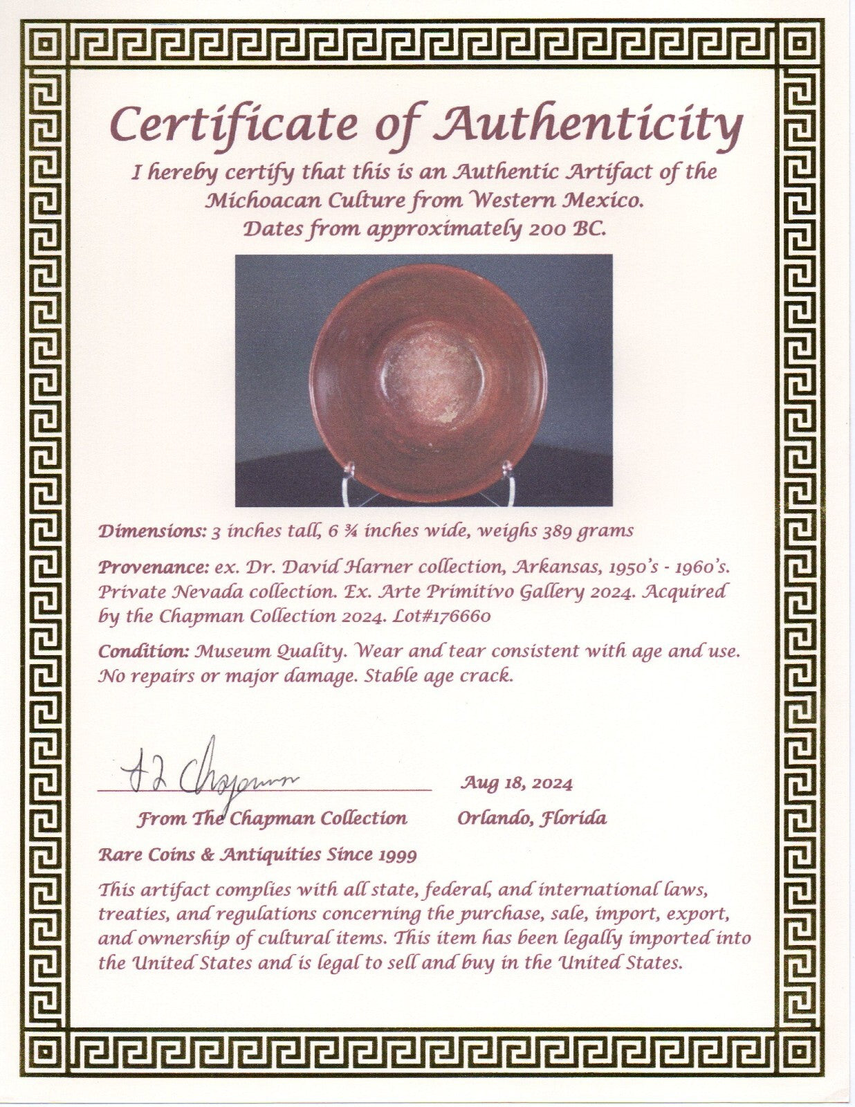 Authentic Pre Columbian Artifact Decorated Bowl Michoacan Arte Primitivo COA T49
