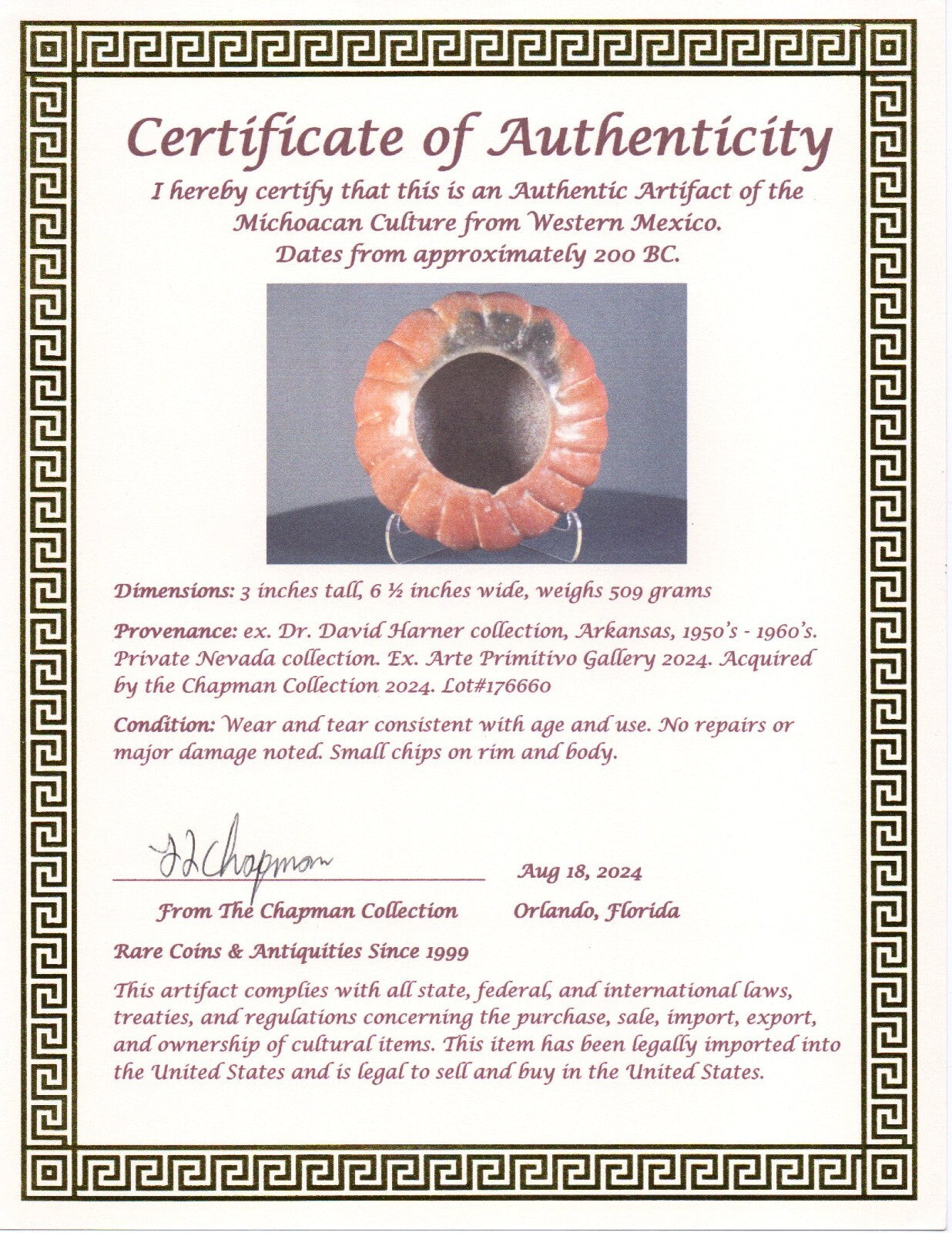 Museum Quality. Acquired from the world renowned Arte Primitivo Gallery in Downtown Manhattan, New York City. This is the most prestigious gallery of ancient artifacts in the United States. Artifacts from Arte Primitivo are the most sought after in the world. They are instantly recognized and respected by antiquities dealers and collectors alike as being the best of the best. Artifacts that are authenticated by Arte Primitivo instantly increase in value due to their expertise and decades of experience. They are the go to experts when it comes to ancient art. See COA for full condition of this item.