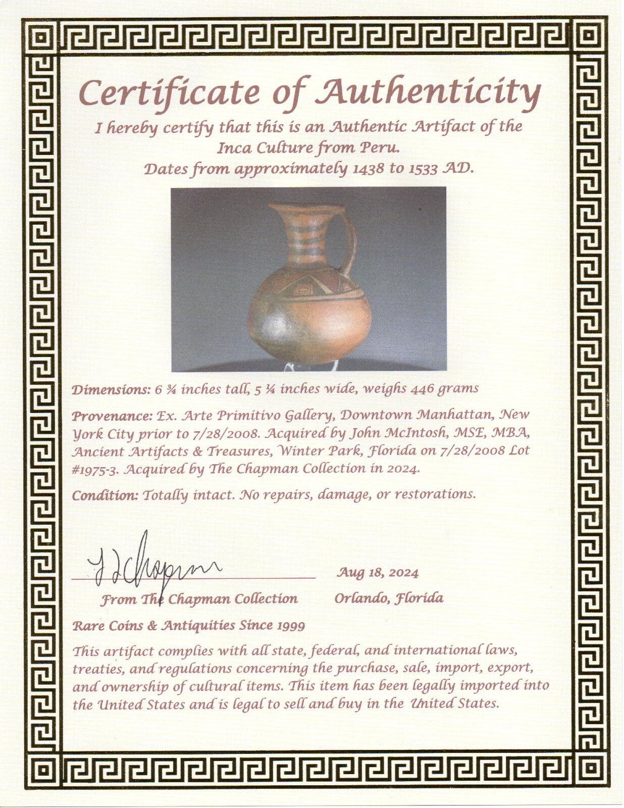 Pre Columbian Authentic Artifact Inca Pitcher Pottery 1438-1533 AD Peru COA J06