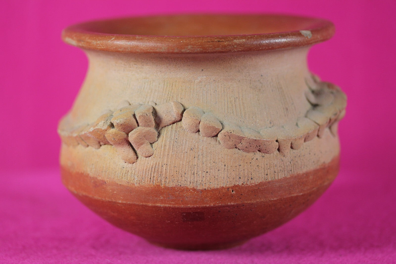 Rare Museum Quality orange and tan vessel decorated in relief with three long tailed lizards. Minor rim flake, otherwise intact.