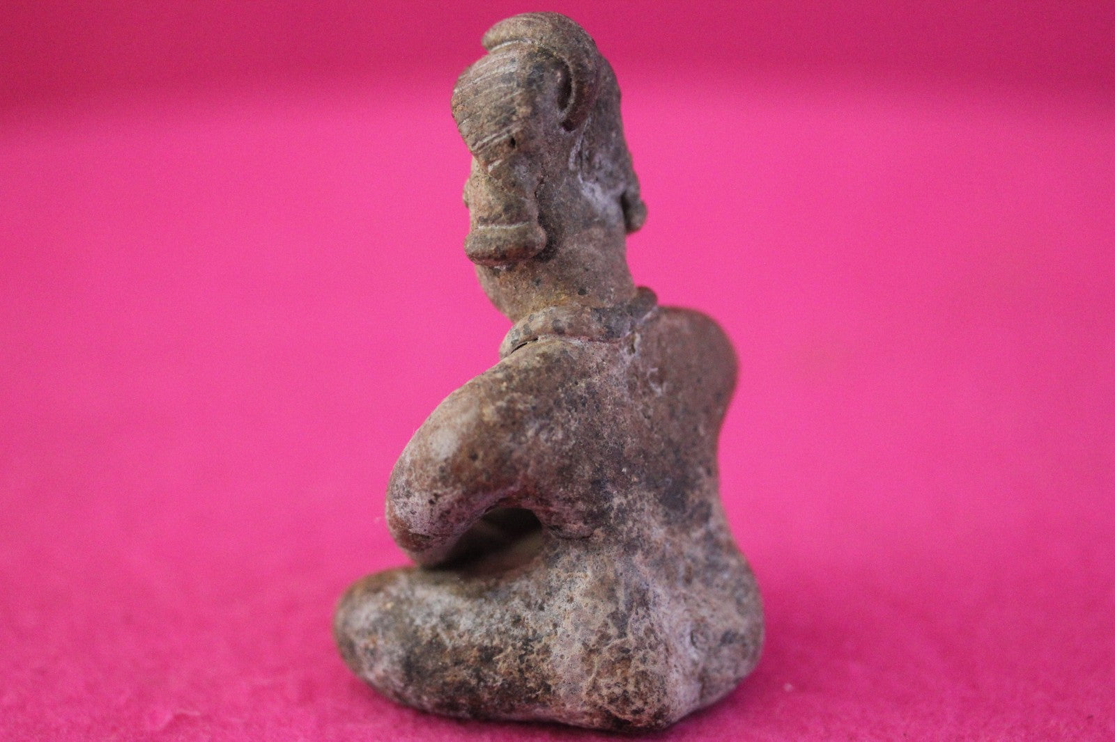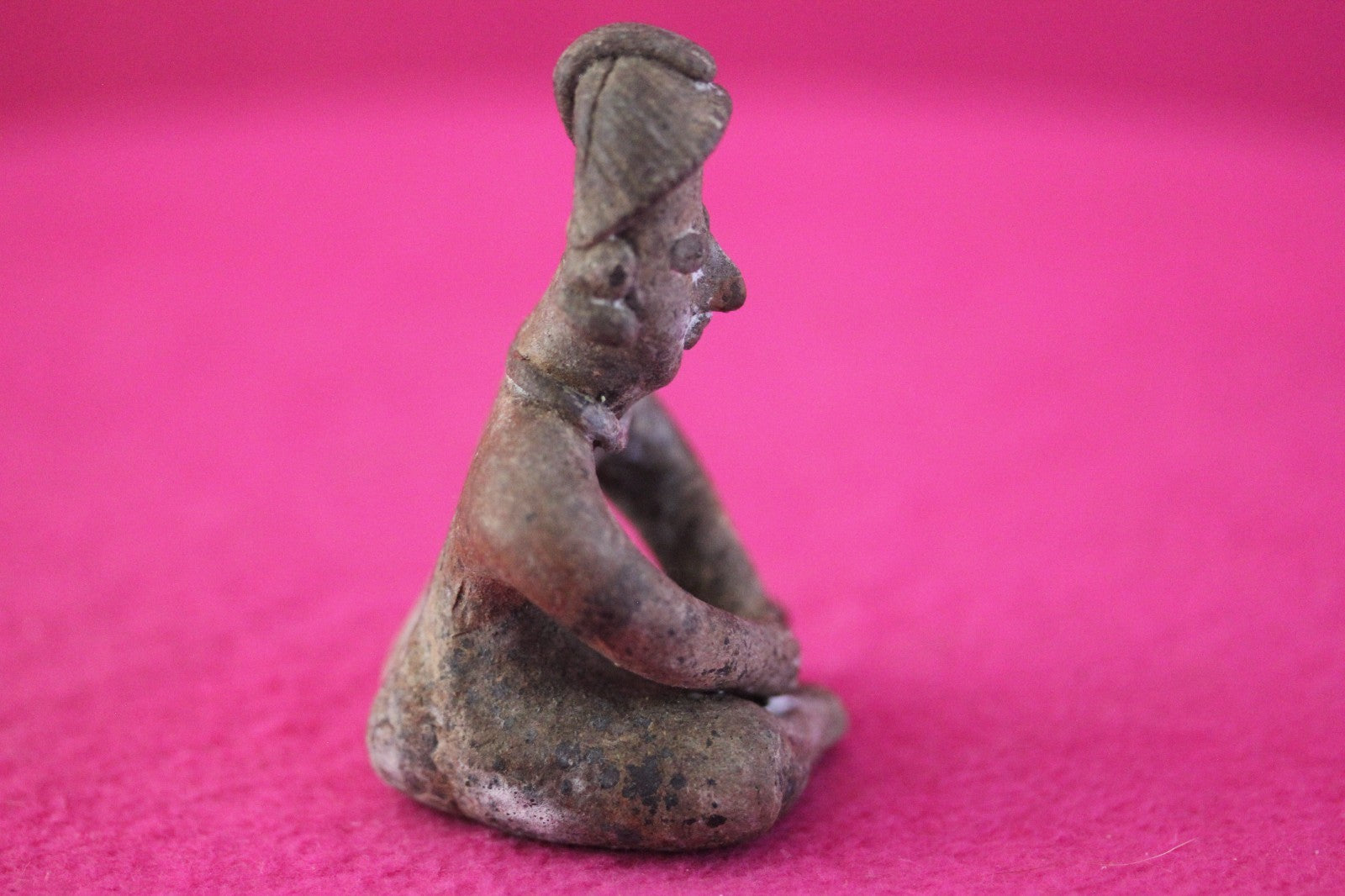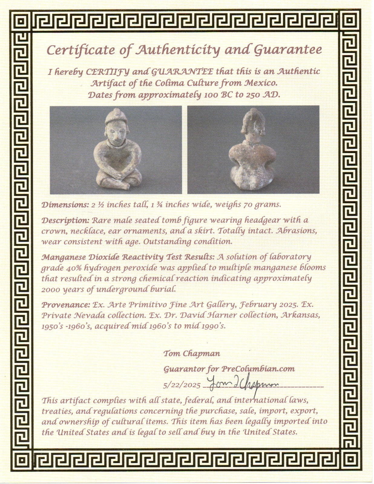 Dimensions: 2 ½ inches tall, 1 ¾ inches wide, weighs 70 grams.Description: Rare male seated tomb figure wearing headgear with a crown, necklace, ear ornaments, and a skirt. Totally intact. Abrasions, wear consistent with age. Outstanding condition.Manganese Dioxide Reactivity Test Results: A solution of laboratory grade 40% hydrogen peroxide was applied to multiple manganese blooms that resulted in a strong chemical reaction indicating approximately 2000 years of underground burial.Provenance: Ex. Arte Primitivo Fine Art Gallery, February 2025. Ex. Private Nevada collection. Ex. Dr. David Harner collection, Arkansas, 1950’s -1960’s, acquired mid 1960’s to mid 1990’s.