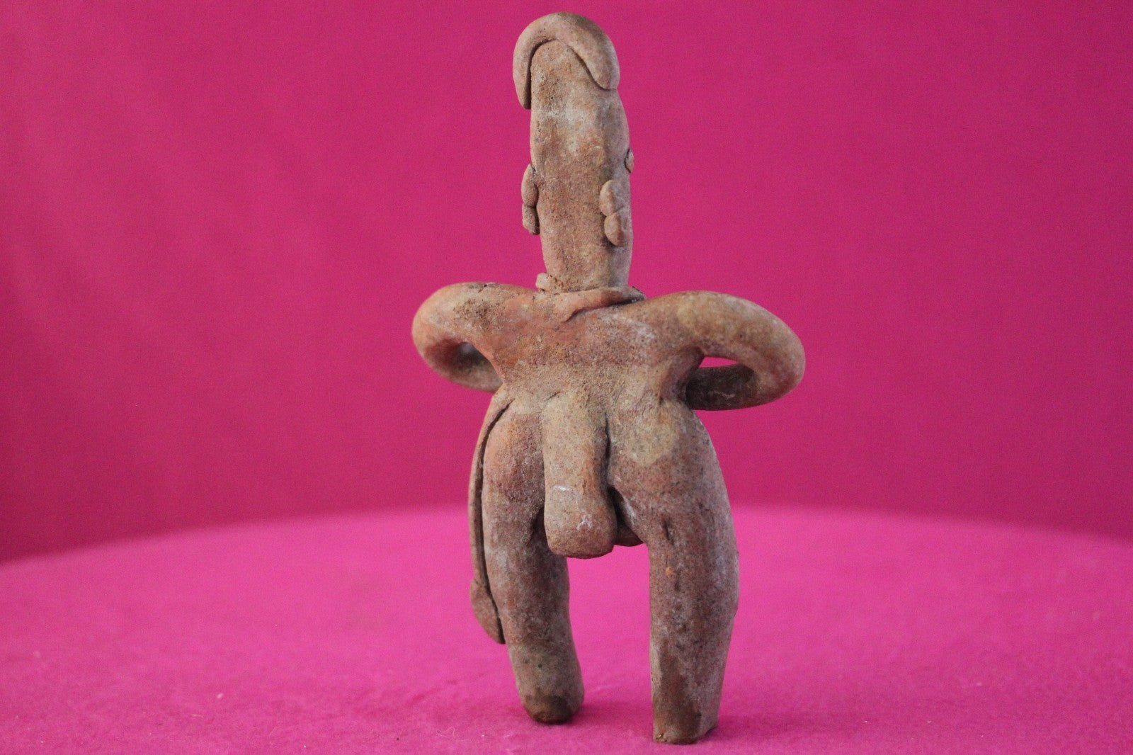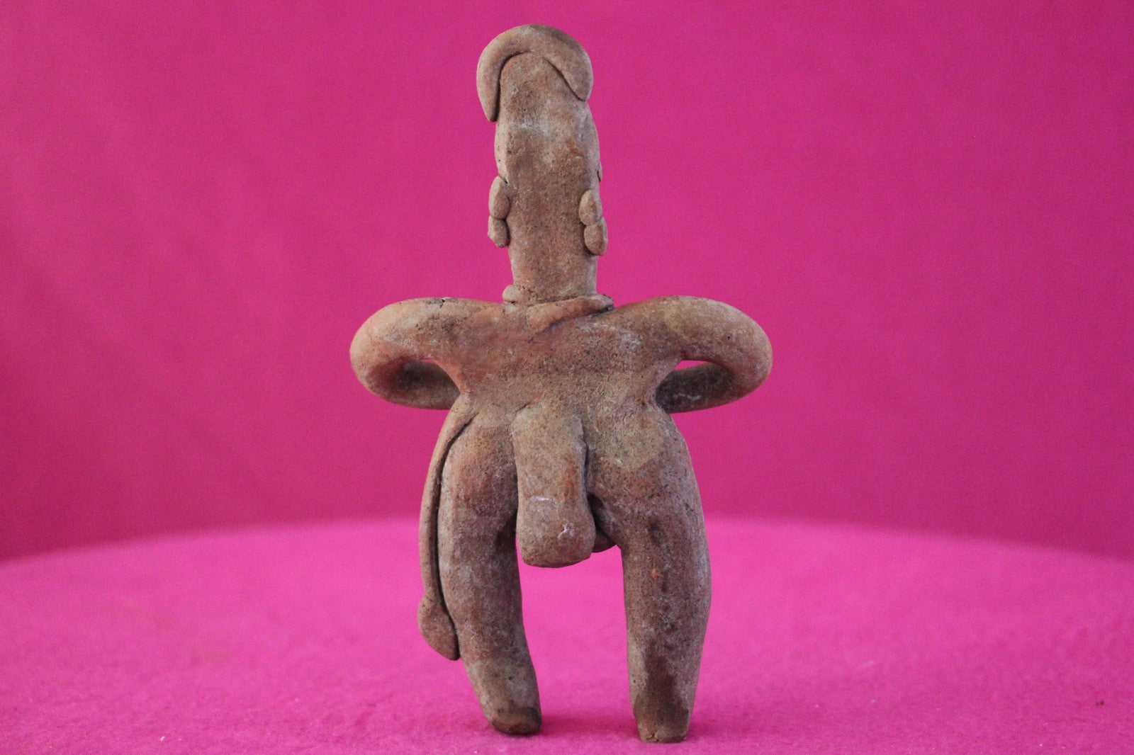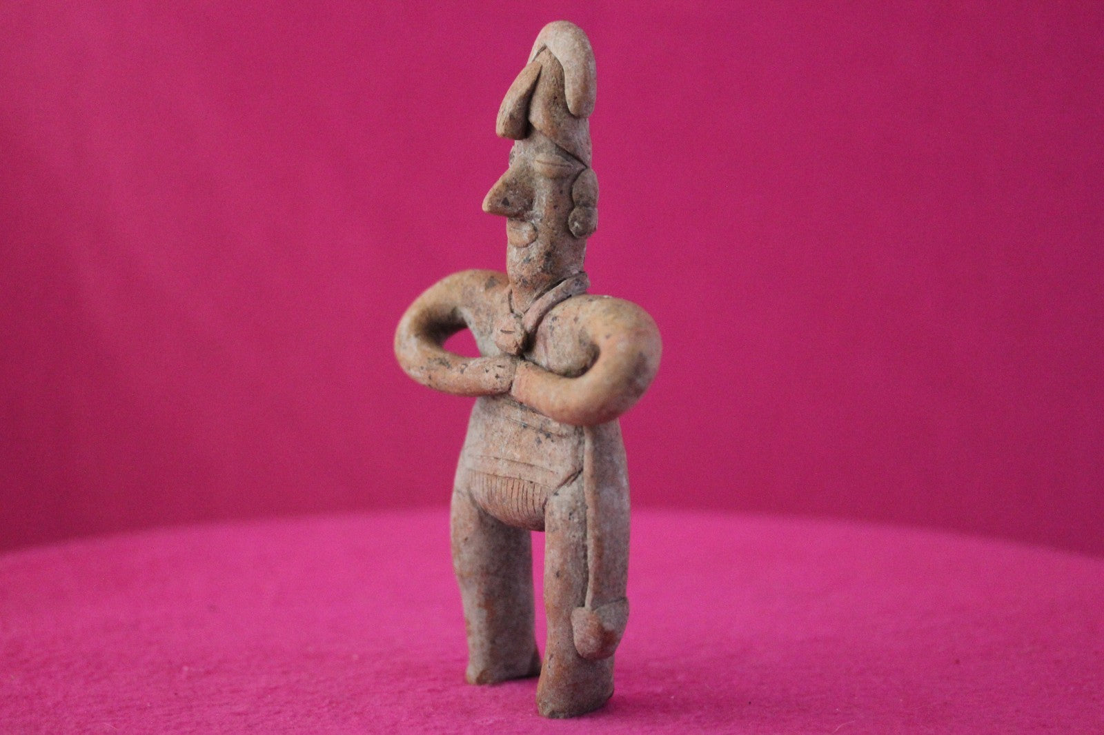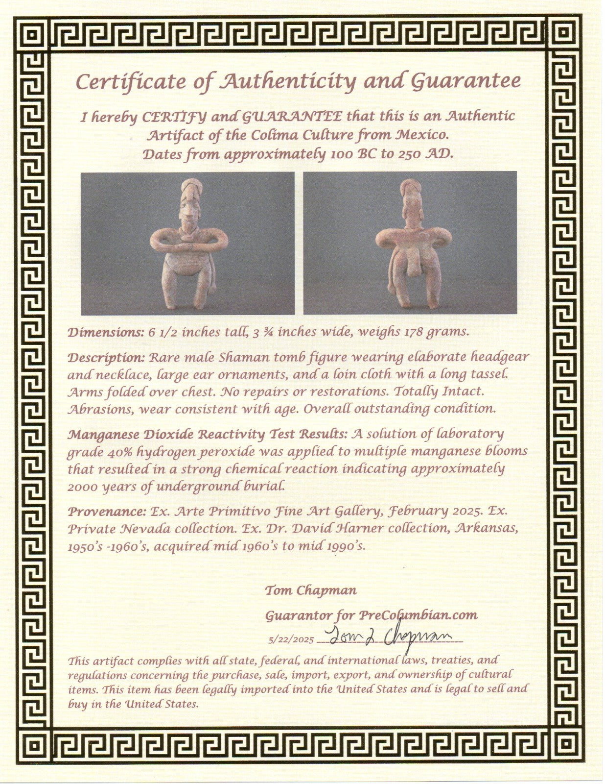 Dimensions: 6 1/2 inches tall, 3 ¾ inches wide, weighs 178 grams.Description: Rare male Shaman tomb figure wearing elaborate headgear and necklace, large ear ornaments, and a loin cloth with a long tassel. Arms folded over chest. No repairs or restorations. Totally Intact. Abrasions, wear consistent with age. Overall outstanding condition.Manganese Dioxide Reactivity Test Results: A solution of laboratory grade 40% hydrogen peroxide was applied to multiple manganese blooms that resulted in a strong chemical reaction indicating approximately 2000 years of underground burial.Provenance: Ex. Arte Primitivo Fine Art Gallery, February 2025. Ex. Private Nevada collection. Ex. Dr. David Harner collection, Arkansas, 1950’s -1960’s, acquired mid 1960’s to mid 1990’s.