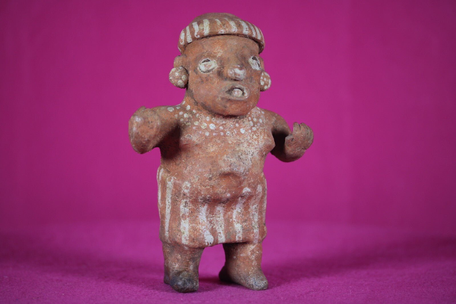 Excellant Condition. Orangeware standing female figure, wearing a knee length skirt, headband, disc ear ornaments and nose ring. Painted white details. Scattered areas of surface deposits. Missing thumb on left hand, right leg restored.