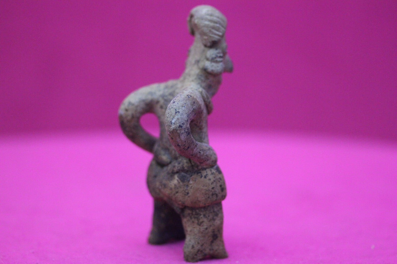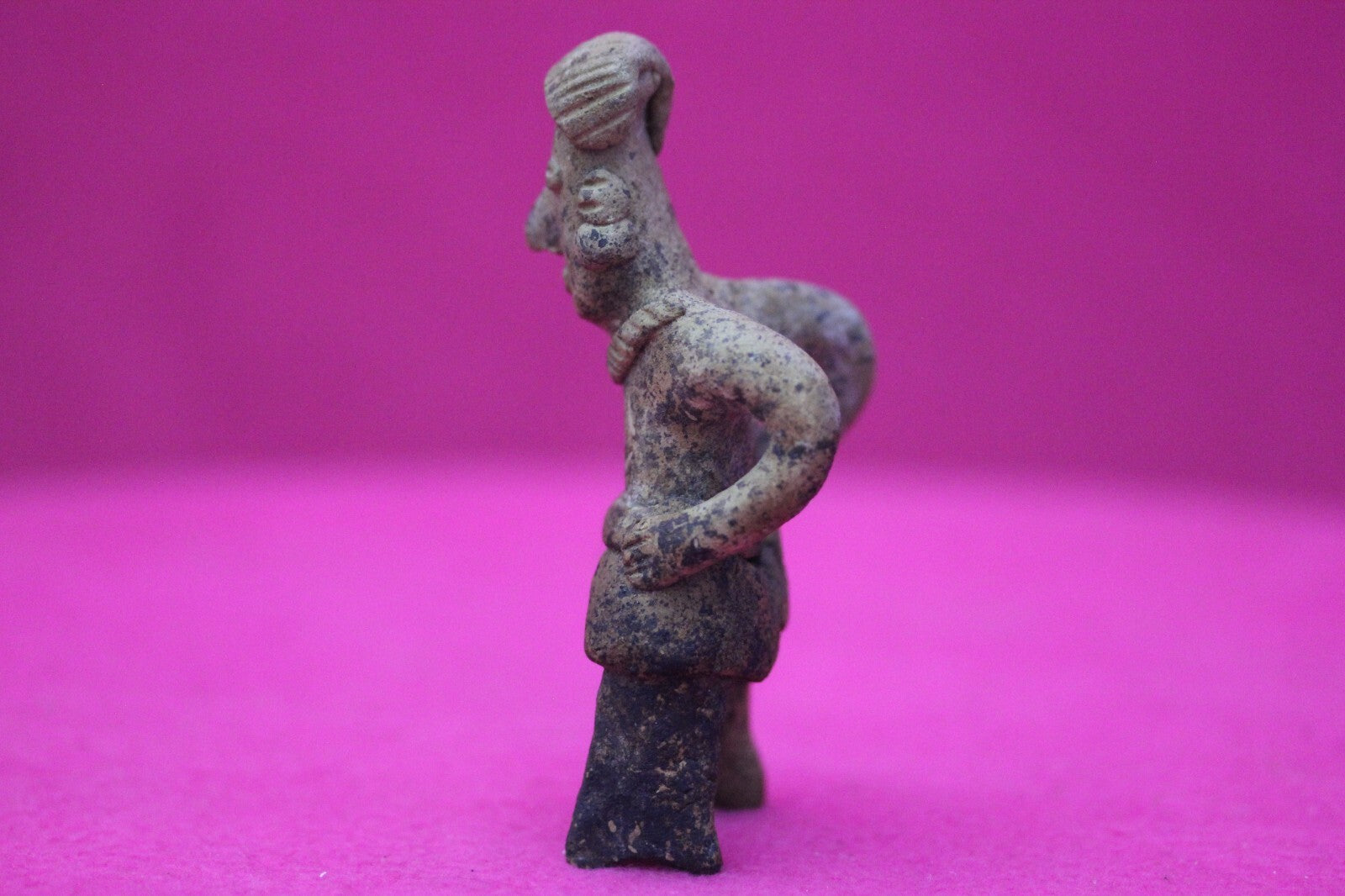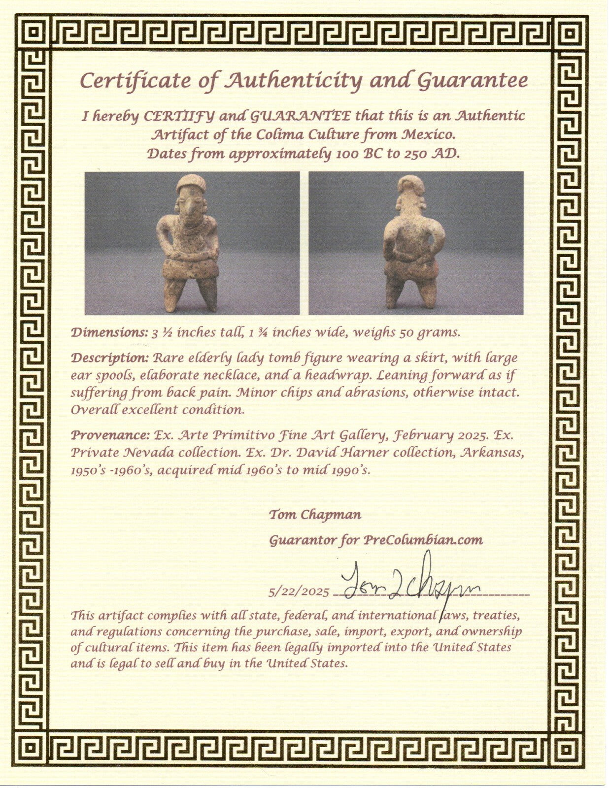 Dimensions: 3 ½ inches tall, 1 ¾ inches wide, weighs 50 grams.Description: Rare elderly lady tomb figure wearing a skirt, with large ear spools, elaborate necklace, and a headwrap. Leaning forward as if suffering from back pain. Minor chips and abrasions, otherwise intact. Overall excellent condition.