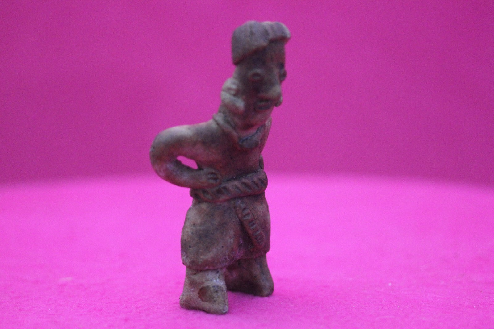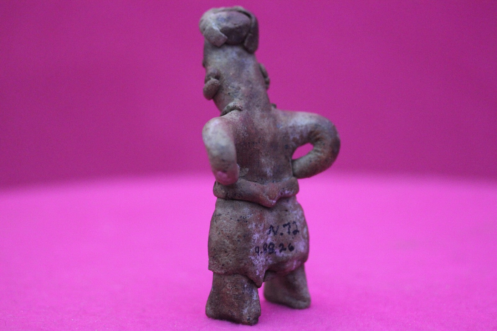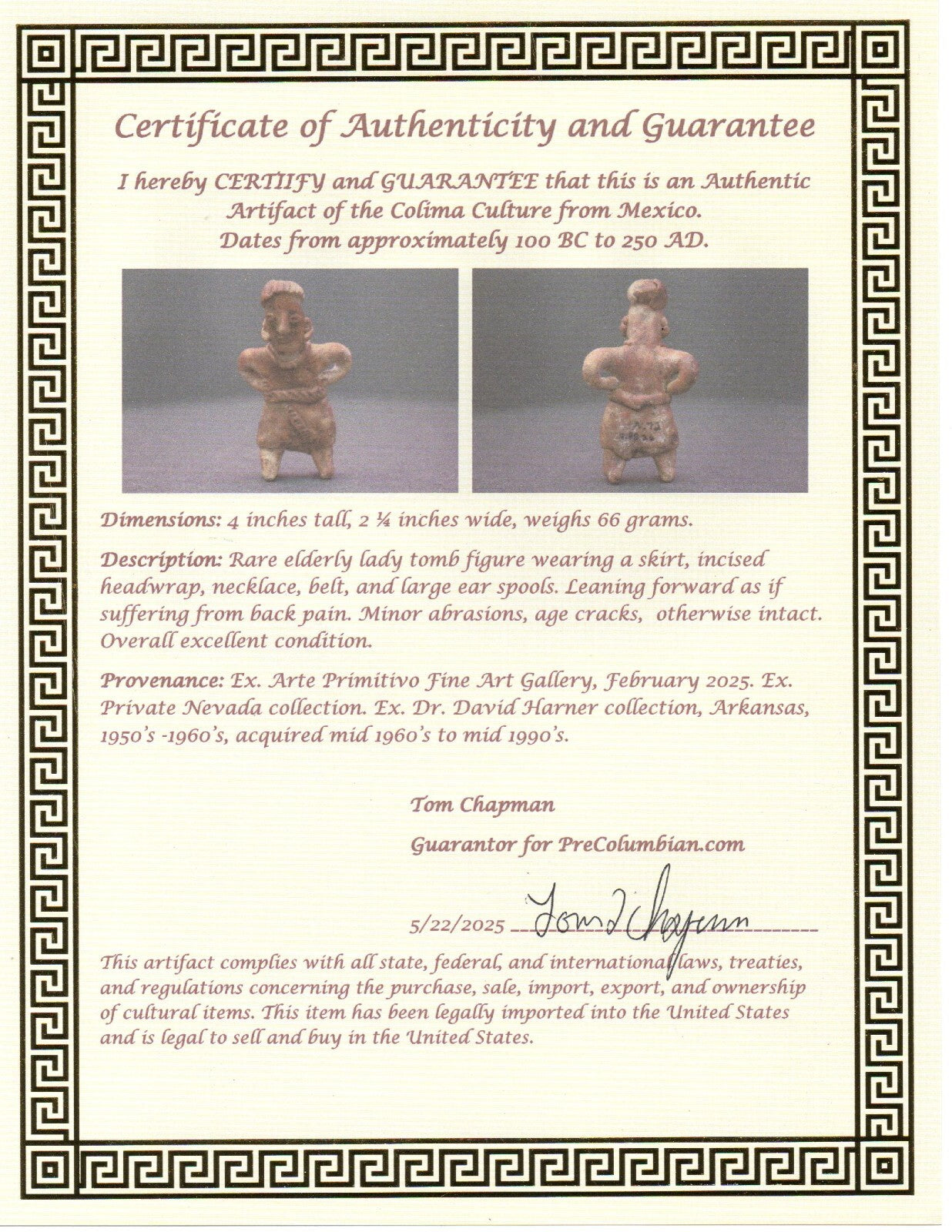 Dimensions: 4 inches tall, 2 ¼ inches wide, weighs 66 grams.Description: Rare elderly lady tomb figure wearing a skirt, incised headwrap, necklace, belt, and large ear spools. Leaning forward as if suffering from back pain. Minor abrasions, age cracks, otherwise intact. Overall excellent condition.Provenance: Ex. Arte Primitivo Fine Art Gallery, February 2025. Ex. Private Nevada collection. Ex. Dr. David Harner collection, Arkansas, 1950’s -1960’s, acquired mid 1960’s to mid 1990’s.
