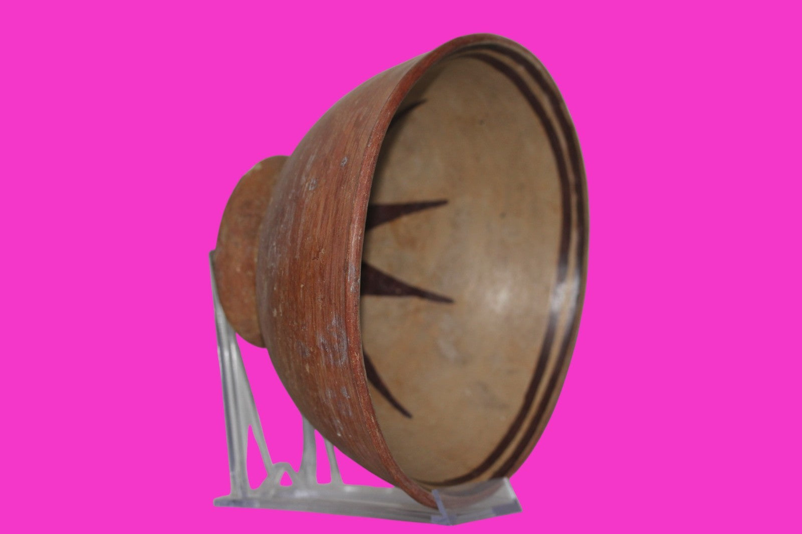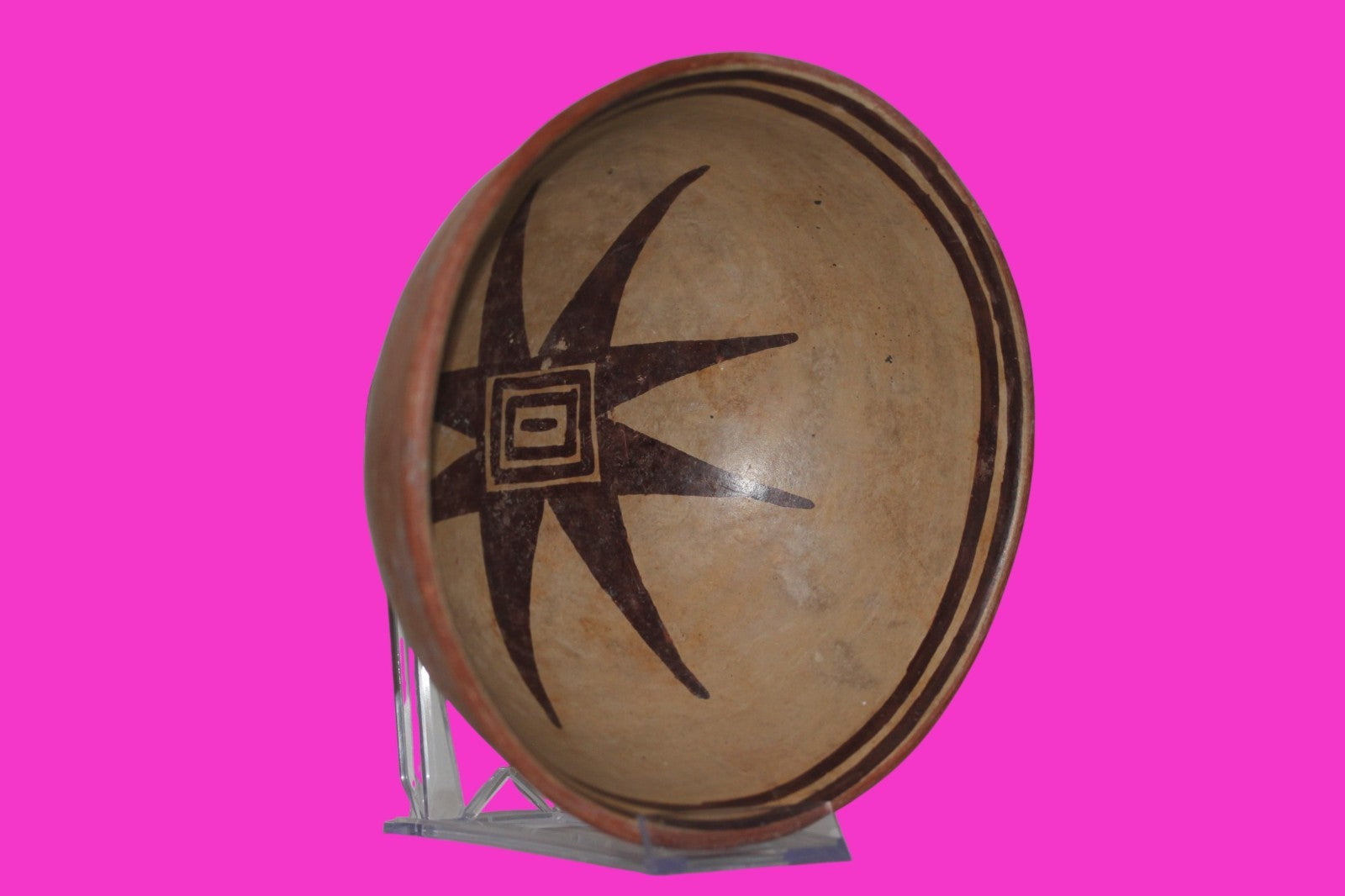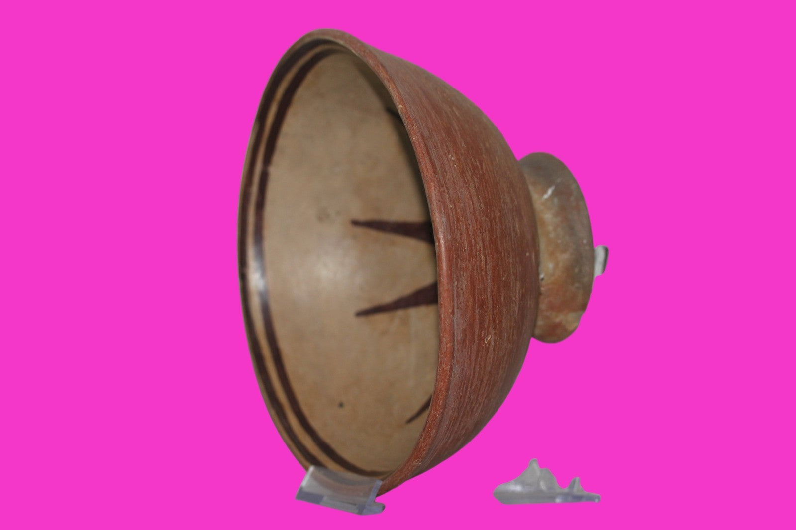 Dimensions: 3 ¾ inches tall, 7 ¼ inches wide, weighs 511 grams Description: Redware pedestal bowl with a cream interior slip decorated with brown geometric shapes including an 8-pointed star. Small rim chips, paint wear consistent with age and everyday use, otherwise intact. No repairs or restorations were found. Overall Outstanding condition. Provenance: Ex. Arte Xibalba, Acquired by John McIntosh, MSE, MBA, Ancient Artifacts & Treasures, Winter Park, Florida on 7/20/2020. Consigned to The Artifact City Collection on 7/03/2025.