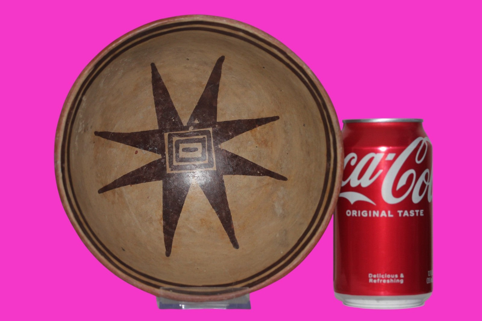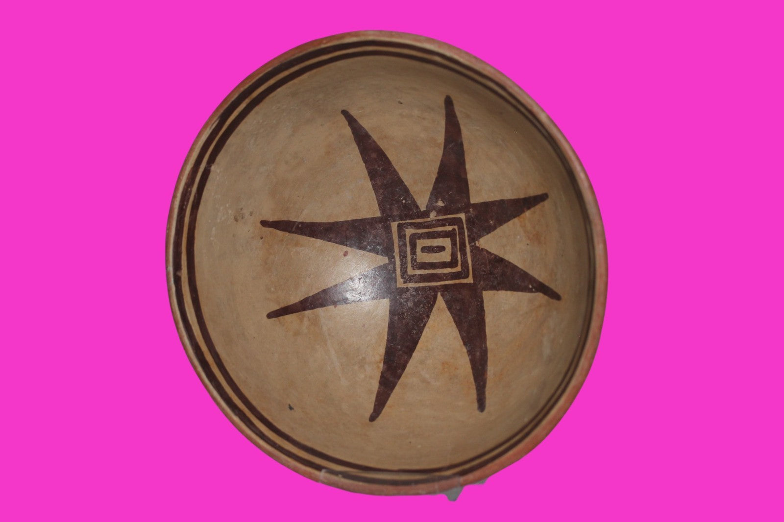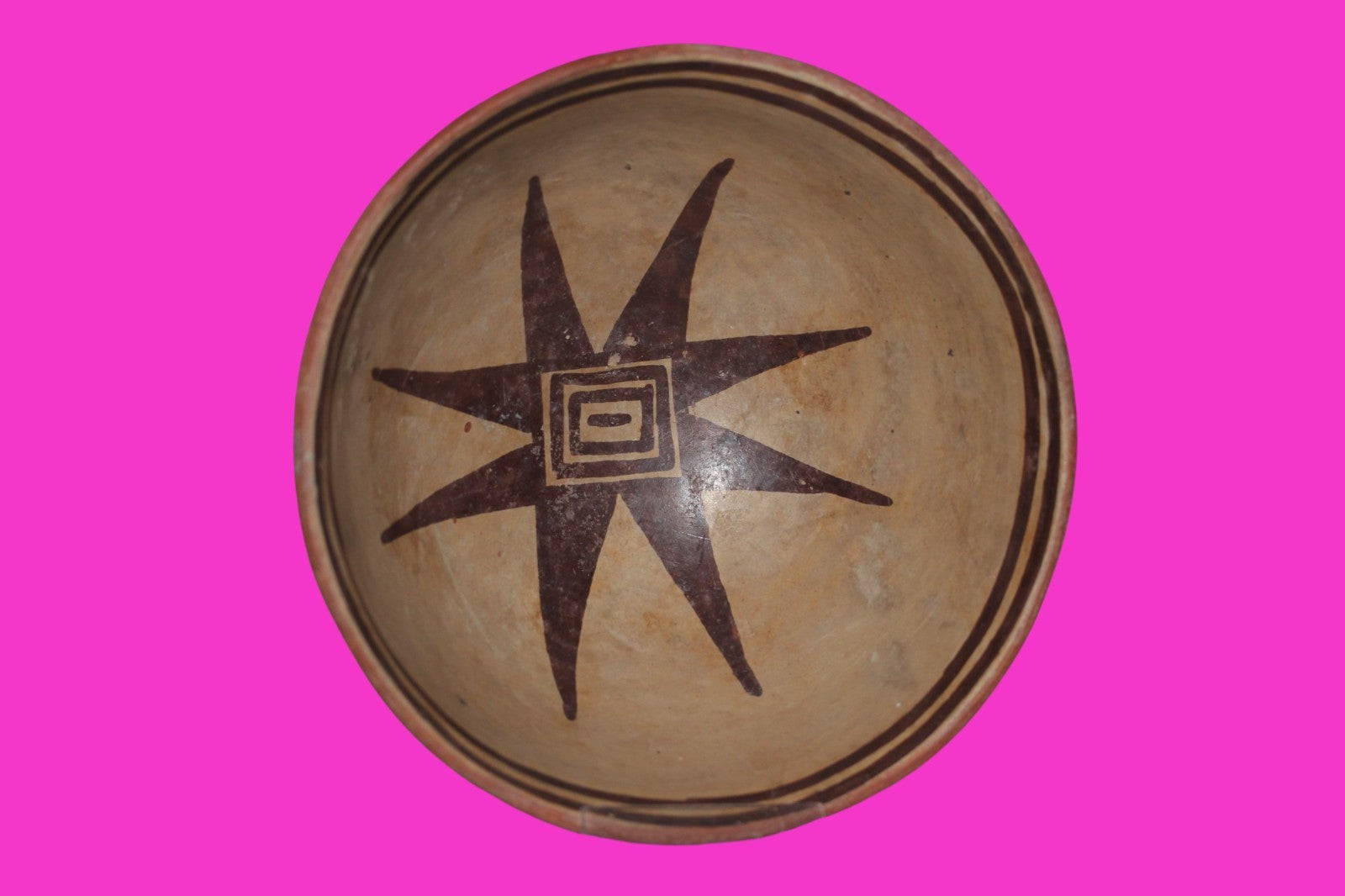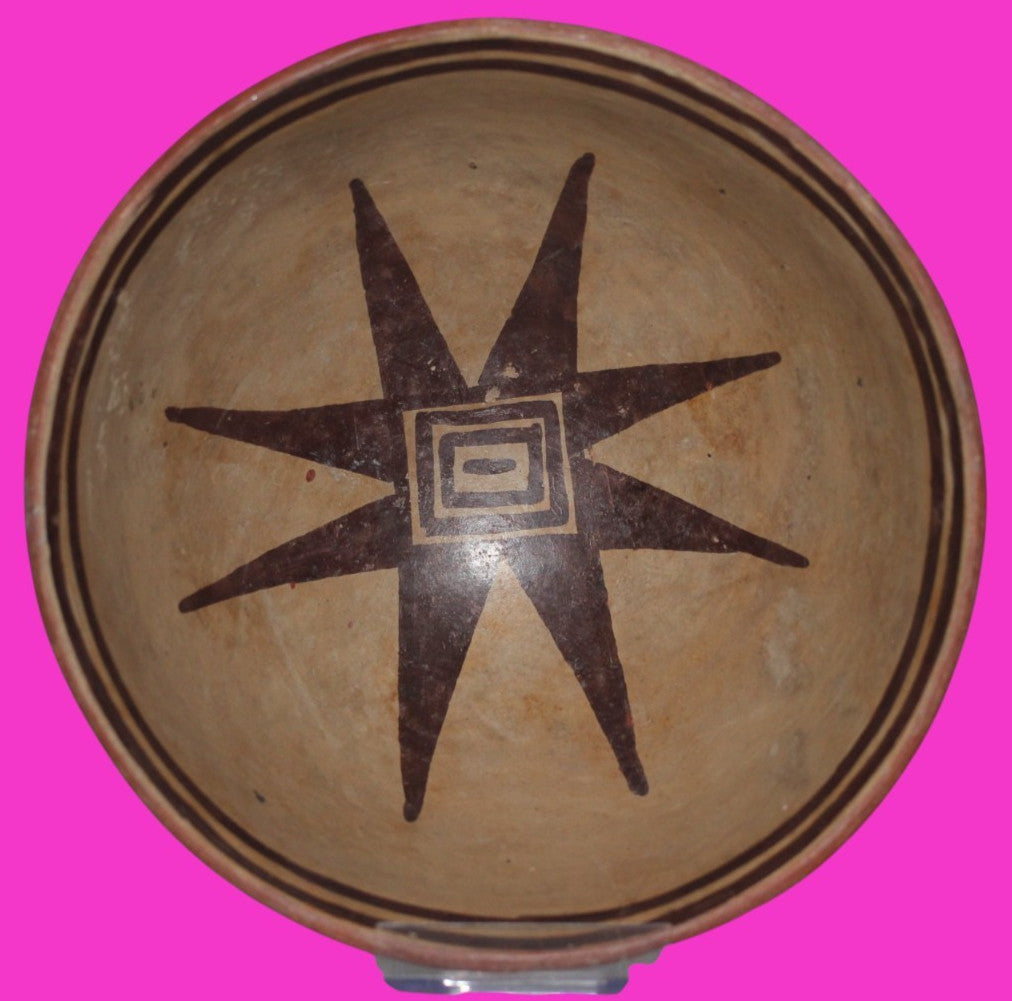 Dimensions: 3 ¾ inches tall, 7 ¼ inches wide, weighs 511 grams Description: Redware pedestal bowl with a cream interior slip decorated with brown geometric shapes including an 8-pointed star. Small rim chips, paint wear consistent with age and everyday use, otherwise intact. No repairs or restorations were found. Overall Outstanding condition. Provenance: Ex. Arte Xibalba, Acquired by John McIntosh, MSE, MBA, Ancient Artifacts & Treasures, Winter Park, Florida on 7/20/2020. Consigned to The Artifact City Collection on 7/03/2025.
