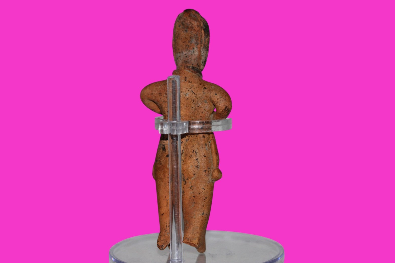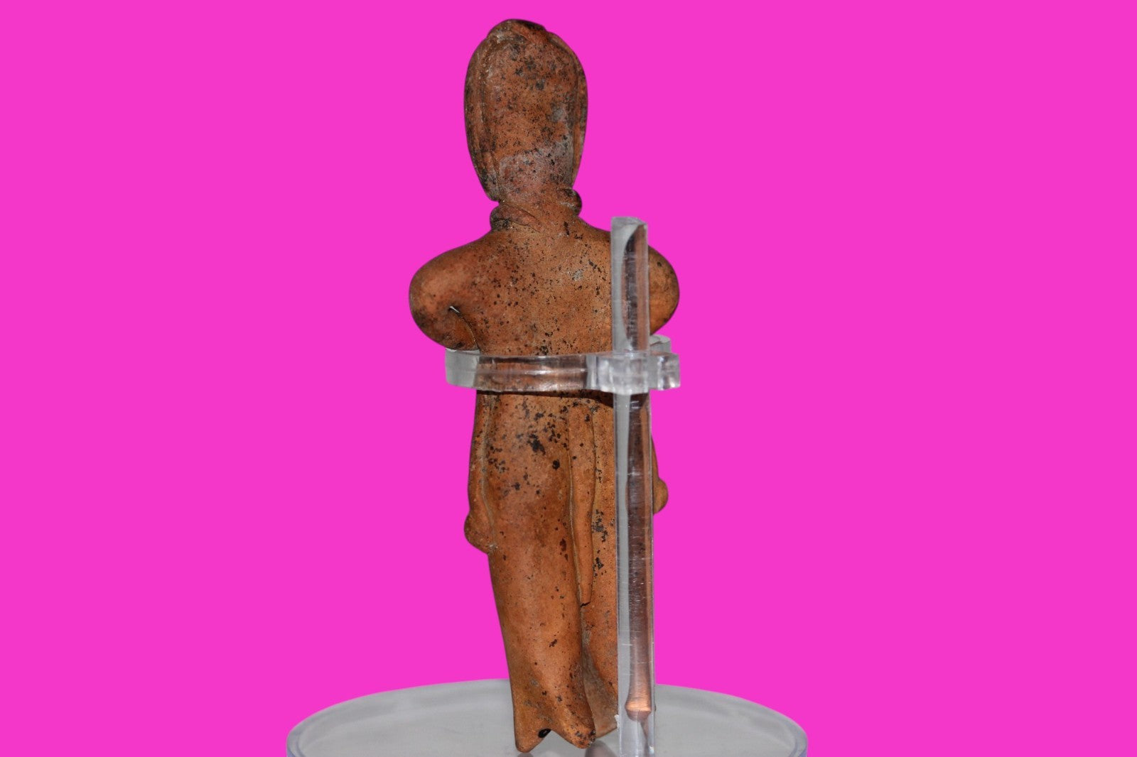 Dimensions: 4 ¾ inches tall, 2 inches wide, weighs 53 grams. Description: Female “Pretty Lady’ tomb figure with a fancy hair style. Wearing a necklace and a loin cloth with incisions and tassels. Arms folded over chest. End of nose chipped. No repairs or restorations. Abrasions, wear consistent with age. Overall outstanding condition. Manganese Dioxide Reactivity Test Results: A solution of laboratory grade 40% hydrogen peroxide was applied to multiple manganese blooms that resulted in a strong chemical reaction indicating approximately 2000 years of underground burial. Provenance: Ex. Arte Primitivo Fine Art Gallery, February 2025. Ex. Private Nevada collection. Ex. Dr. David Harner collection, Arkansas, 1950’s -1960’s.