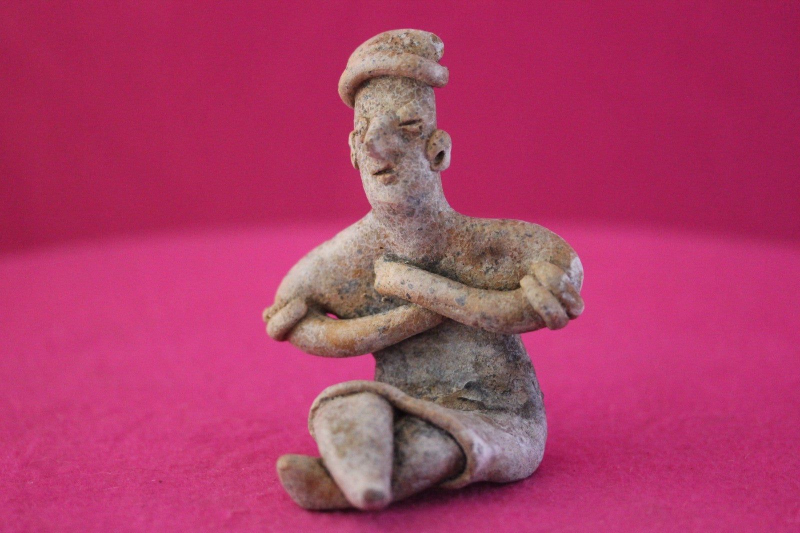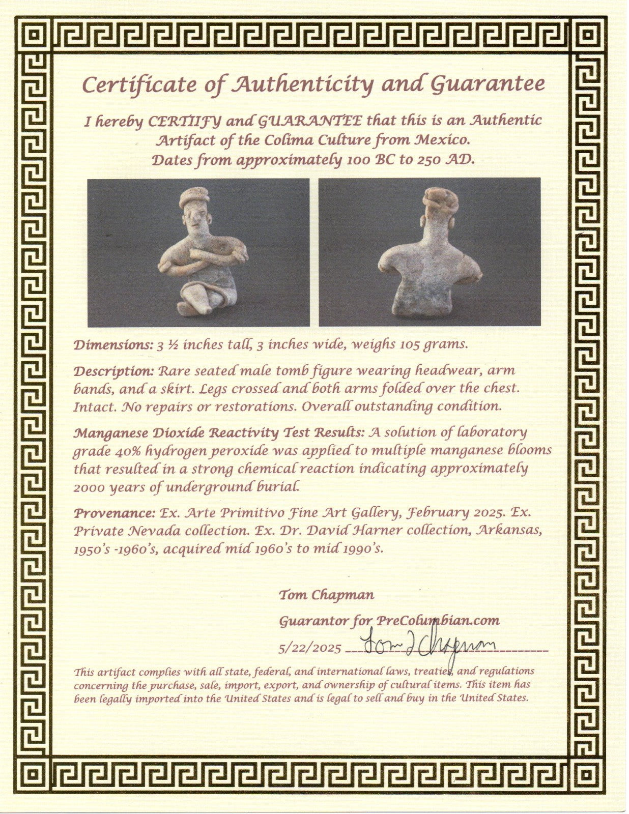 Dimensions: 3 ½ inches tall, 3 inches wide, weighs 105 grams.Description: Rare seated male tomb figure wearing headwear, arm bands, and a skirt. Legs crossed and both arms folded over the chest. Intact. No repairs or restorations. Overall outstanding condition.Manganese Dioxide Reactivity Test Results: A solution of laboratory grade 40% hydrogen peroxide was applied to multiple manganese blooms that resulted in a strong chemical reaction indicating approximately 2000 years of underground burial.Provenance: Ex. Arte Primitivo Fine Art Gallery, February 2025. Ex. Private Nevada collection. Ex. Dr. David Harner collection, Arkansas, 1950’s -1960’s, acquired mid 1960’s to mid 1990’s.