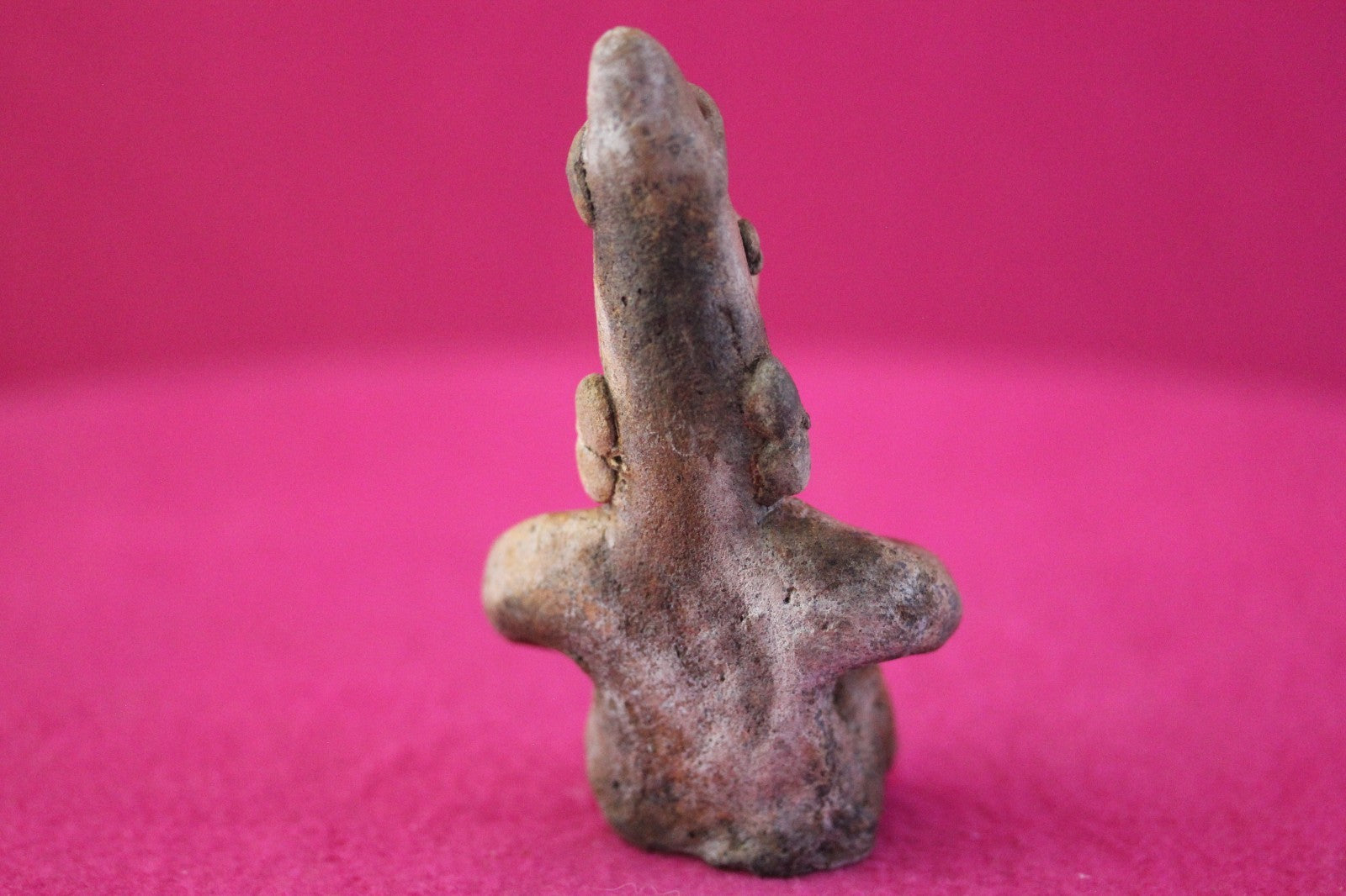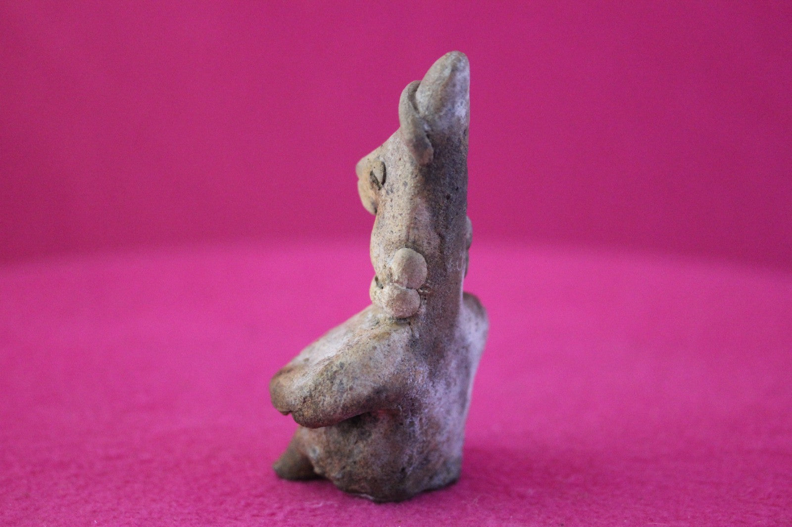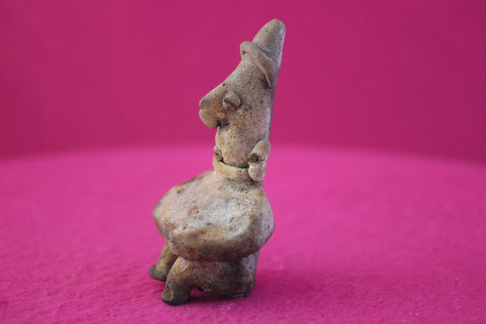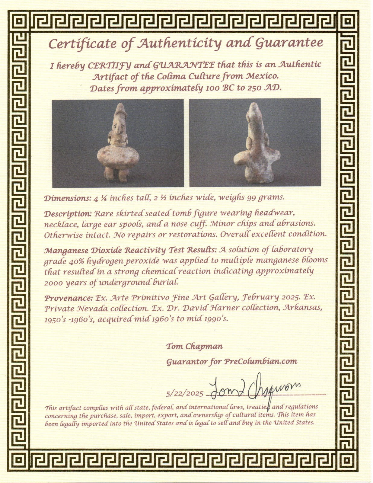 Dimensions: 4 ¼ inches tall, 2 ½ inches wide, weighs 99 grams.Description: Rare skirted seated tomb figure wearing headwear, necklace, large ear spools, and a nose cuff. Minor chips and abrasions. Otherwise intact. No repairs or restorations. Overall excellent condition.Manganese Dioxide Reactivity Test Results: A solution of laboratory grade 40% hydrogen peroxide was applied to multiple manganese blooms that resulted in a strong chemical reaction indicating approximately 2000 years of underground burial.Provenance: Ex. Arte Primitivo Fine Art Gallery, February 2025. Ex. Private Nevada collection. Ex. Dr. David Harner collection, Arkansas, 1950’s -1960’s, acquired mid 1960’s to mid 1990’s.
