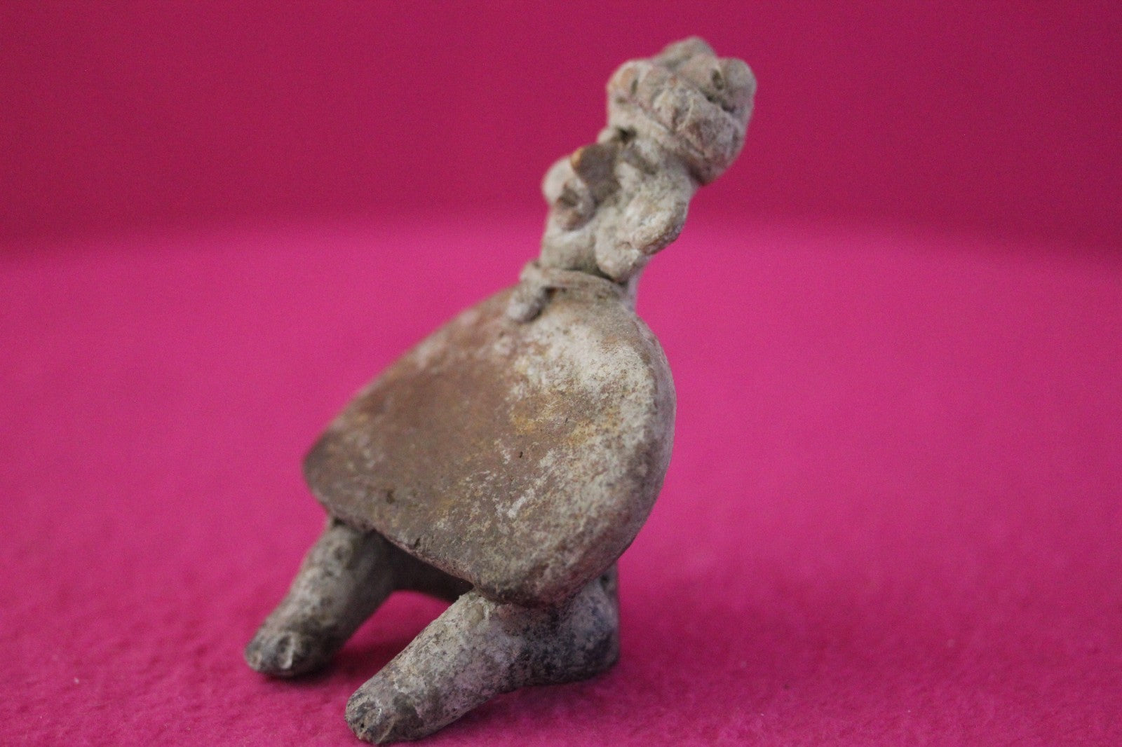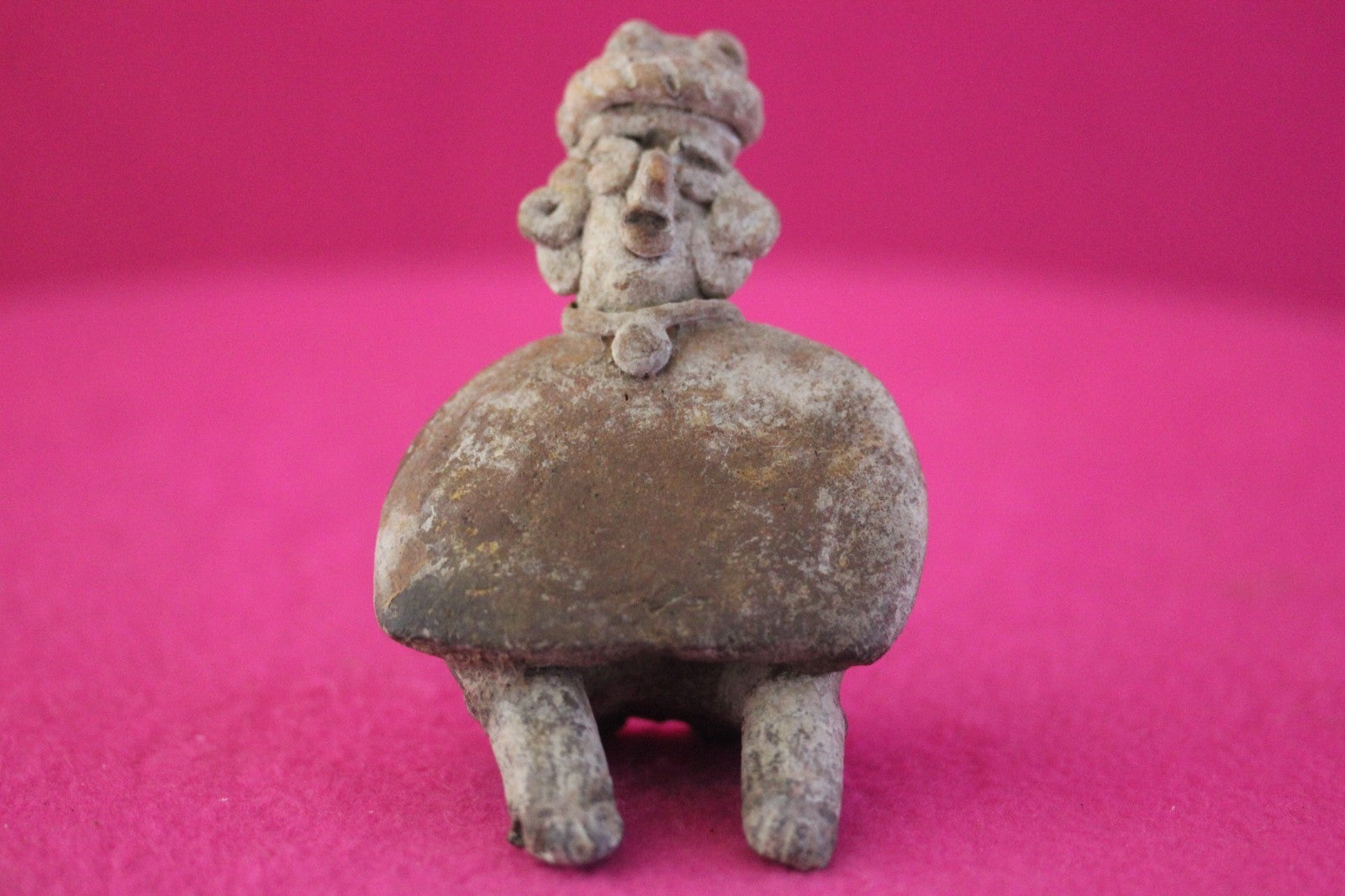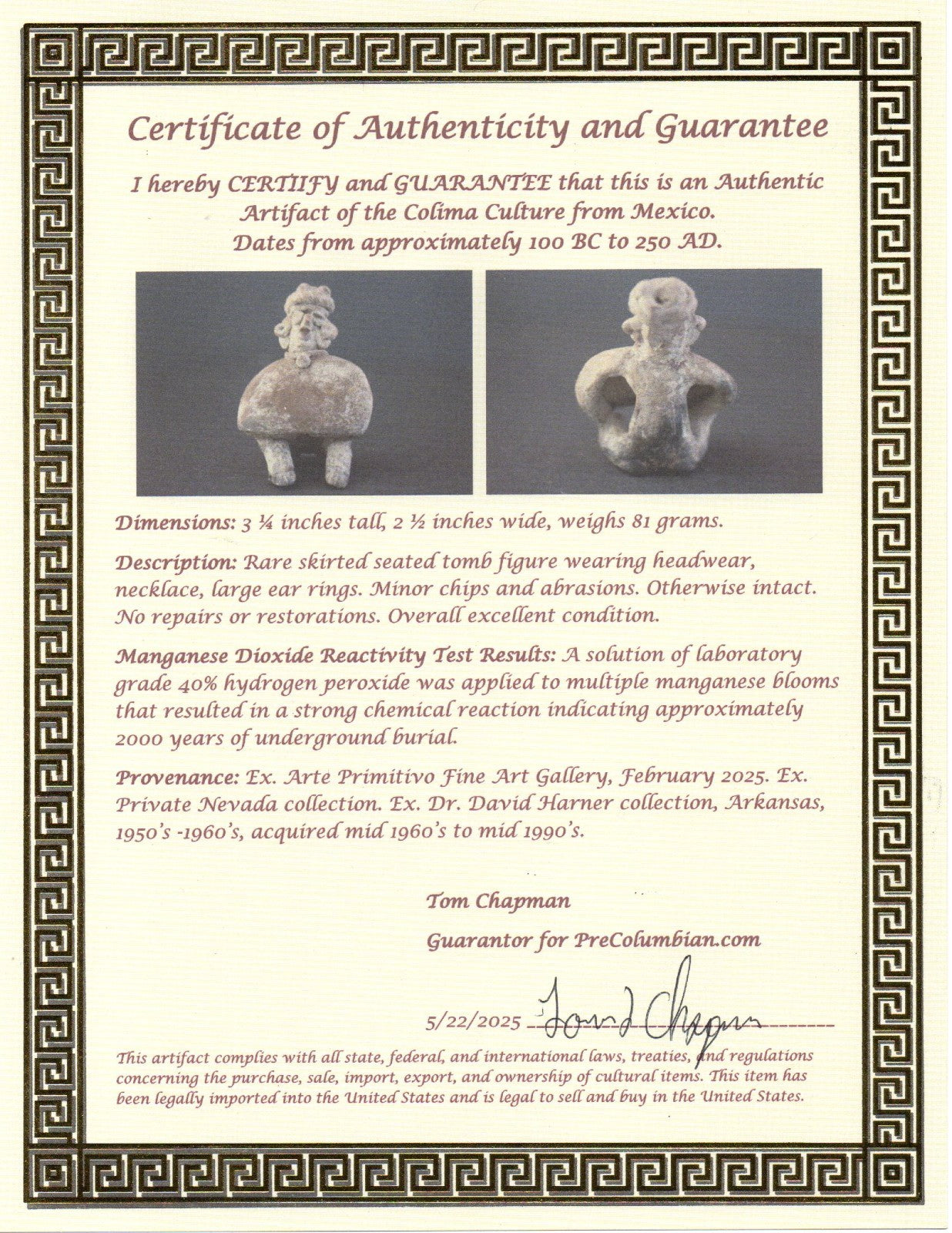 Dimensions: 3 ¼ inches tall, 2 ½ inches wide, weighs 81 grams.Description: Rare skirted seated tomb figure wearing headwear, necklace, large ear rings. Minor chips and abrasions. Otherwise intact. No repairs or restorations. Overall excellent condition.Manganese Dioxide Reactivity Test Results: A solution of laboratory grade 40% hydrogen peroxide was applied to multiple manganese blooms that resulted in a strong chemical reaction indicating approximately 2000 years of underground burial.Provenance: Ex. Arte Primitivo Fine Art Gallery, February 2025. Ex. Private Nevada collection. Ex. Dr. David Harner collection, Arkansas, 1950’s -1960’s, acquired mid 1960’s to mid 1990’s.