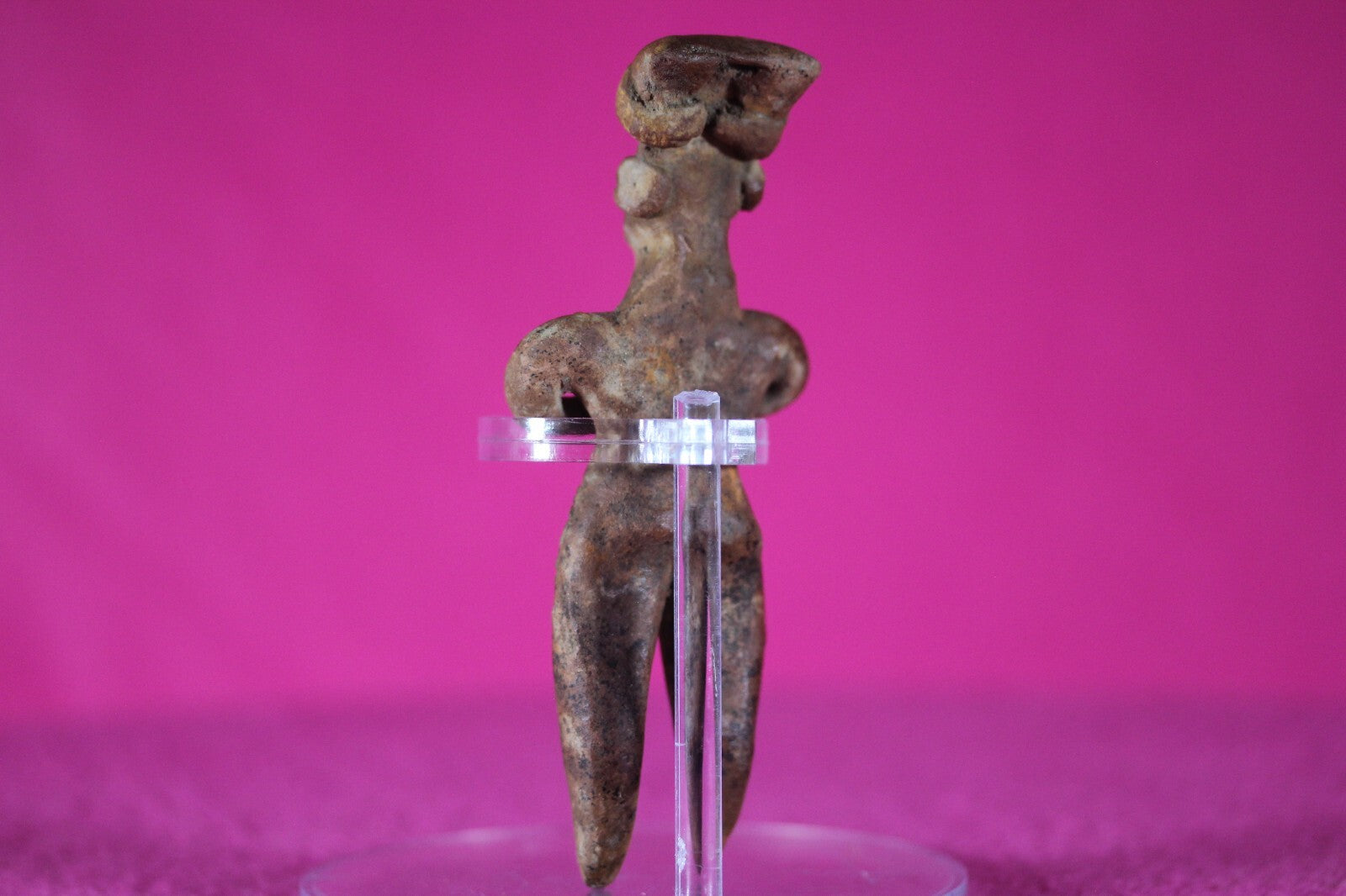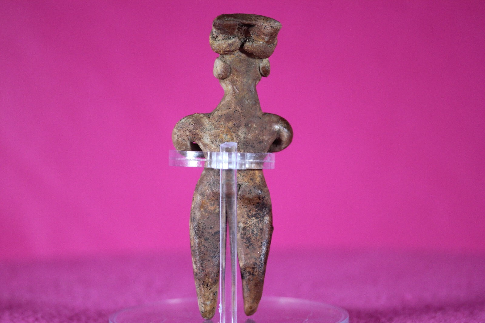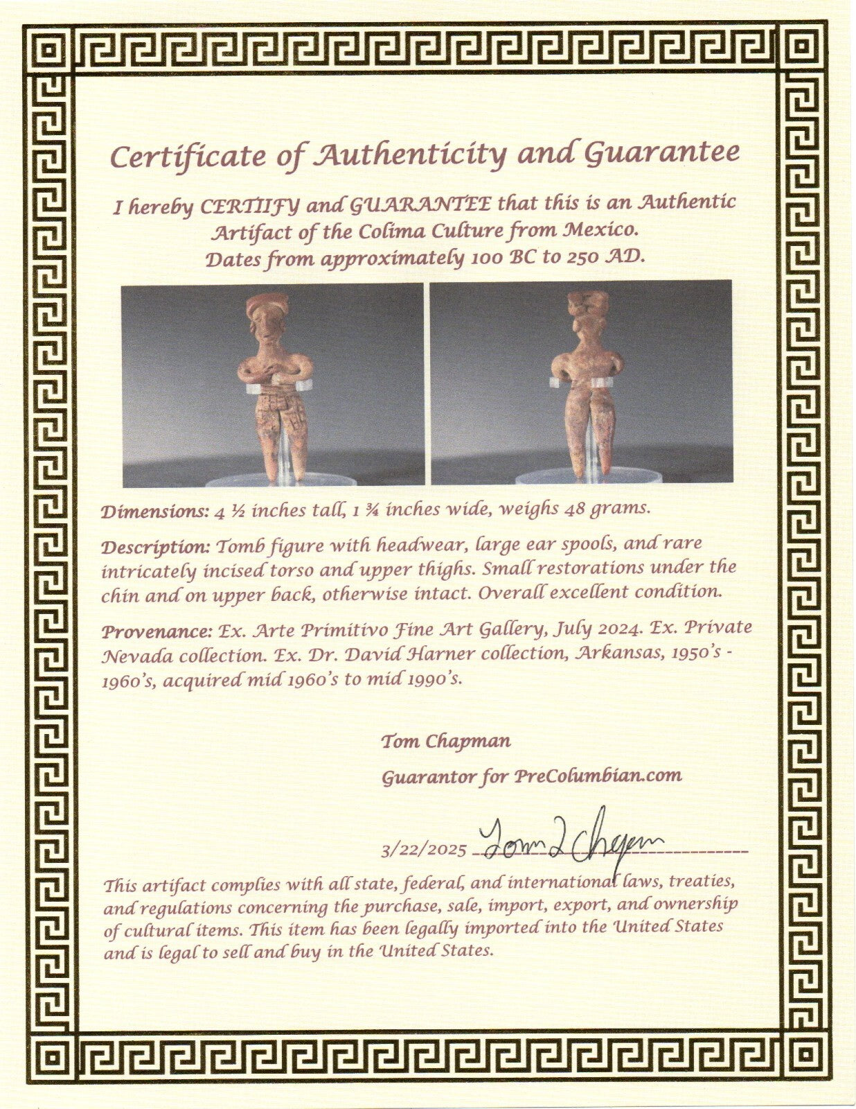 Tomb figure with headwear, large ear spools, and rare intricately incised torso and upper thighs. Small restorations under the chin and on upper back, otherwise intact. Overall excellent condition.Provenance: Ex. Arte Primitivo Fine Art Gallery, July 2024. Ex. Private Nevada collection. Ex. Dr. David Harner collection, Arkansas, 1950’s -1960’s, acquired mid 1960’s to mid 1990’s.