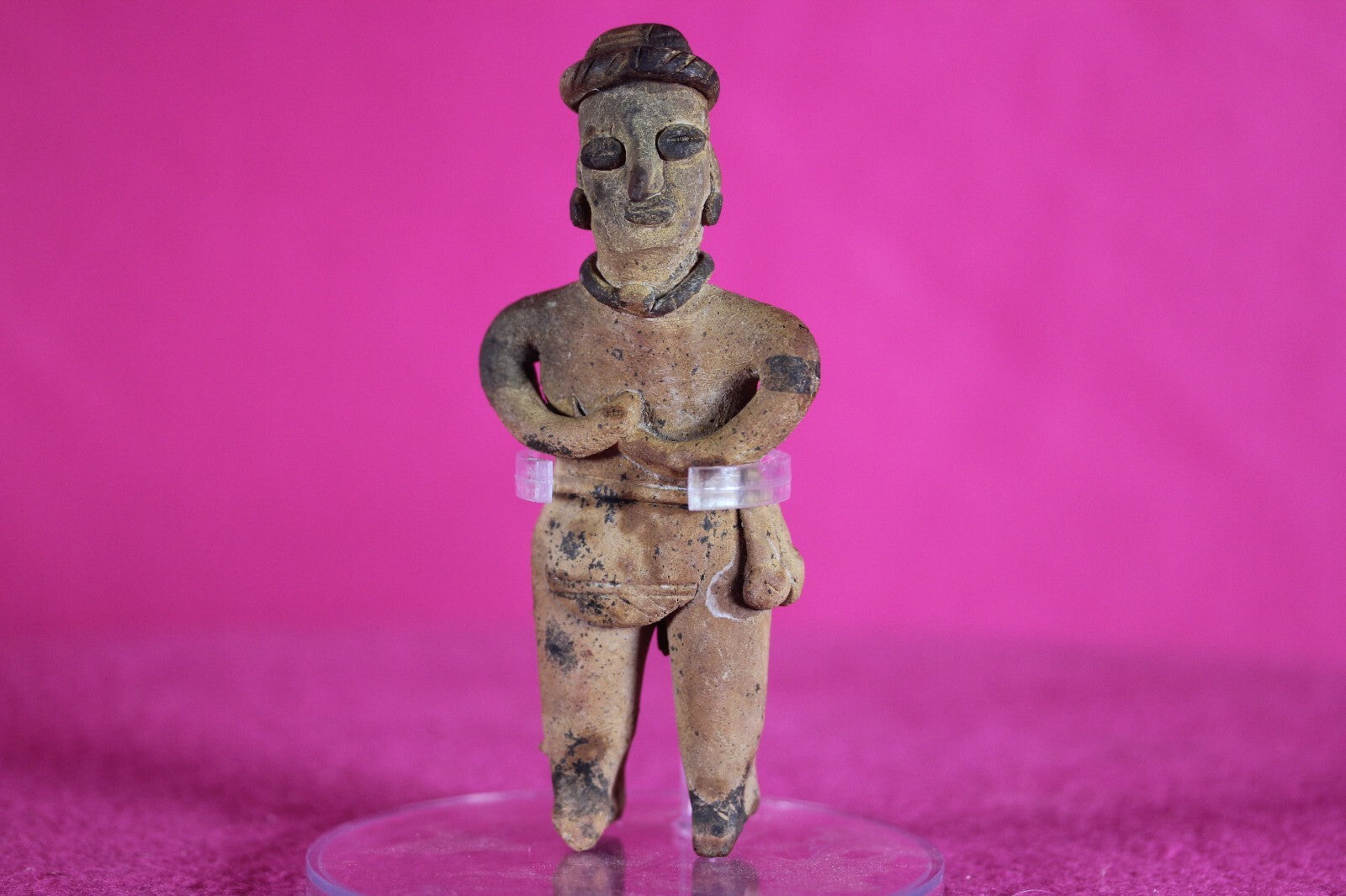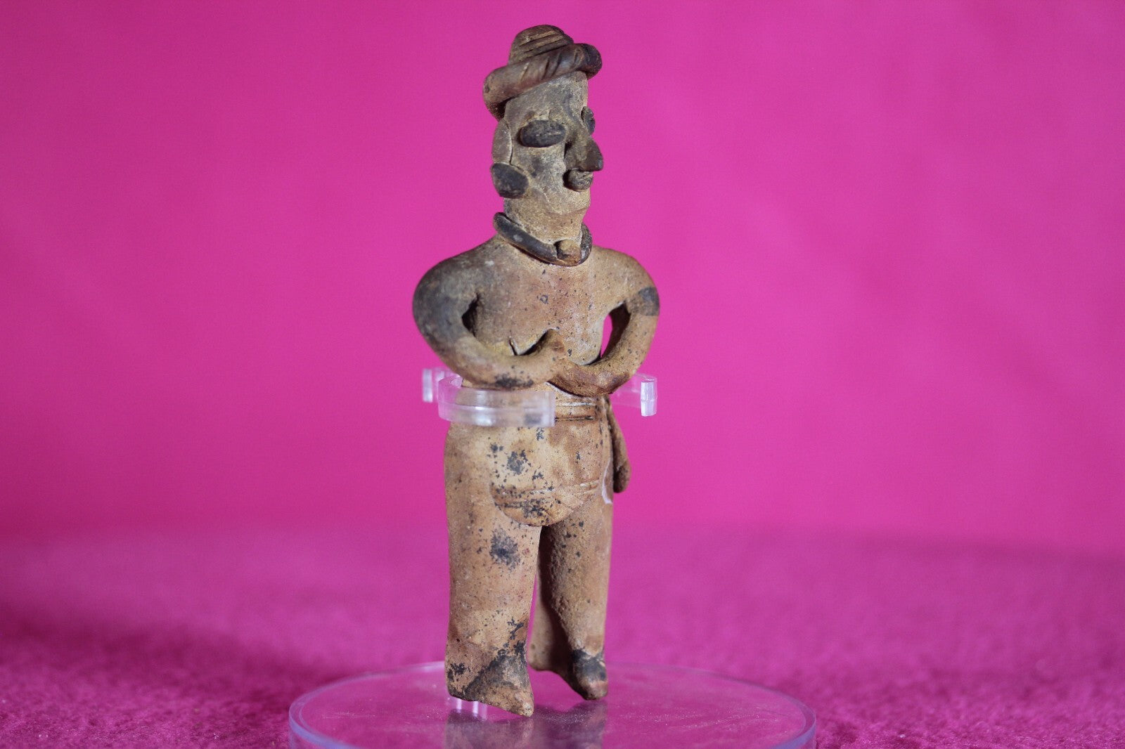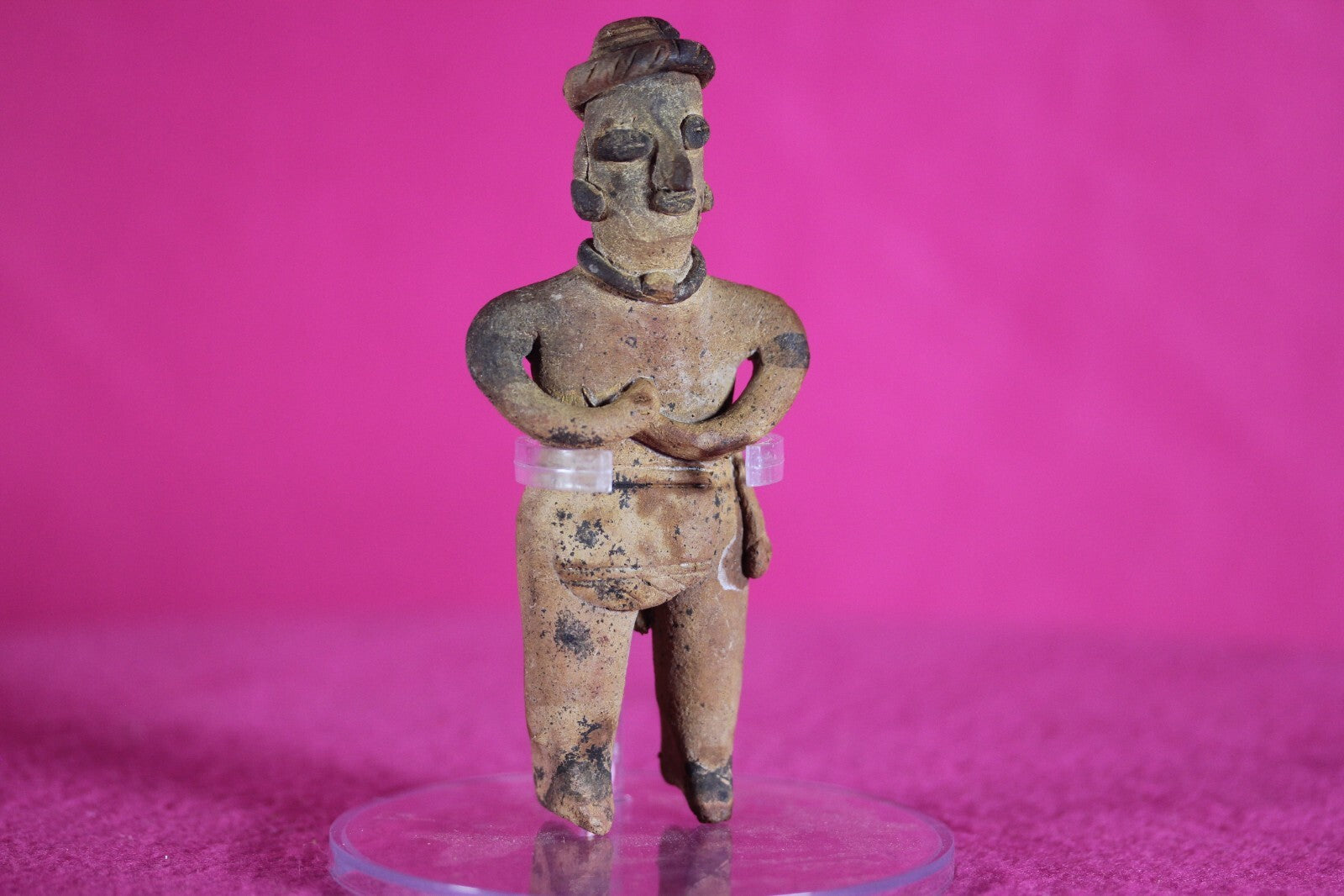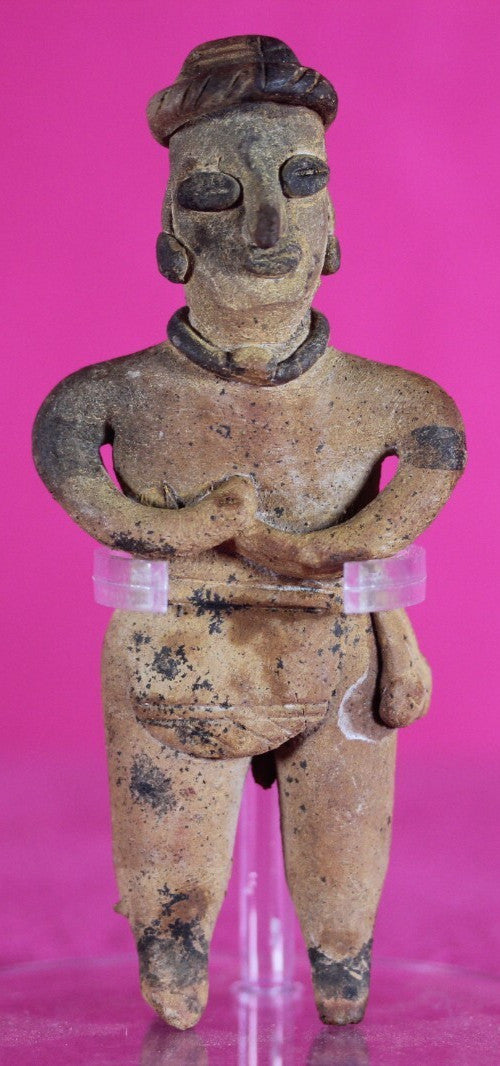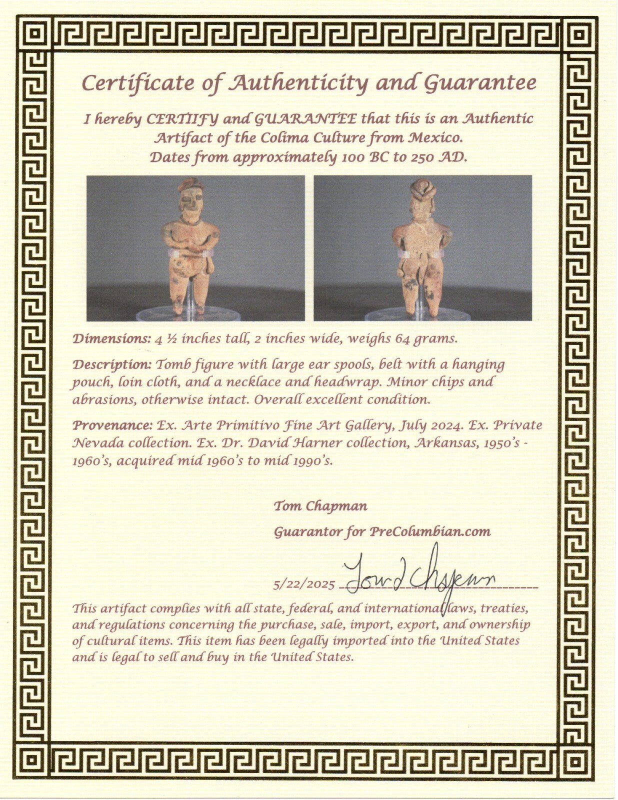 Dimensions: 4 ½ inches tall, 2 inches wide, weighs 64 grams.Description: Tomb figure with large ear spools, belt with a hanging pouch, loin cloth, and a necklace and headwrap. Minor chips and abrasions, otherwise intact. Overall excellent condition.Provenance: Ex. Arte Primitivo Fine Art Gallery, July 2024. Ex. Private Nevada collection. Ex. Dr. David Harner collection, Arkansas, 1950’s -1960’s, acquired mid 1960’s to mid 1990’s.
