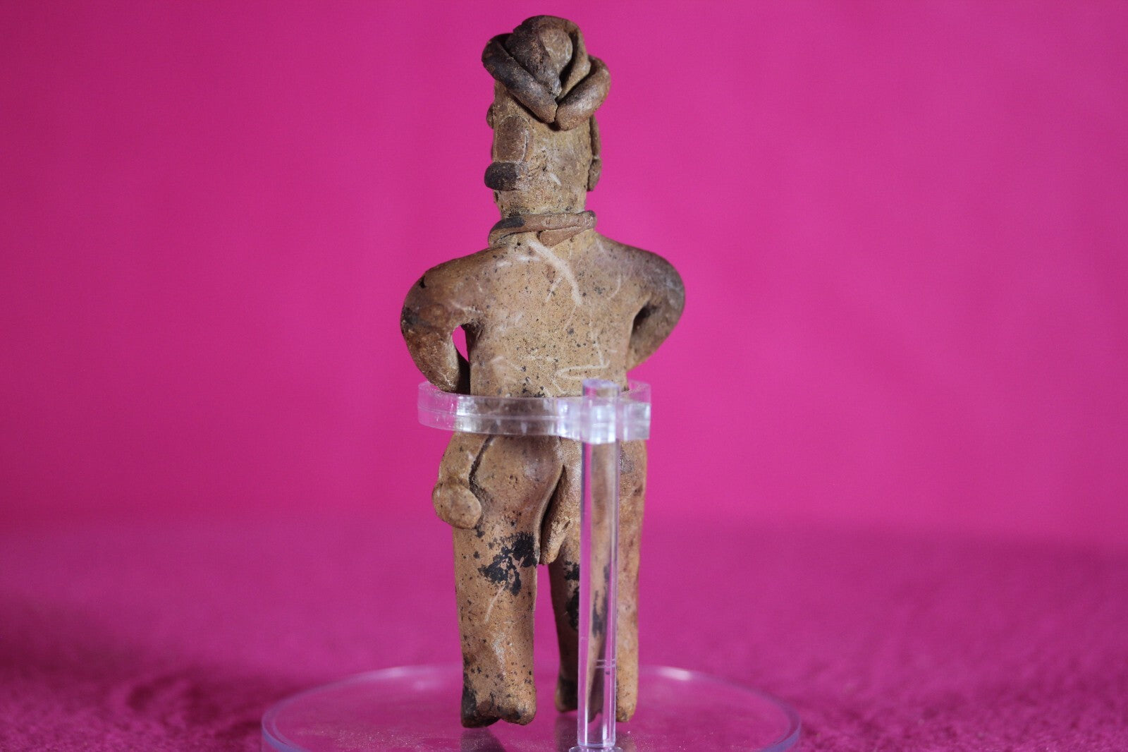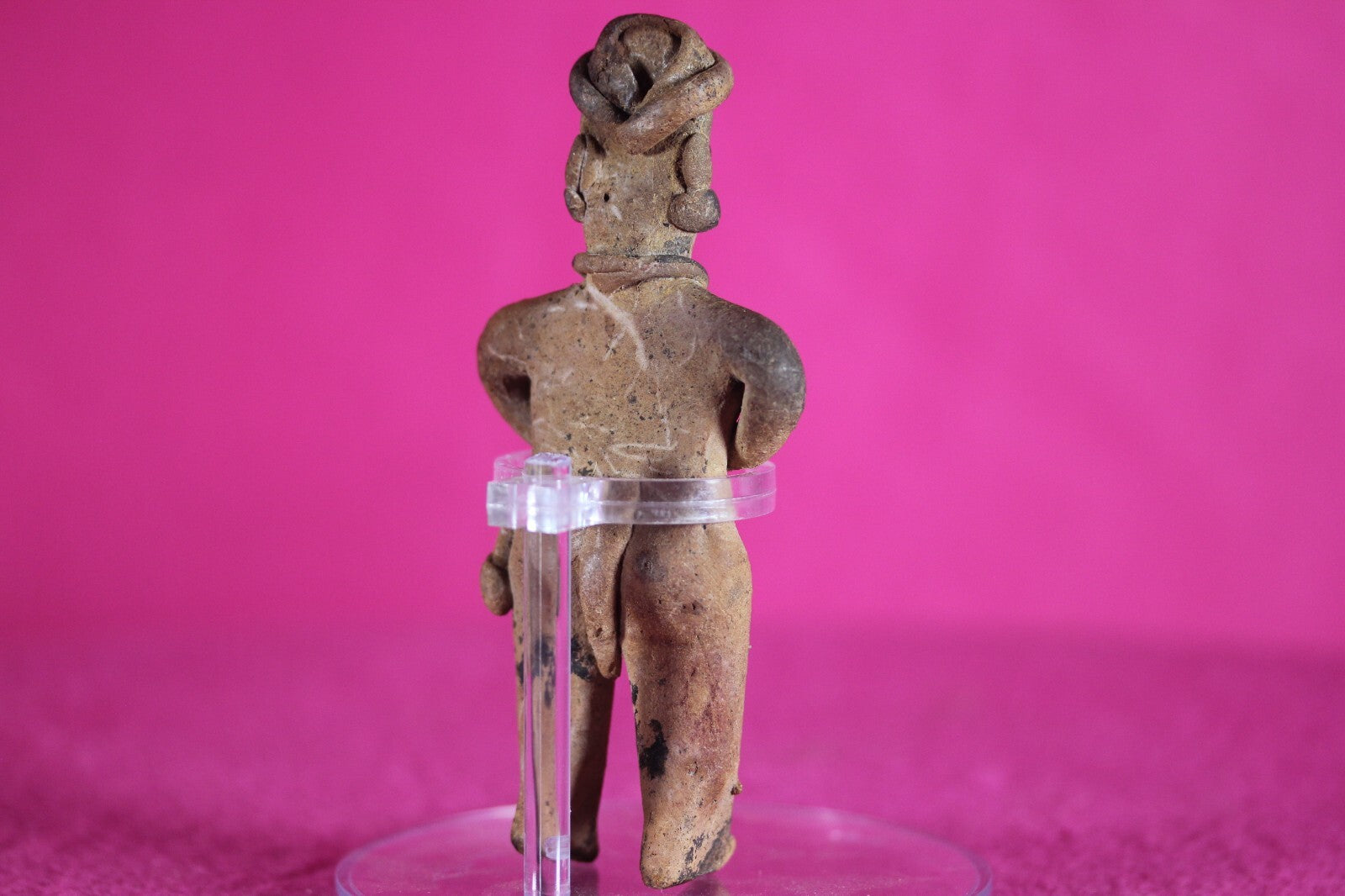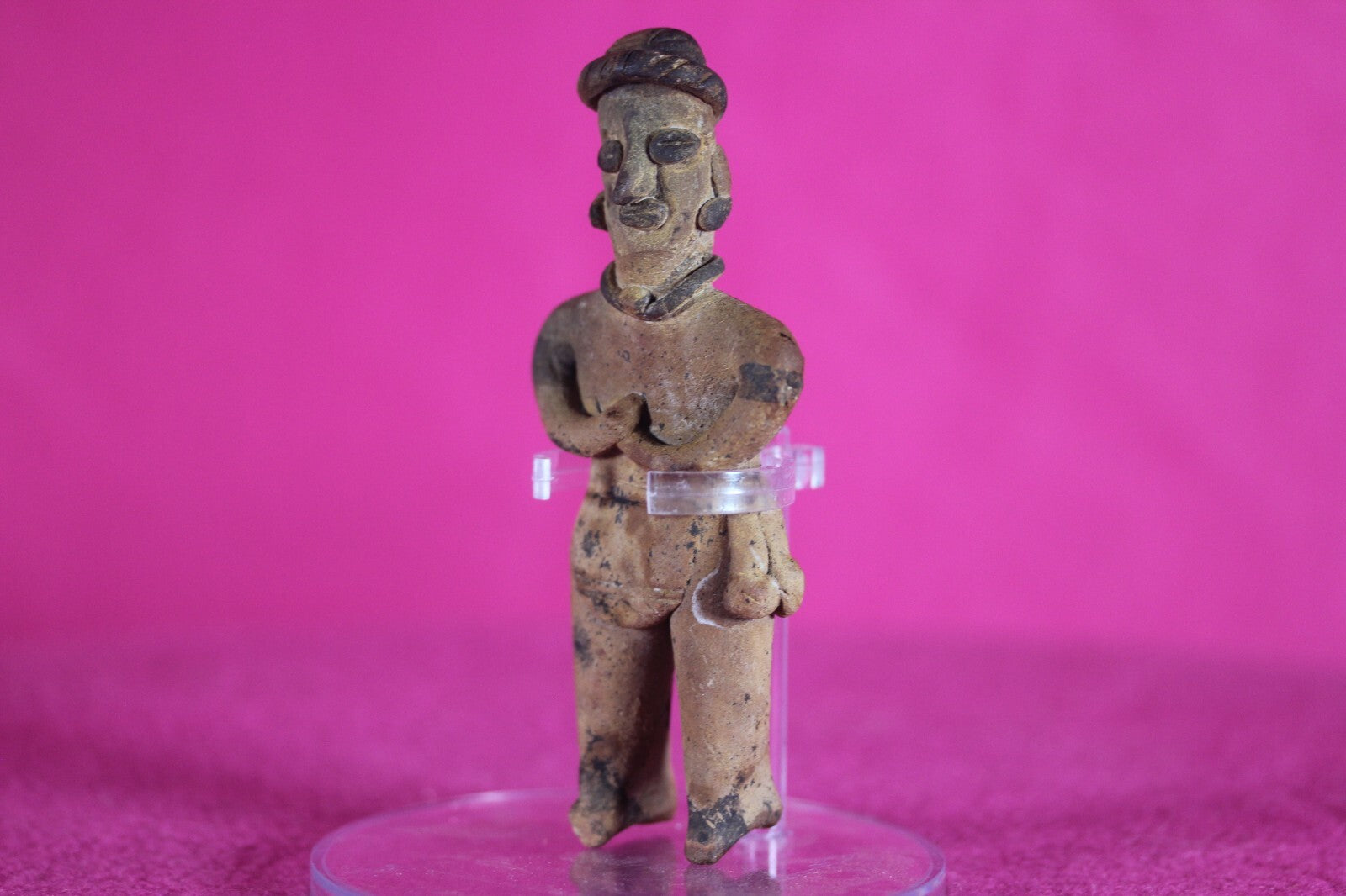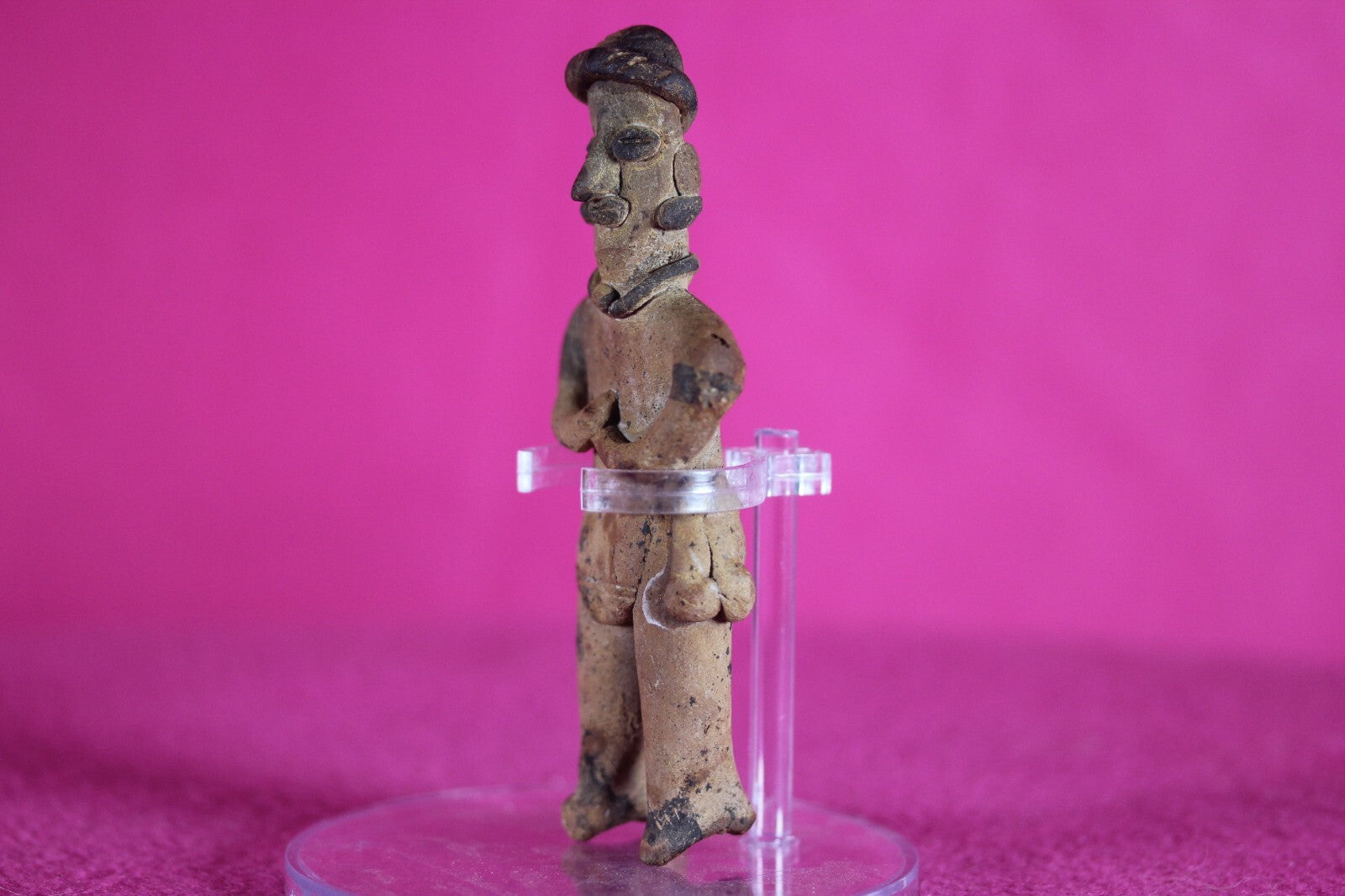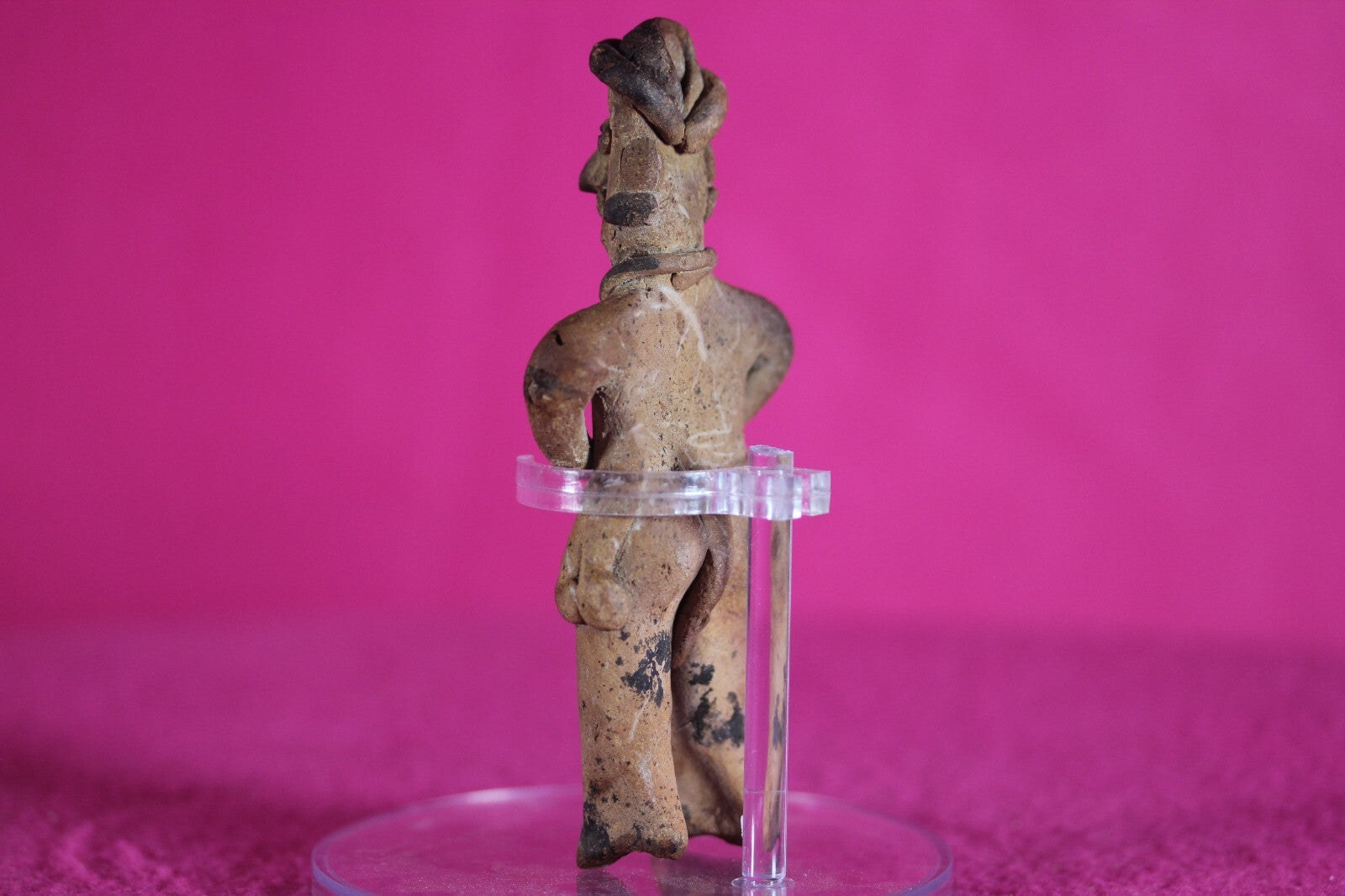 Dimensions: 4 ½ inches tall, 2 inches wide, weighs 64 grams.Description: Tomb figure with large ear spools, belt with a hanging pouch, loin cloth, and a necklace and headwrap. Minor chips and abrasions, otherwise intact. Overall excellent condition.Provenance: Ex. Arte Primitivo Fine Art Gallery, July 2024. Ex. Private Nevada collection. Ex. Dr. David Harner collection, Arkansas, 1950’s -1960’s, acquired mid 1960’s to mid 1990’s.