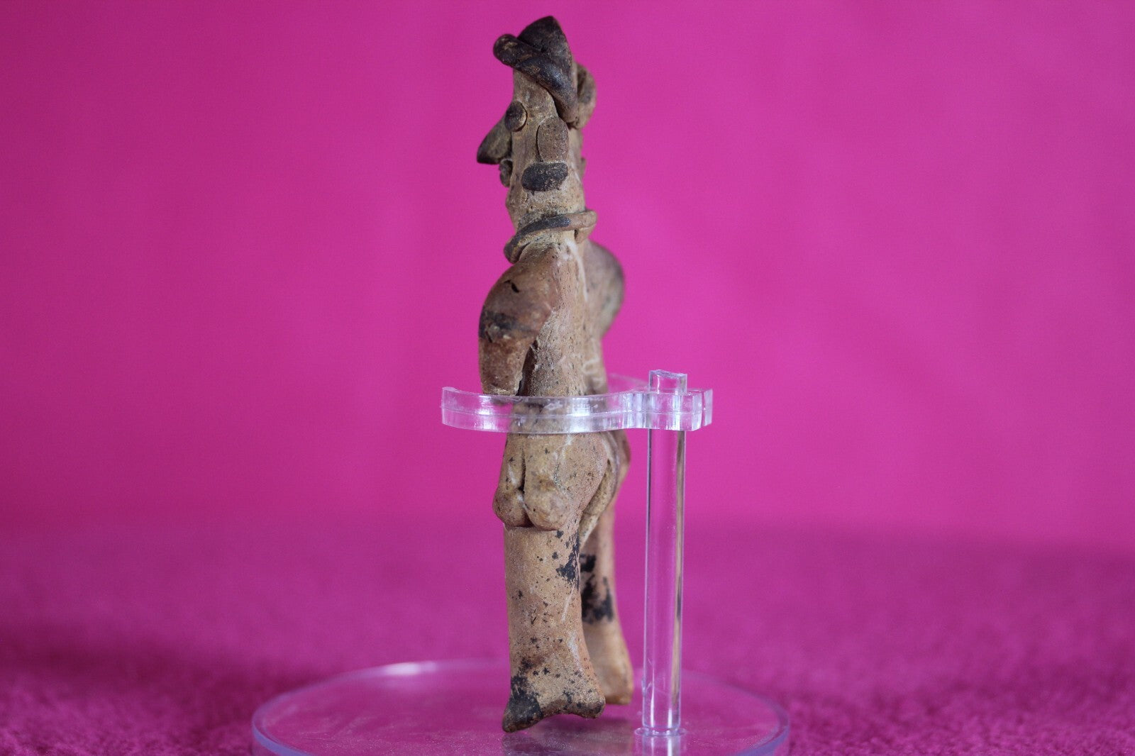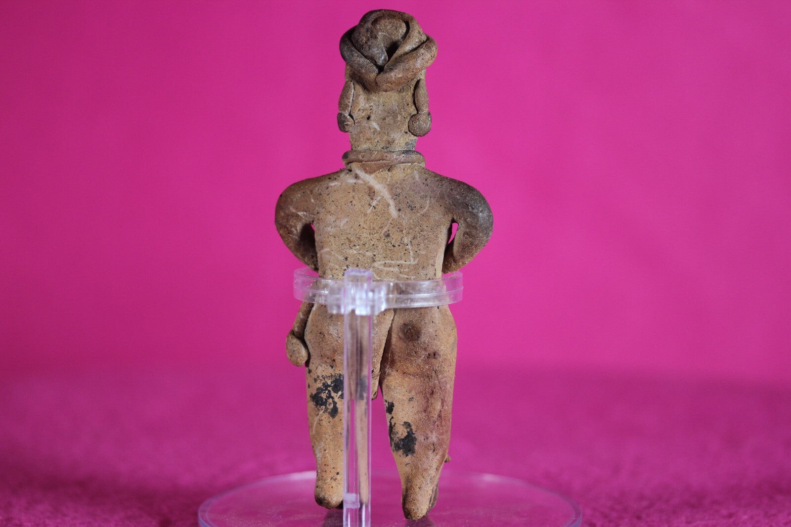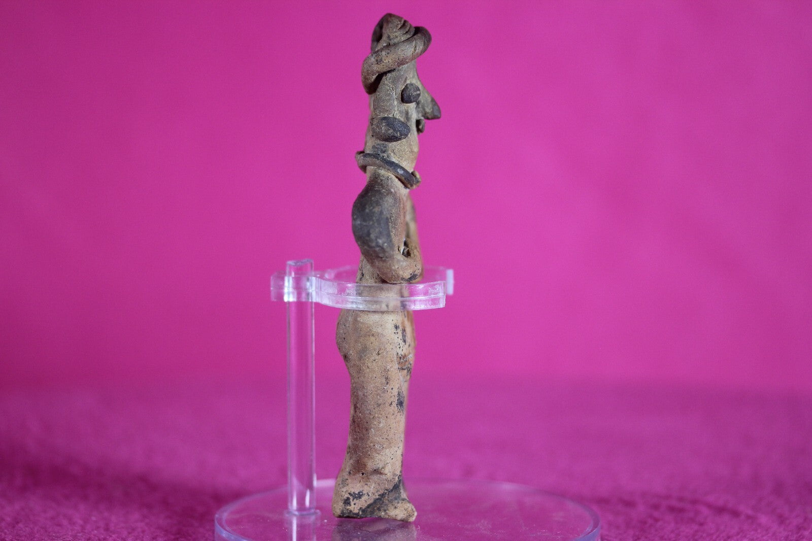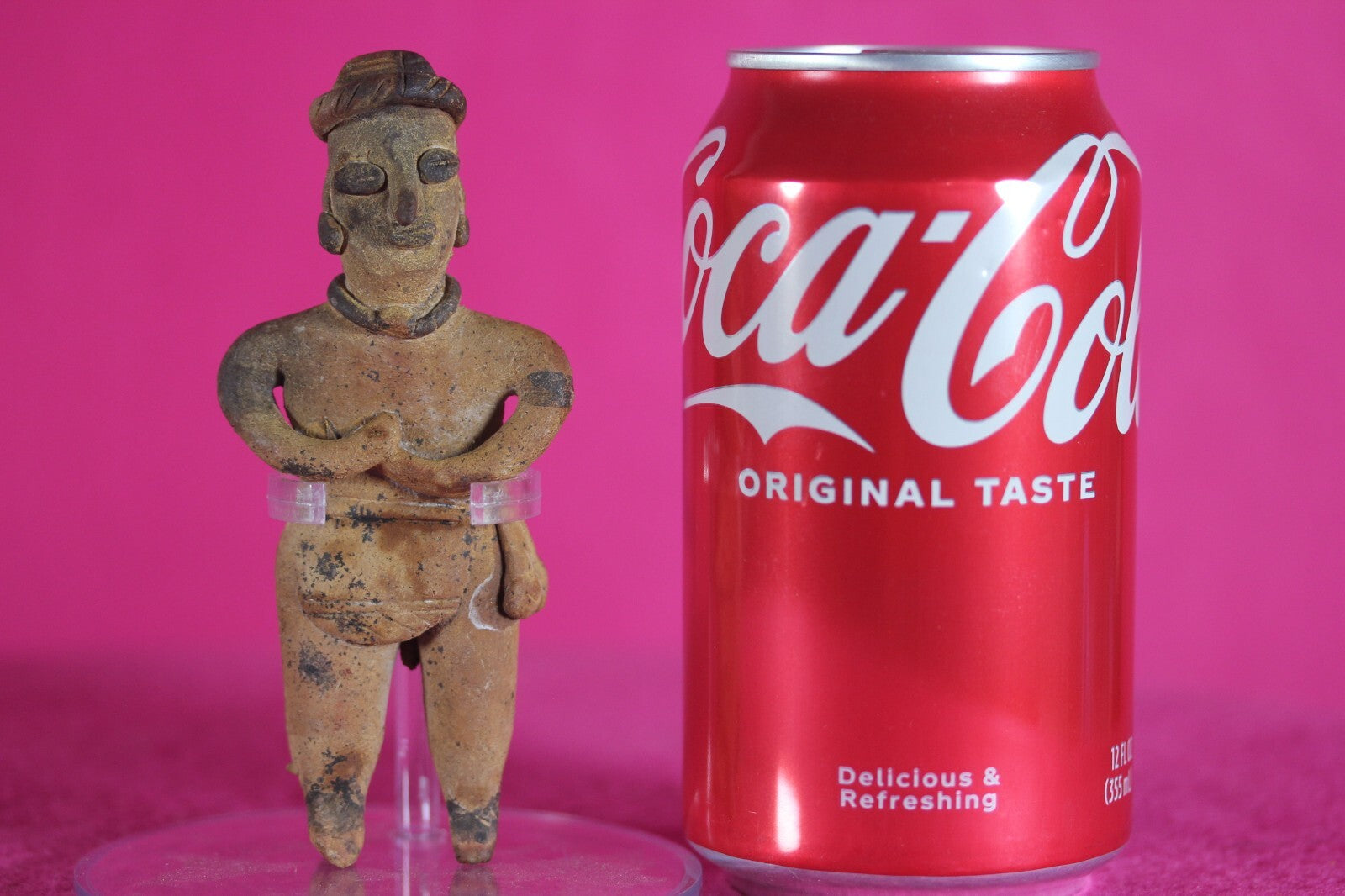 Dimensions: 4 ½ inches tall, 2 inches wide, weighs 64 grams.Description: Tomb figure with large ear spools, belt with a hanging pouch, loin cloth, and a necklace and headwrap. Minor chips and abrasions, otherwise intact. Overall excellent condition.Provenance: Ex. Arte Primitivo Fine Art Gallery, July 2024. Ex. Private Nevada collection. Ex. Dr. David Harner collection, Arkansas, 1950’s -1960’s, acquired mid 1960’s to mid 1990’s.