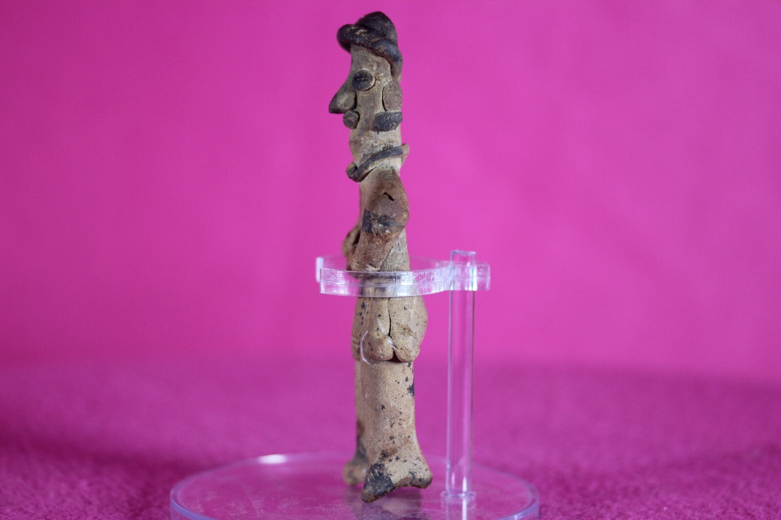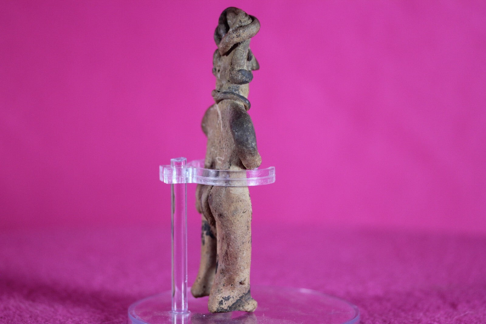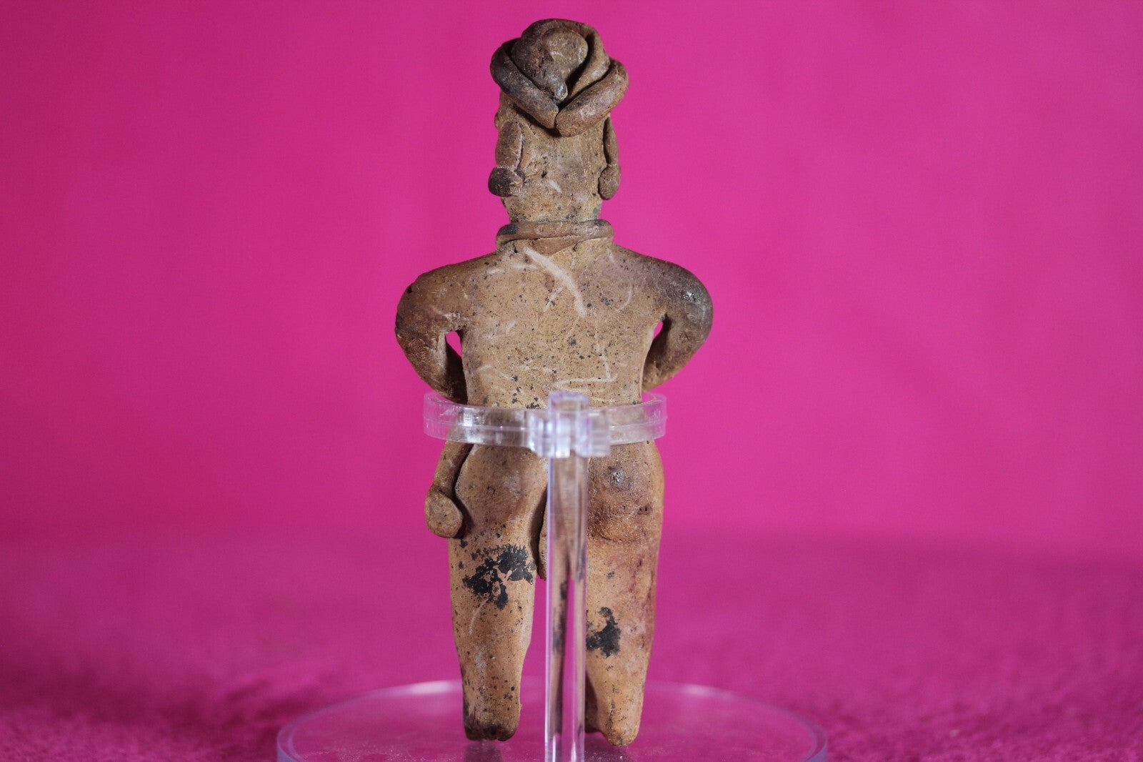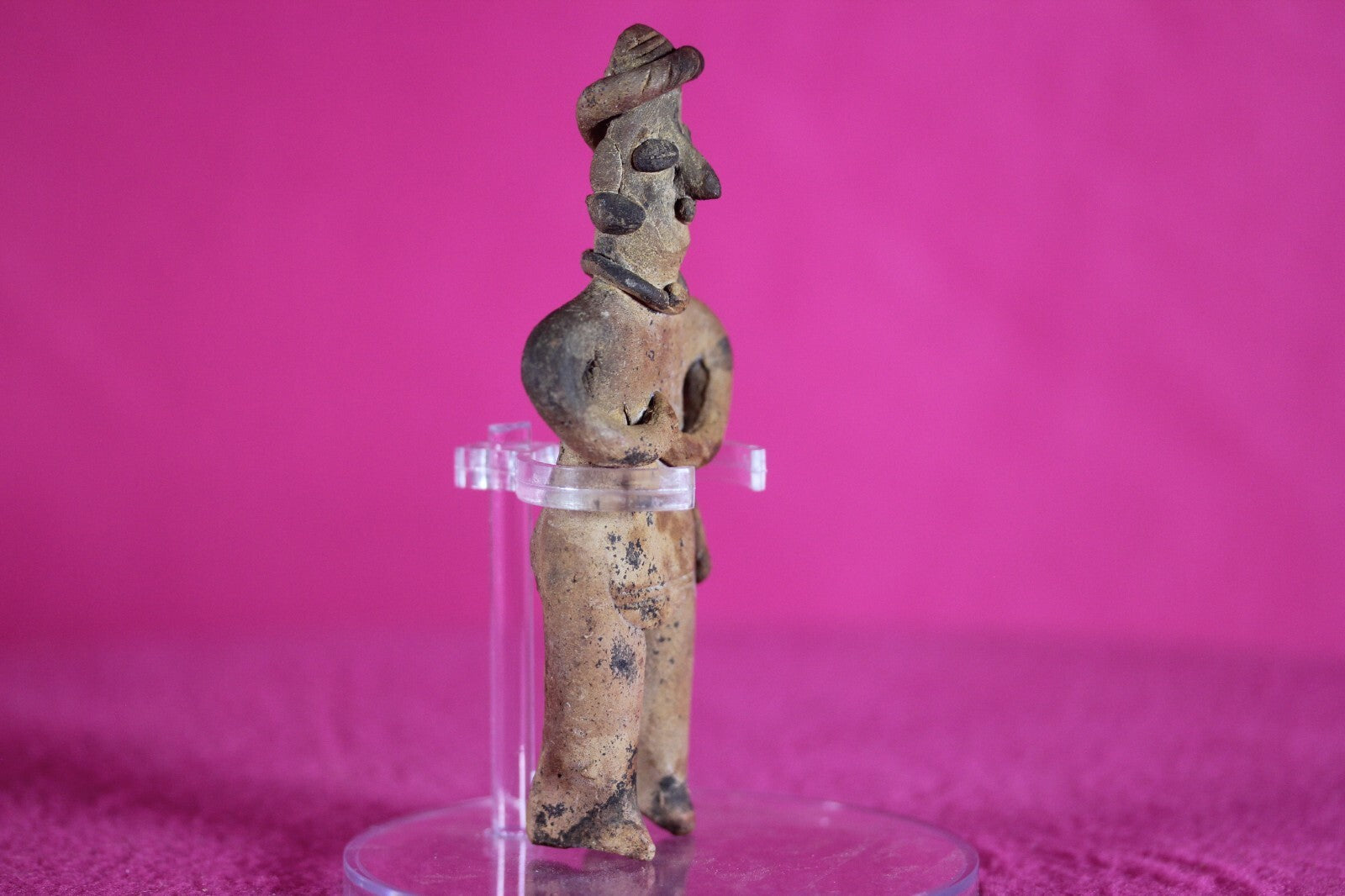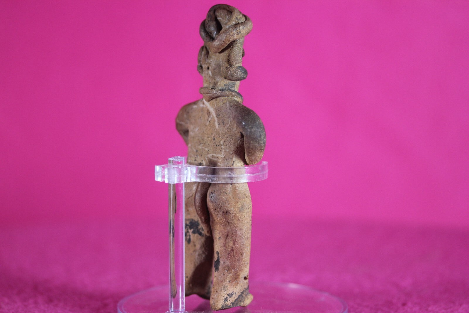 Dimensions: 4 ½ inches tall, 2 inches wide, weighs 64 grams.Description: Tomb figure with large ear spools, belt with a hanging pouch, loin cloth, and a necklace and headwrap. Minor chips and abrasions, otherwise intact. Overall excellent condition.Provenance: Ex. Arte Primitivo Fine Art Gallery, July 2024. Ex. Private Nevada collection. Ex. Dr. David Harner collection, Arkansas, 1950’s -1960’s, acquired mid 1960’s to mid 1990’s.