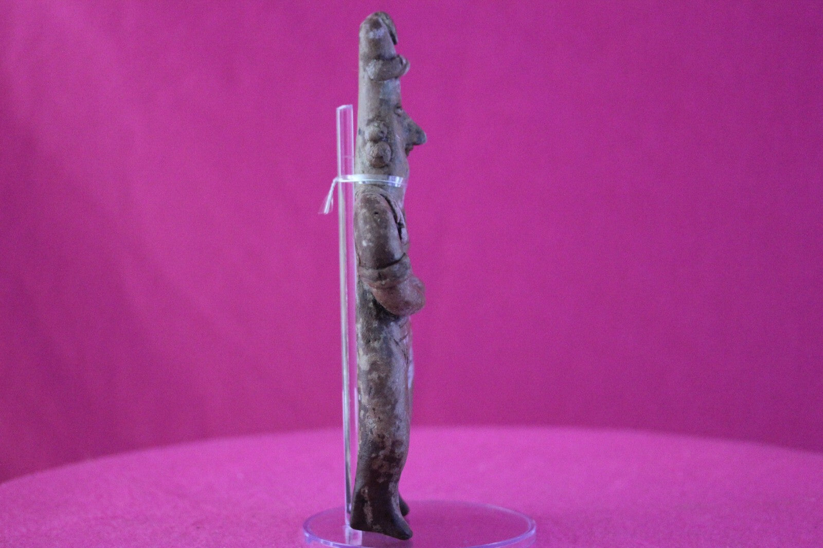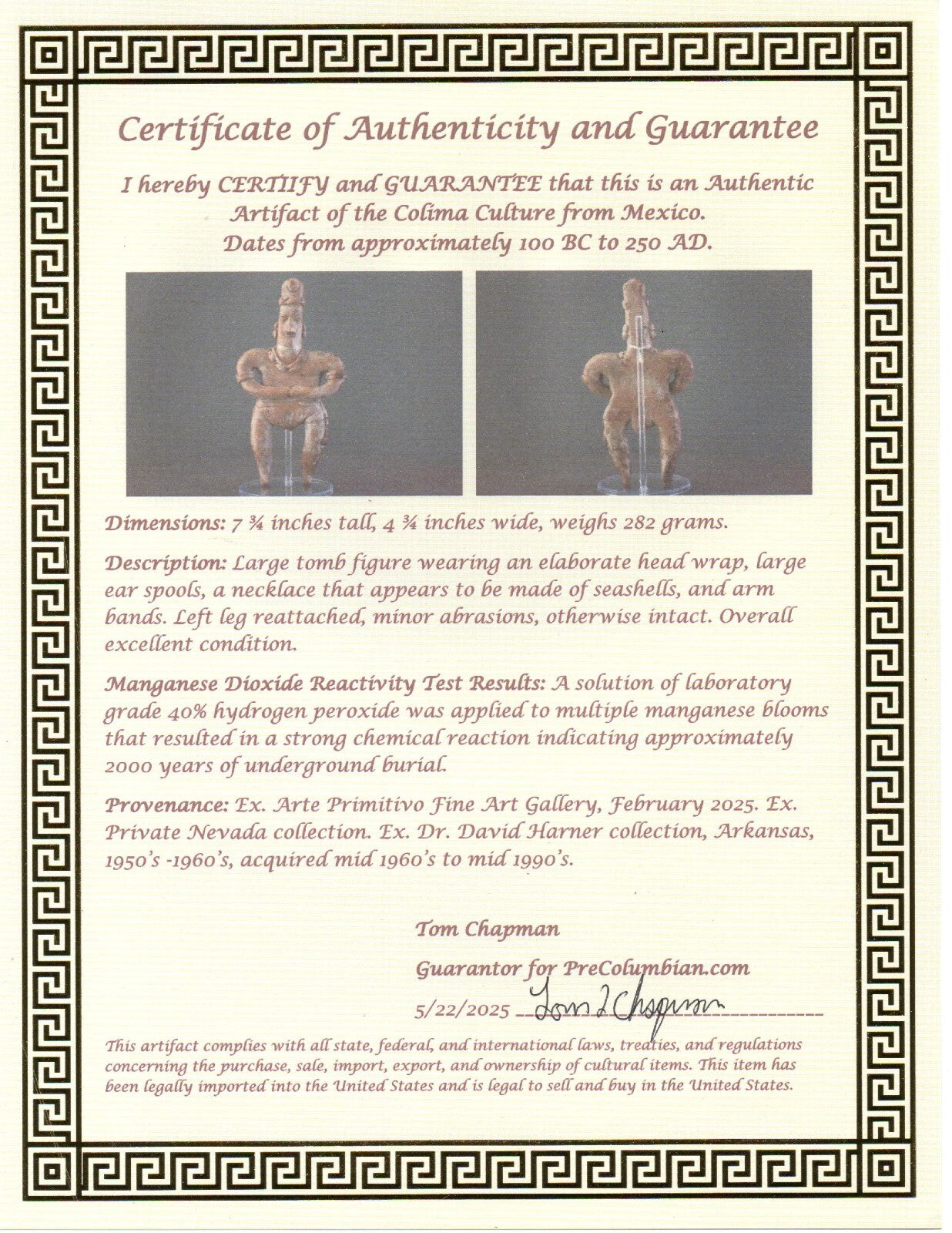 Dimensions: 7 ¾ inches tall, 4 ¾ inches wide, weighs 282 grams.Description: Large tomb figure wearing an elaborate head wrap, large ear spools, a necklace that appears to be made of seashells, and arm bands. Left leg reattached, minor abrasions, otherwise intact. Overall excellent condition.Manganese Dioxide Reactivity Test Results: A solution of laboratory grade 40% hydrogen peroxide was applied to multiple manganese blooms that resulted in a strong chemical reaction indicating approximately 2000 years of underground burial.Provenance: Ex. Arte Primitivo Fine Art Gallery, February 2025. Ex. Private Nevada collection. Ex. Dr. David Harner collection, Arkansas, 1950’s -1960’s, acquired mid 1960’s to mid 1990’s.