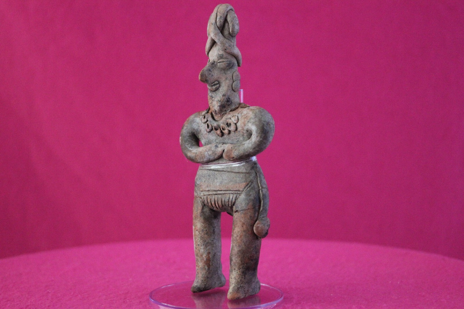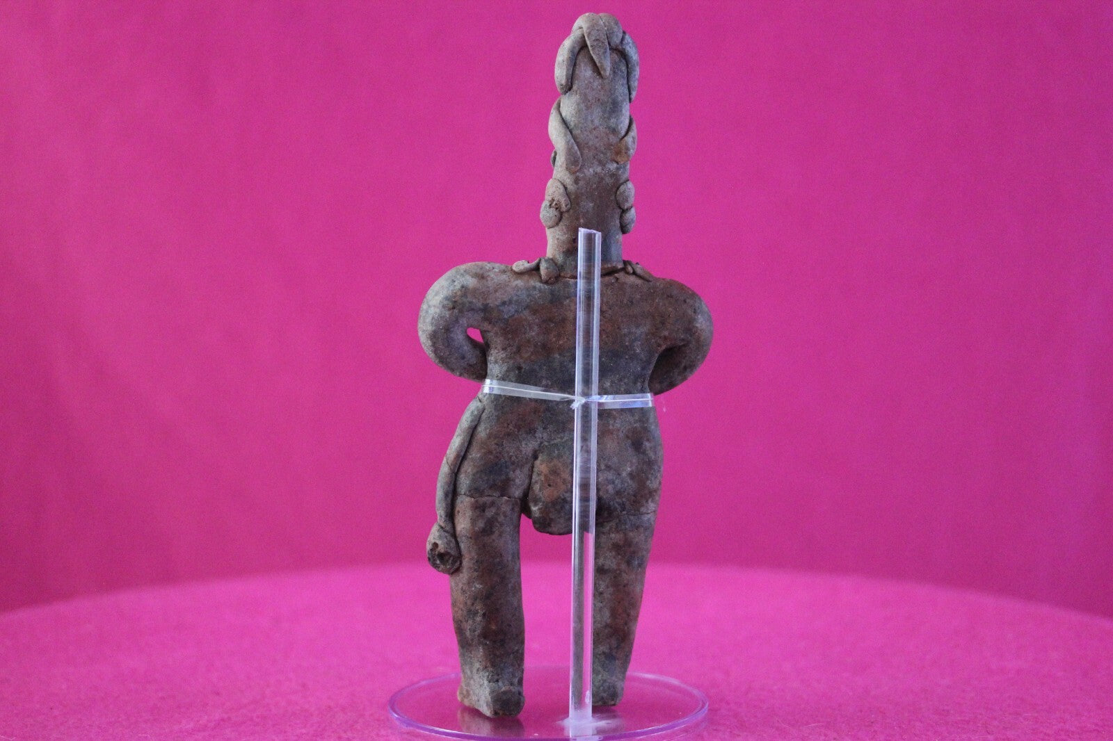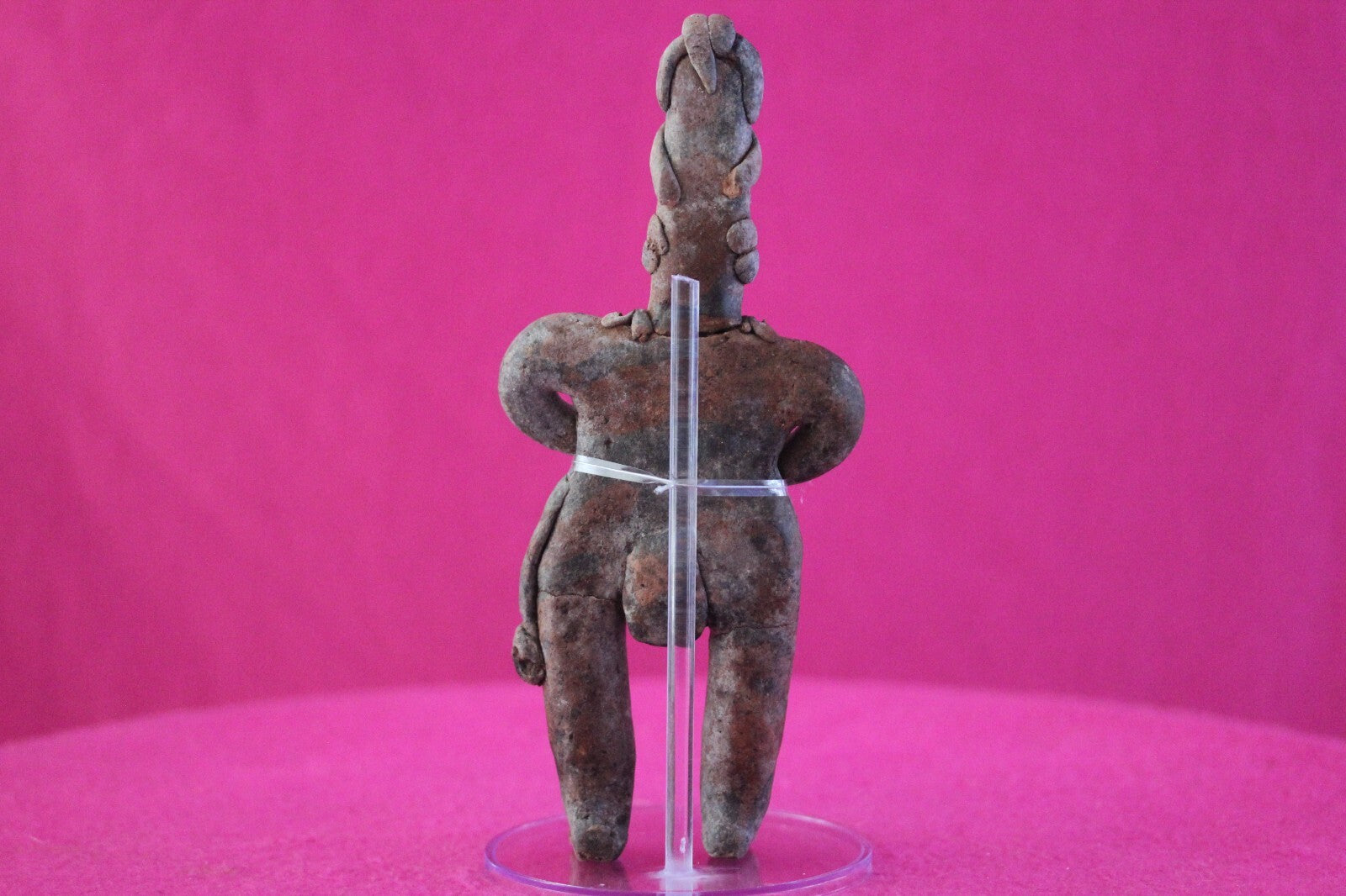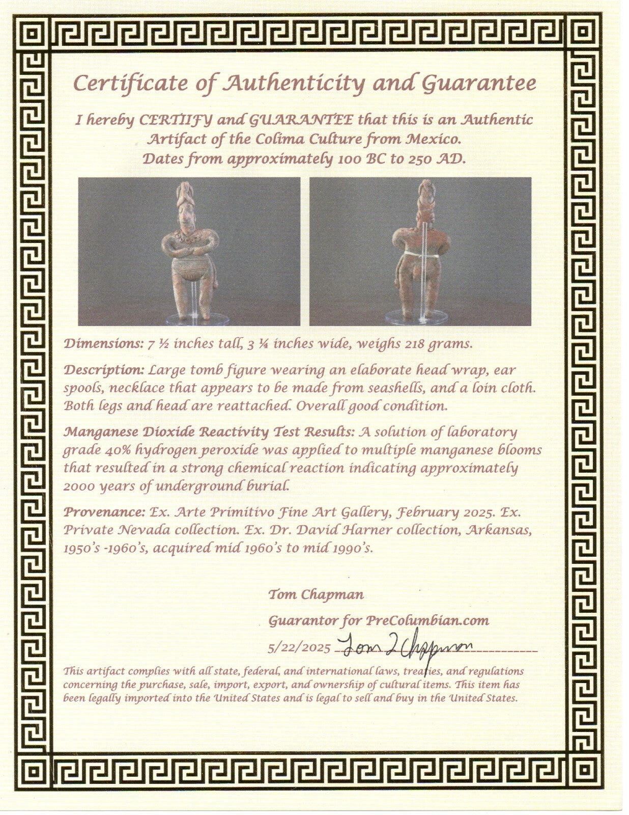 Dimensions: 7 ½ inches tall, 3 ¼ inches wide, weighs 218 grams.Description: Large tomb figure wearing an elaborate head wrap, ear spools, necklace that appears to be made from seashells, and a loin cloth. Both legs and head are reattached. Overall good condition.Manganese Dioxide Reactivity Test Results: A solution of laboratory grade 40% hydrogen peroxide was applied to multiple manganese blooms that resulted in a strong chemical reaction indicating approximately 2000 years of underground burial.Provenance: Ex. Arte Primitivo Fine Art Gallery, February 2025. Ex. Private Nevada collection. Ex. Dr. David Harner collection, Arkansas, 1950’s -1960’s, acquired mid 1960’s to mid 1990’s.
