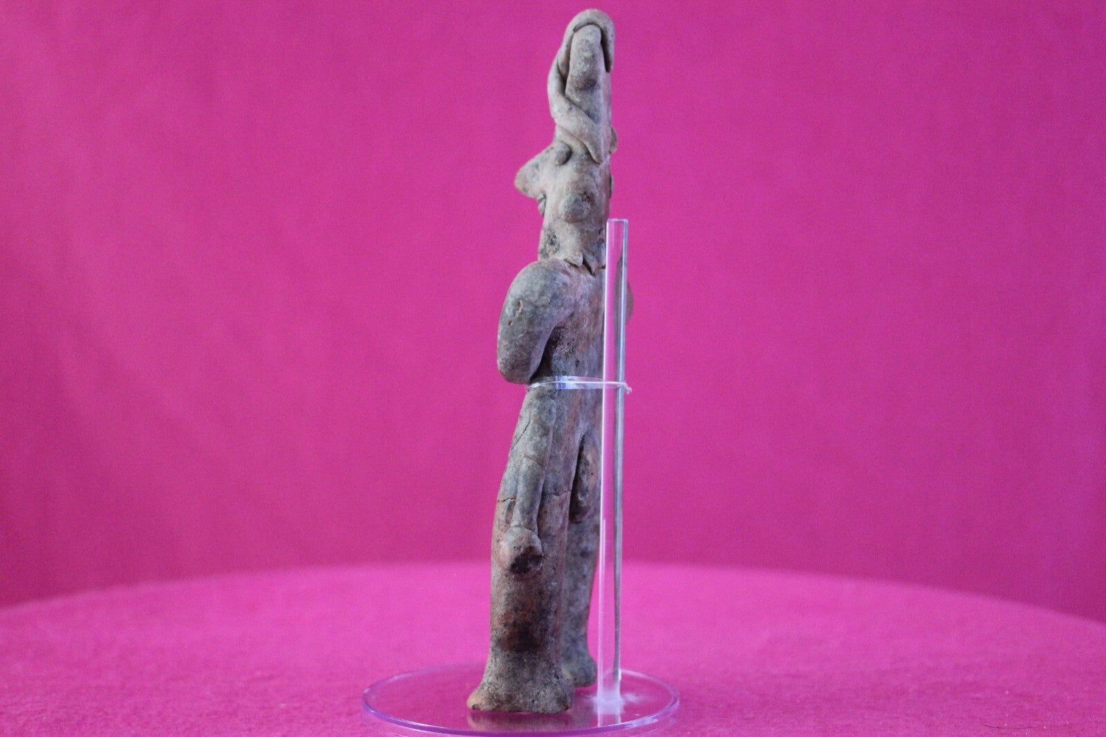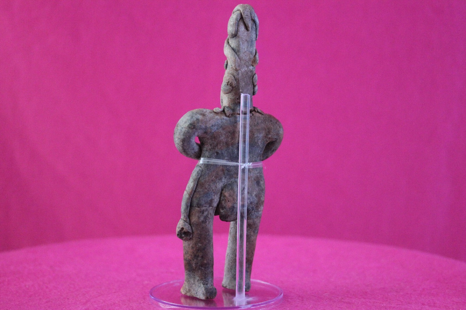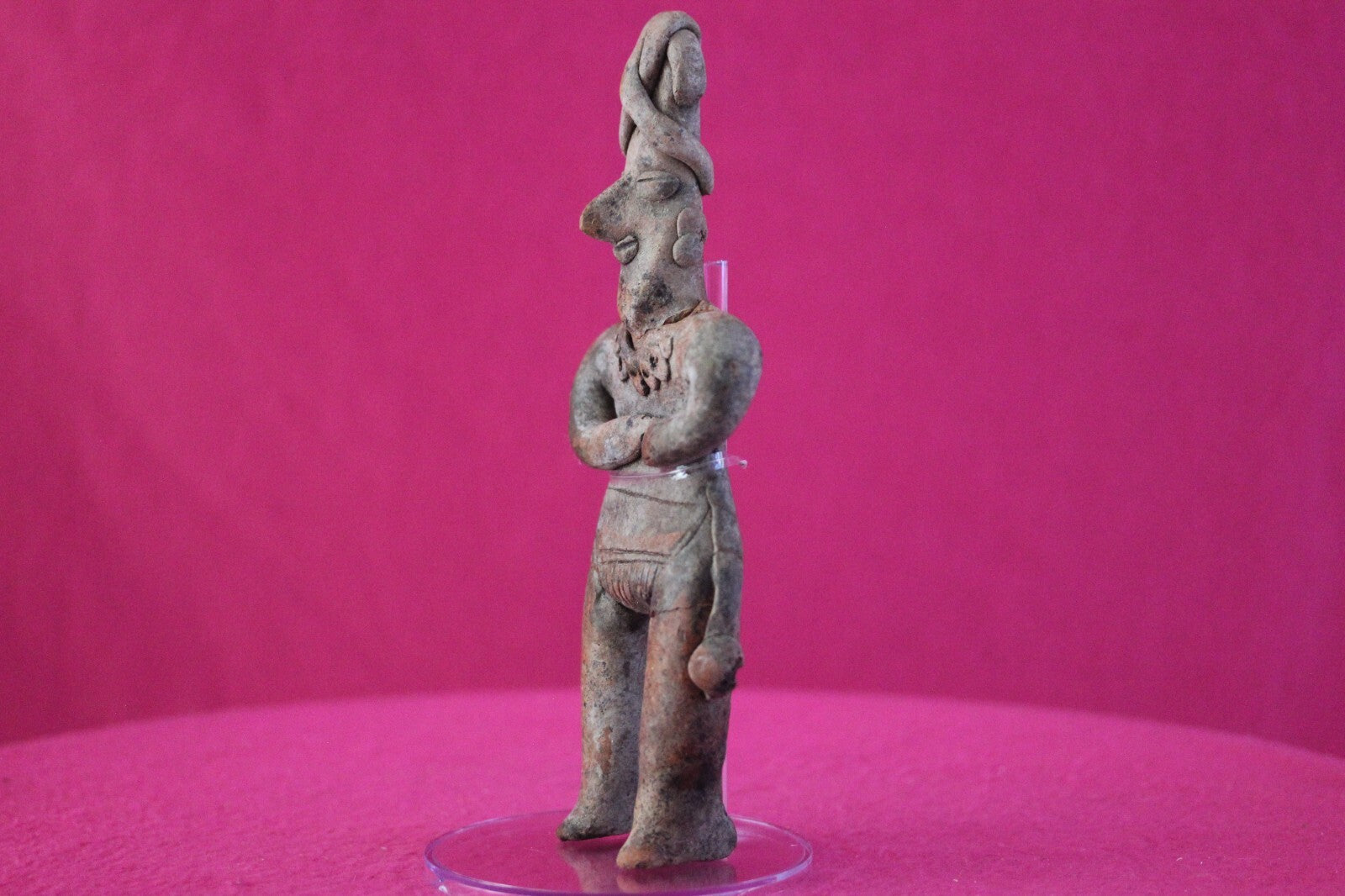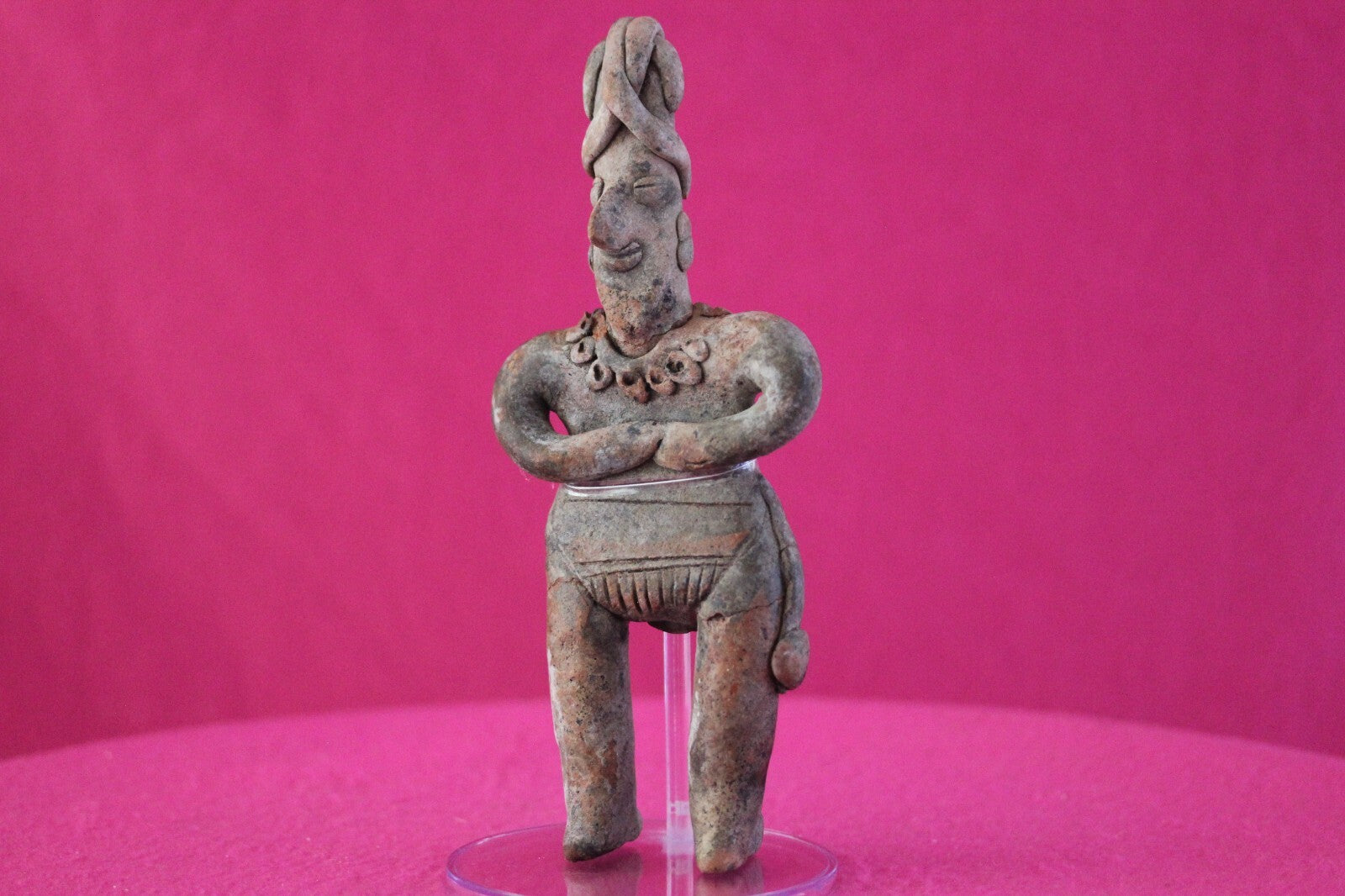 Dimensions: 7 ½ inches tall, 3 ¼ inches wide, weighs 218 grams.Description: Large tomb figure wearing an elaborate head wrap, ear spools, necklace that appears to be made from seashells, and a loin cloth. Both legs and head are reattached. Overall good condition.Manganese Dioxide Reactivity Test Results: A solution of laboratory grade 40% hydrogen peroxide was applied to multiple manganese blooms that resulted in a strong chemical reaction indicating approximately 2000 years of underground burial.Provenance: Ex. Arte Primitivo Fine Art Gallery, February 2025. Ex. Private Nevada collection. Ex. Dr. David Harner collection, Arkansas, 1950’s -1960’s, acquired mid 1960’s to mid 1990’s.