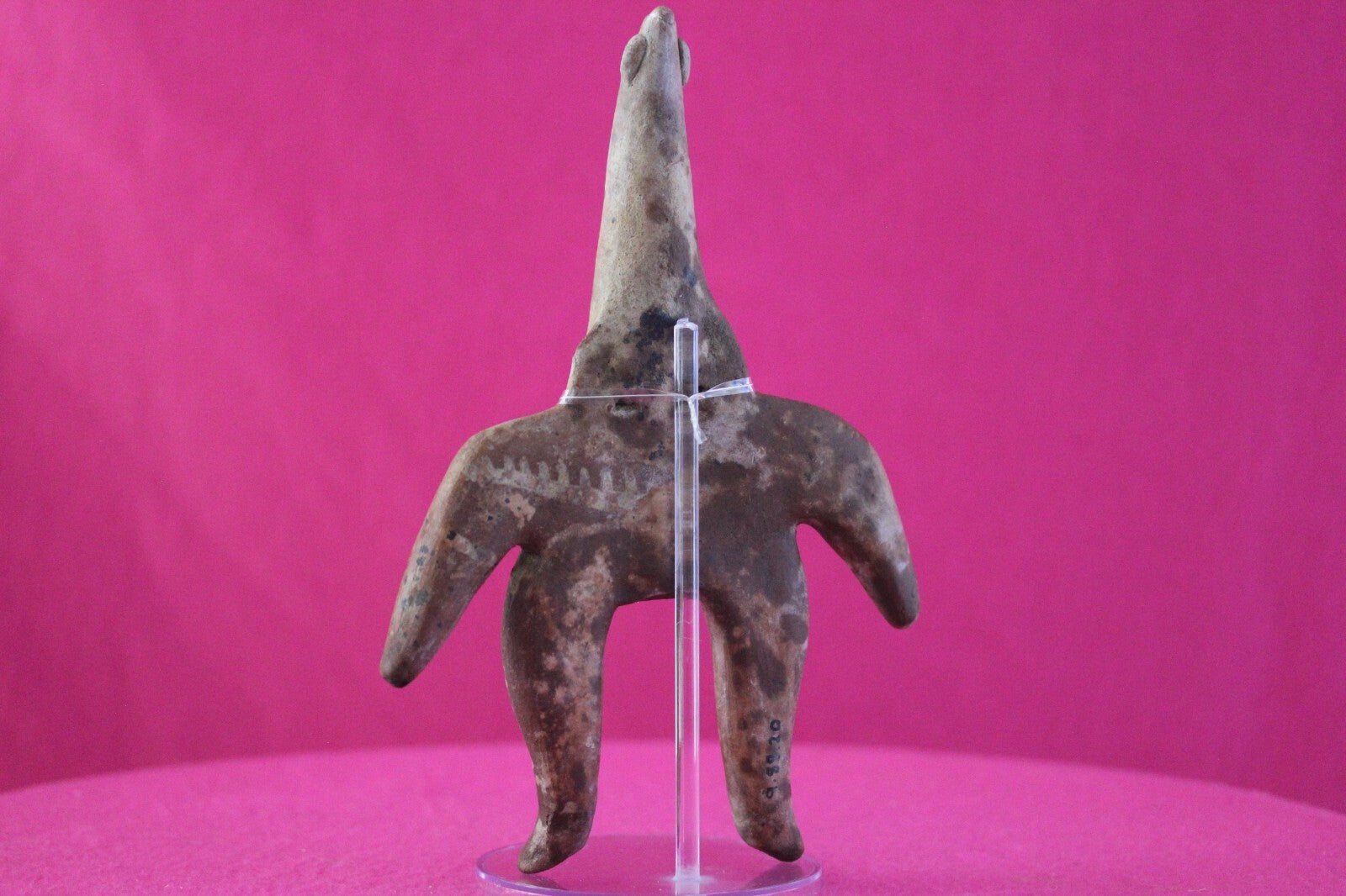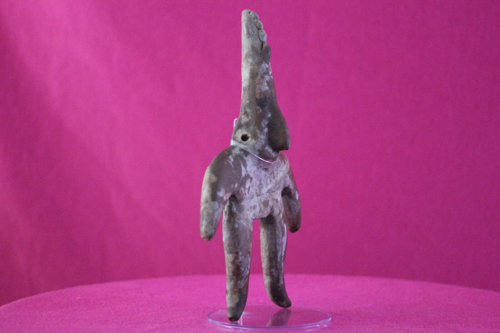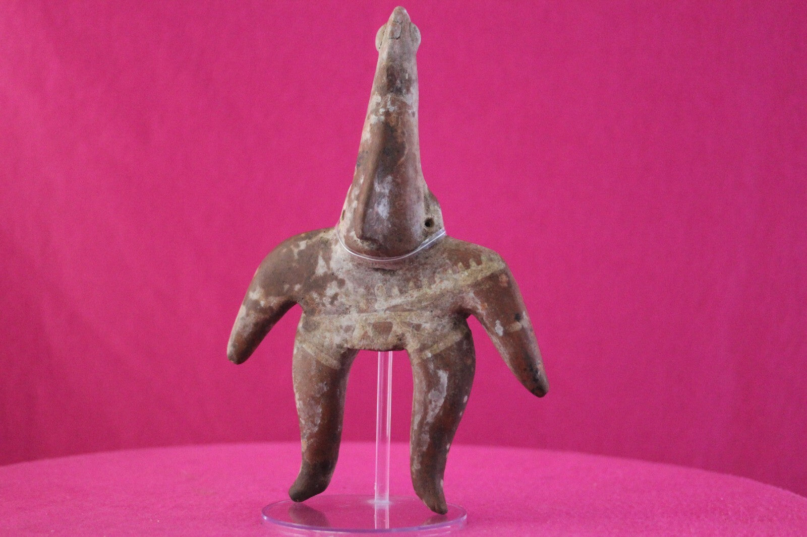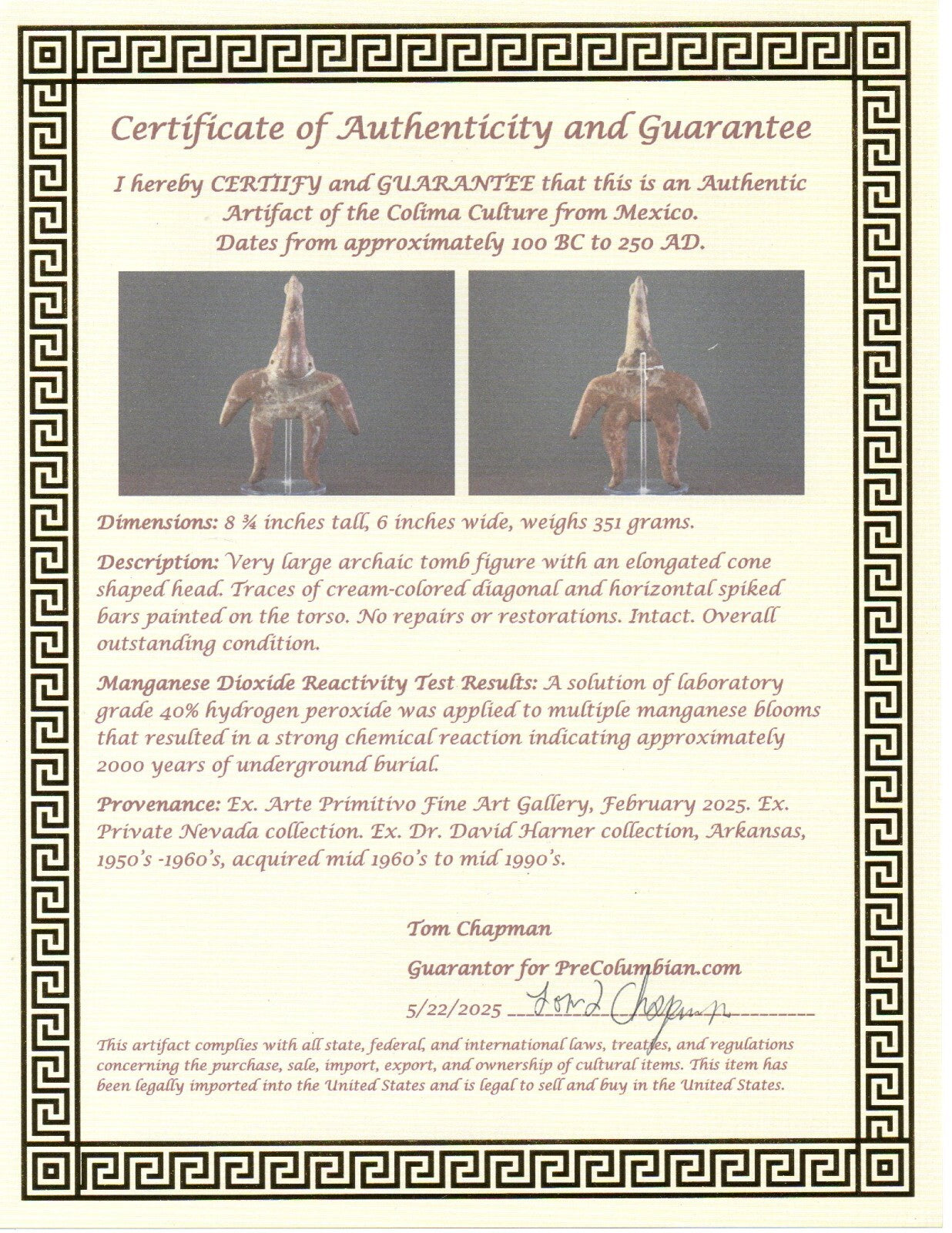 Dimensions: 8 ¾ inches tall, 6 inches wide, weighs 351 grams.Description: Very large archaic tomb figure with an elongated cone shaped head. Traces of cream-colored diagonal and horizontal spiked bars painted on the torso. No repairs or restorations. Intact. Overall outstanding condition.Manganese Dioxide Reactivity Test Results: A solution of laboratory grade 40% hydrogen peroxide was applied to multiple manganese blooms that resulted in a strong chemical reaction indicating approximately 2000 years of underground burial.Provenance: Ex. Arte Primitivo Fine Art Gallery, February 2025. Ex. Private Nevada collection. Ex. Dr. David Harner collection, Arkansas, 1950’s -1960’s, acquired mid 1960’s to mid 1990’s.