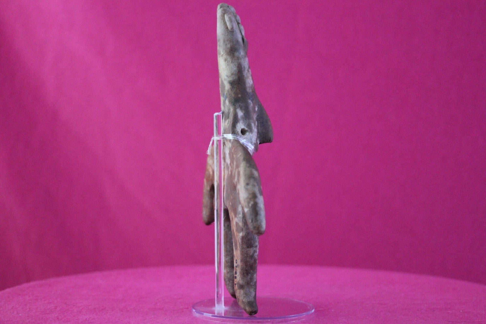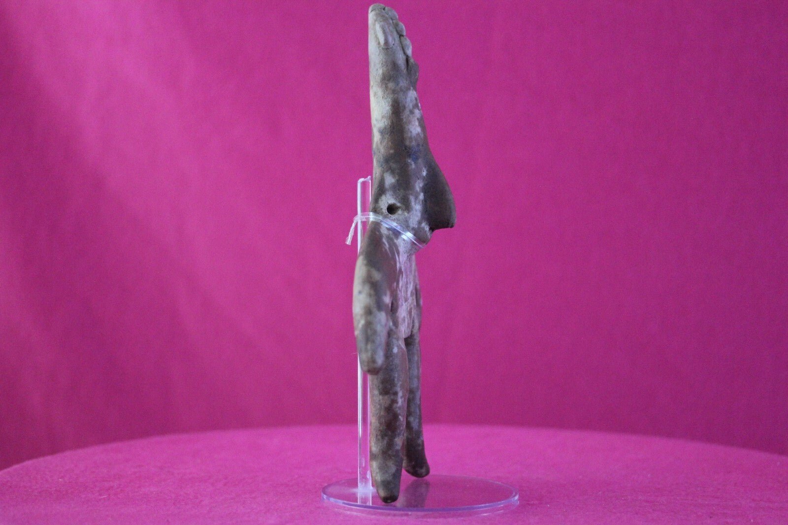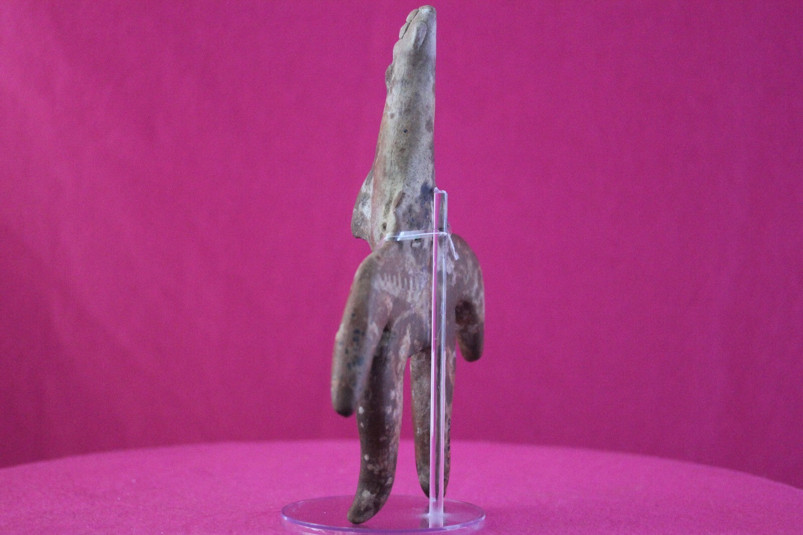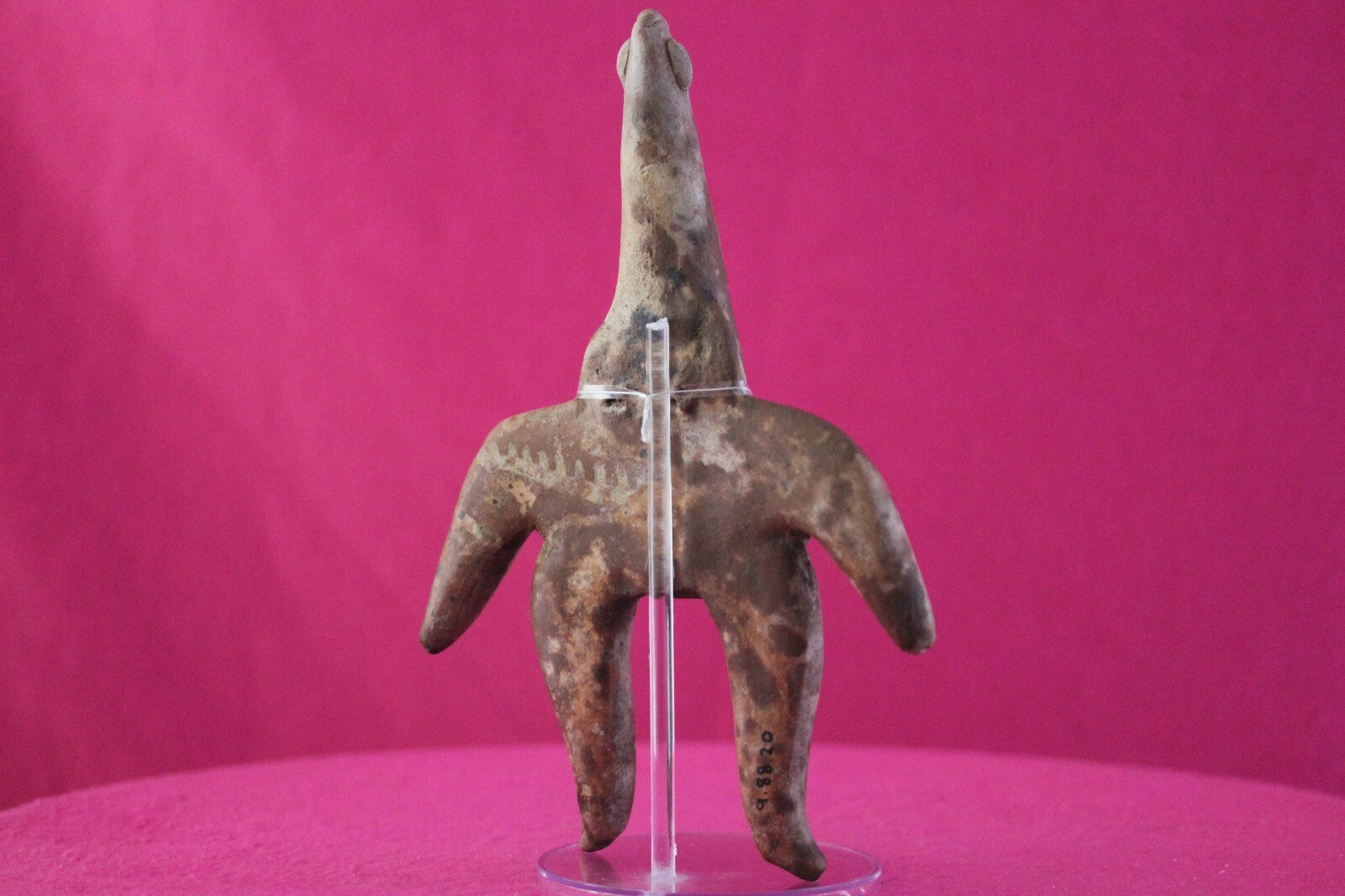 Dimensions: 8 ¾ inches tall, 6 inches wide, weighs 351 grams.Description: Very large archaic tomb figure with an elongated cone shaped head. Traces of cream-colored diagonal and horizontal spiked bars painted on the torso. No repairs or restorations. Intact. Overall outstanding condition.Manganese Dioxide Reactivity Test Results: A solution of laboratory grade 40% hydrogen peroxide was applied to multiple manganese blooms that resulted in a strong chemical reaction indicating approximately 2000 years of underground burial.Provenance: Ex. Arte Primitivo Fine Art Gallery, February 2025. Ex. Private Nevada collection. Ex. Dr. David Harner collection, Arkansas, 1950’s -1960’s, acquired mid 1960’s to mid 1990’s.