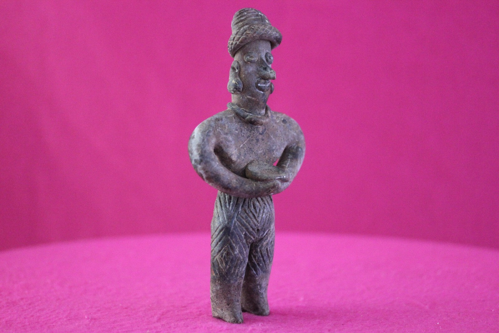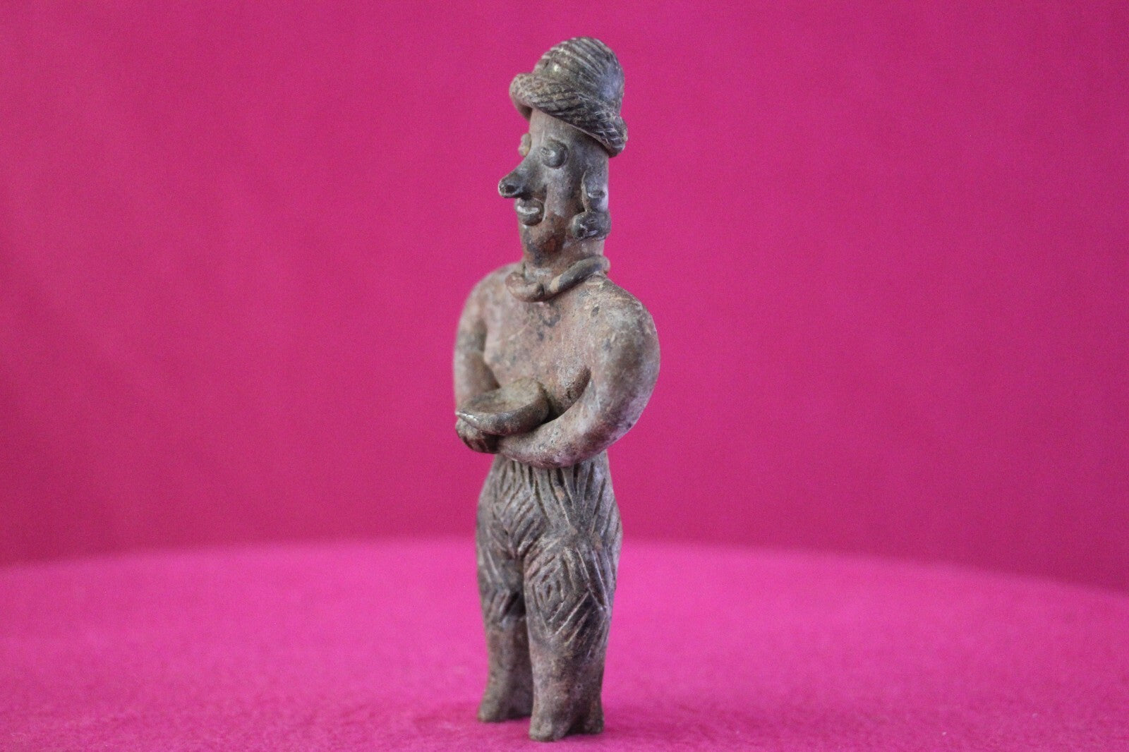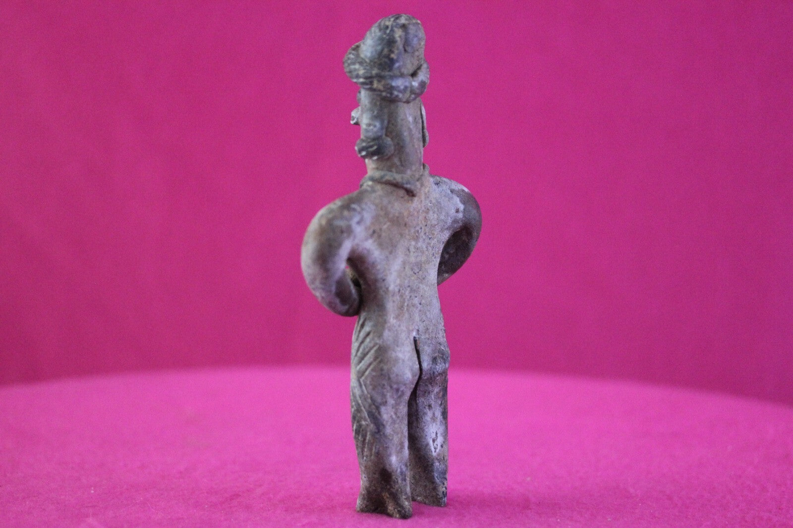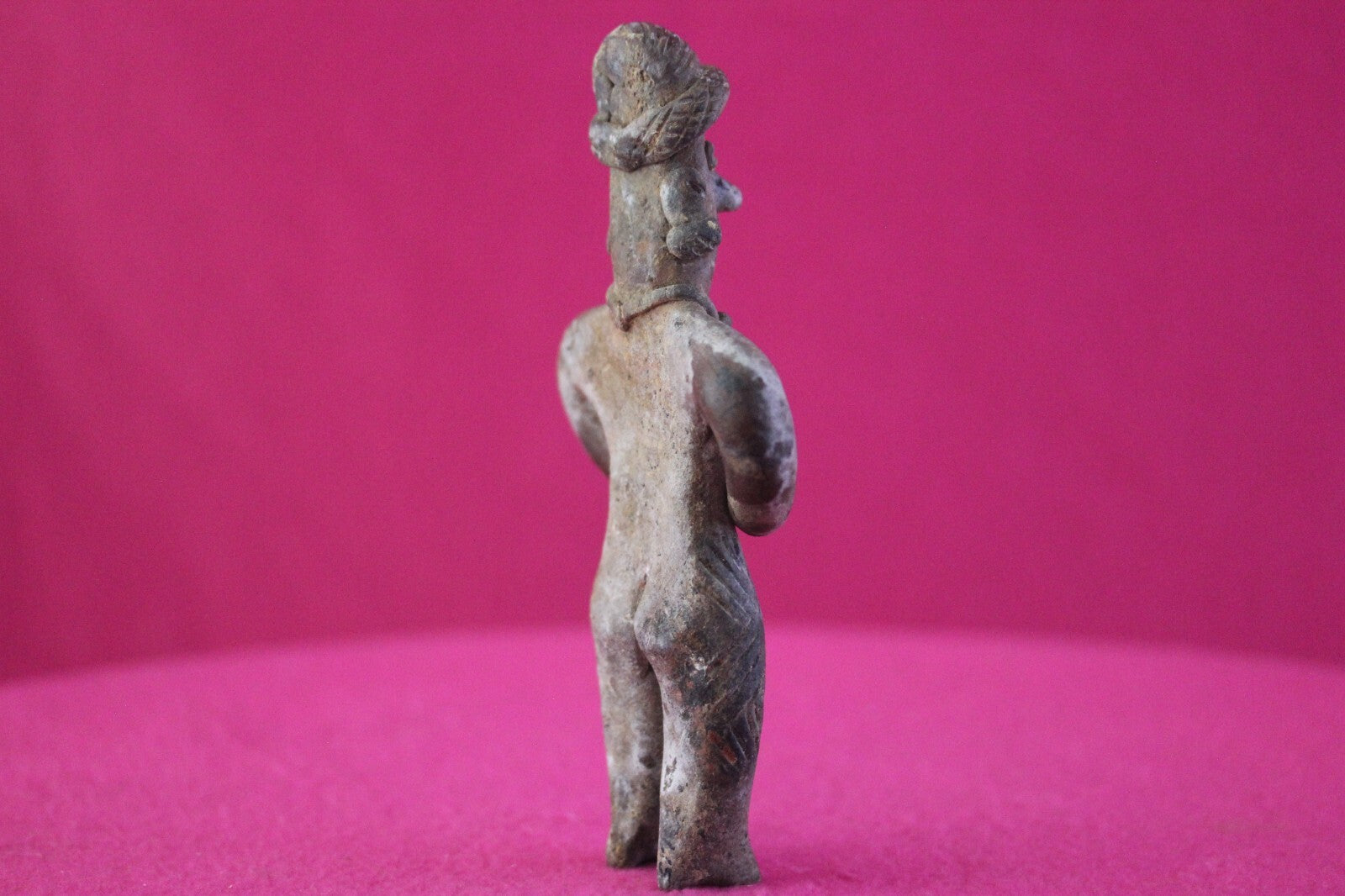 Dimensions: 6 ¼ inches tall, 3 inches wide, weighs 164 grams.Description: Female tomb figure wearing a very elaborate head wrap, necklace, and large ear spools. elaborate head wrap and necklace, large ear spools, and a loin cloth. Decorative incised clothing, holding a plate. No repairs or restorations. Intact. Overall outstanding condition.Manganese Dioxide Reactivity Test Results: A solution of laboratory grade 40% hydrogen peroxide was applied to multiple manganese blooms that resulted in a strong chemical reaction indicating approximately 2000 years of underground burial.Provenance: Ex. Arte Primitivo Fine Art Gallery, February 2025. Ex. Private Nevada collection. Ex. Dr. David Harner collection, Arkansas, 1950’s -1960’s, acquired mid 1960’s to mid 1990’s.