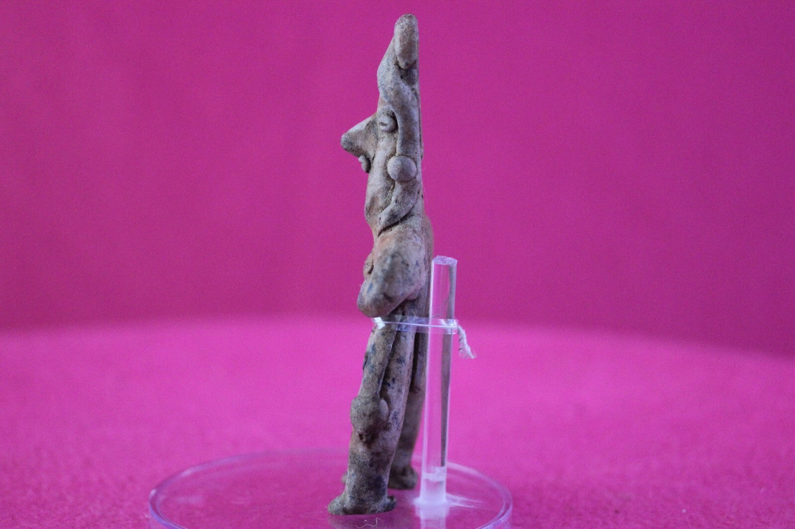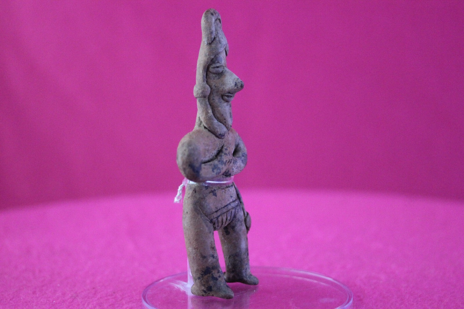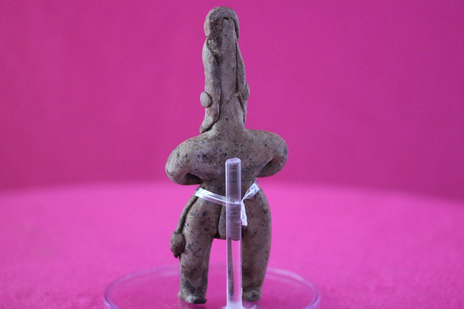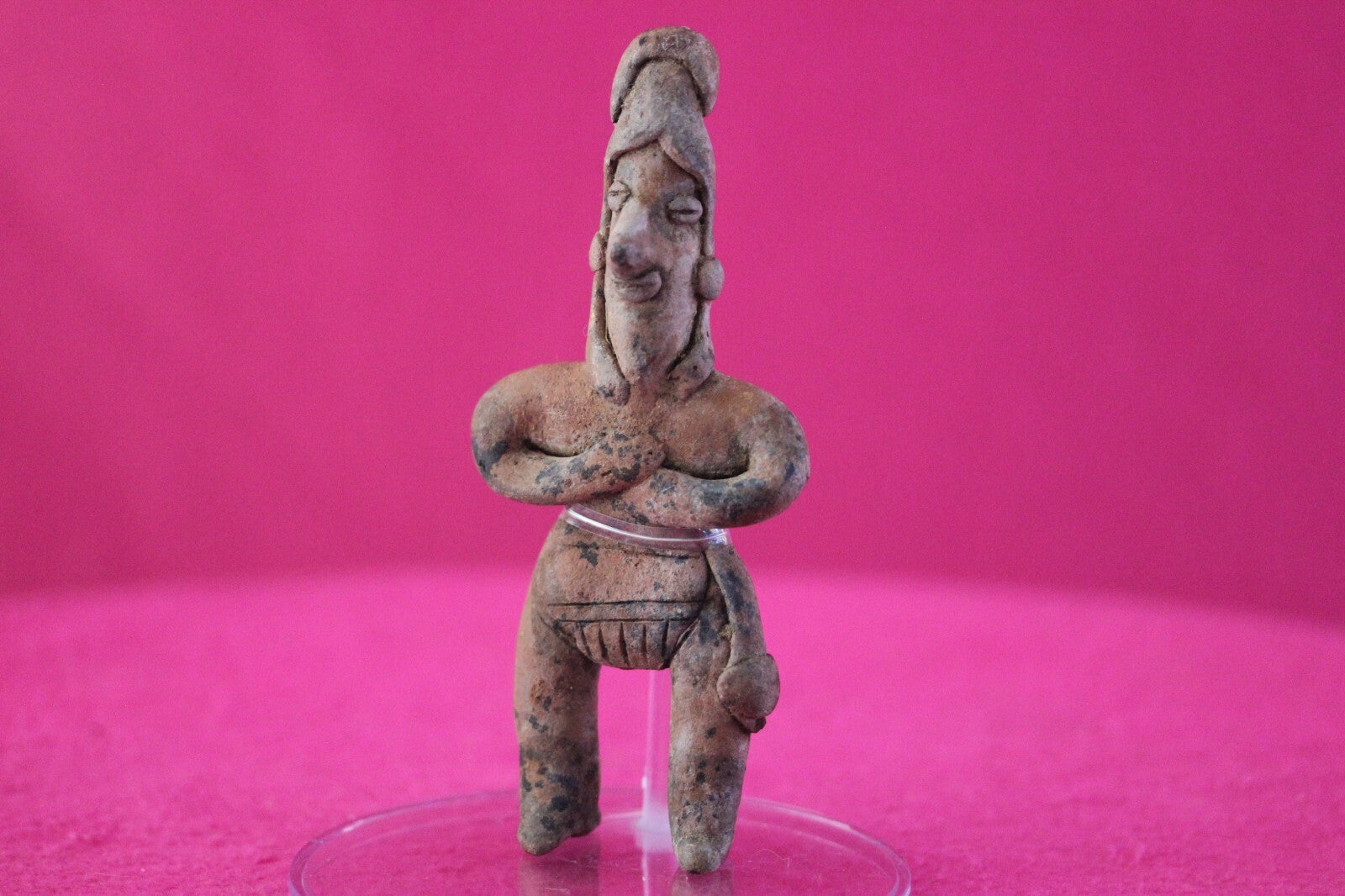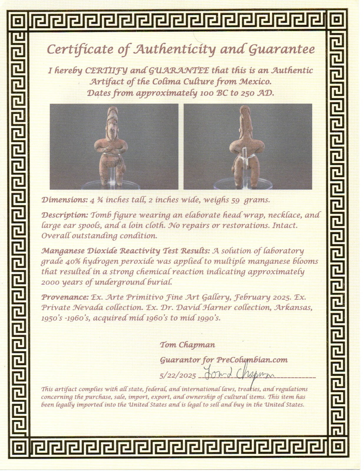 Dimensions: 4 ¾ inches tall, 2 inches wide, weighs 59 grams.Description: Tomb figure wearing an elaborate head wrap, necklace, and large ear spools, and a loin cloth. No repairs or restorations. Intact. Overall outstanding condition.Manganese Dioxide Reactivity Test Results: A solution of laboratory grade 40% hydrogen peroxide was applied to multiple manganese blooms that resulted in a strong chemical reaction indicating approximately 2000 years of underground burial.Provenance: Ex. Arte Primitivo Fine Art Gallery, February 2025. Ex. Private Nevada collection. Ex. Dr. David Harner collection, Arkansas, 1950’s -1960’s, acquired mid 1960’s to mid 1990’s.
