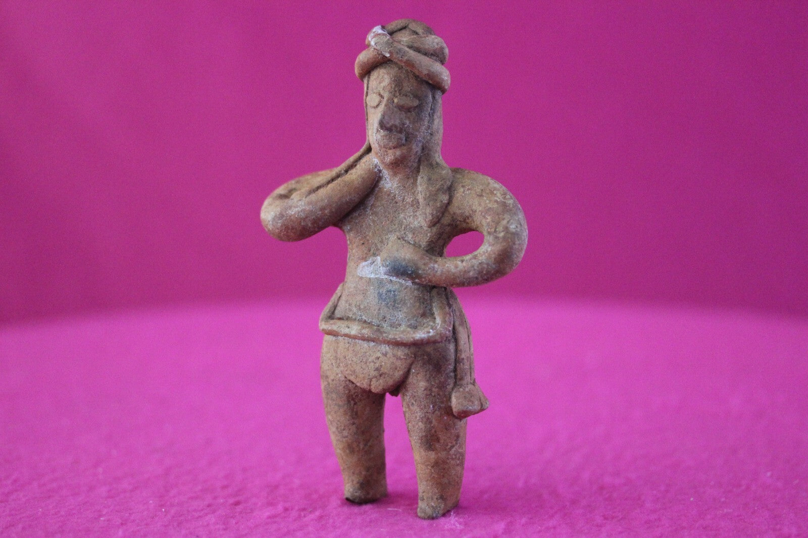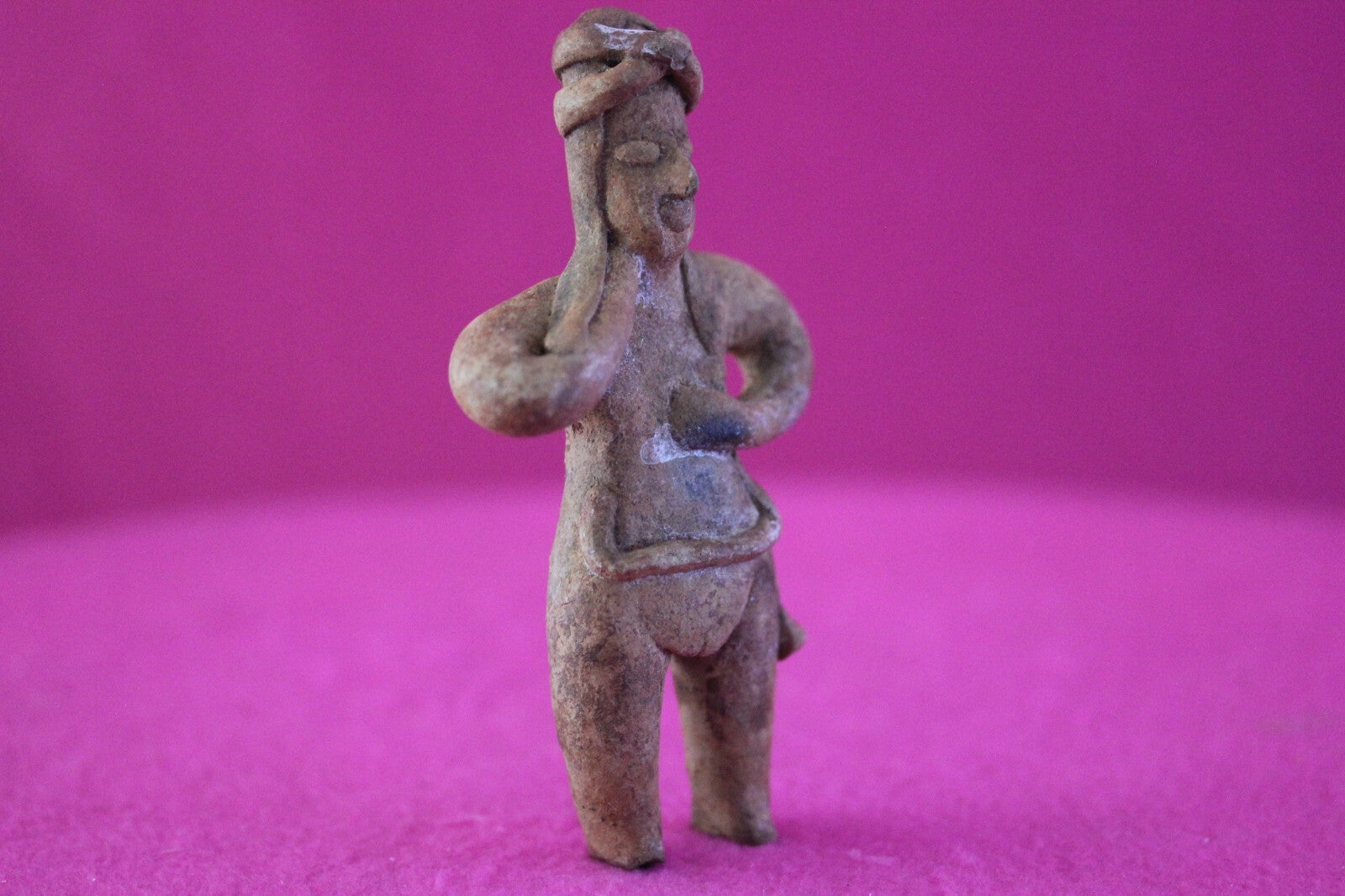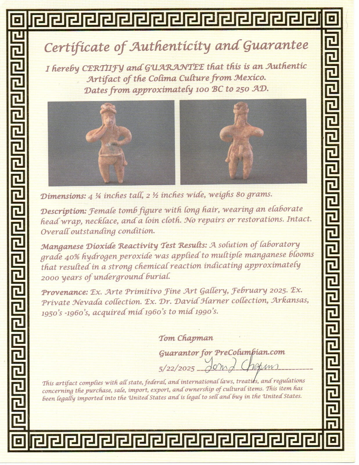 Dimensions: 4 ¼ inches tall, 2 ½ inches wide, weighs 80 grams.Description: Female tomb figure with long hair, wearing an elaborate head wrap, necklace, and a loin cloth. No repairs or restorations. Intact. Overall outstanding condition.Manganese Dioxide Reactivity Test Results: A solution of laboratory grade 40% hydrogen peroxide was applied to multiple manganese blooms that resulted in a strong chemical reaction indicating approximately 2000 years of underground burial.Provenance: Ex. Arte Primitivo Fine Art Gallery, February 2025. Ex. Private Nevada collection. Ex. Dr. David Harner collection, Arkansas, 1950’s -1960’s, acquired mid 1960’s to mid 1990’s.