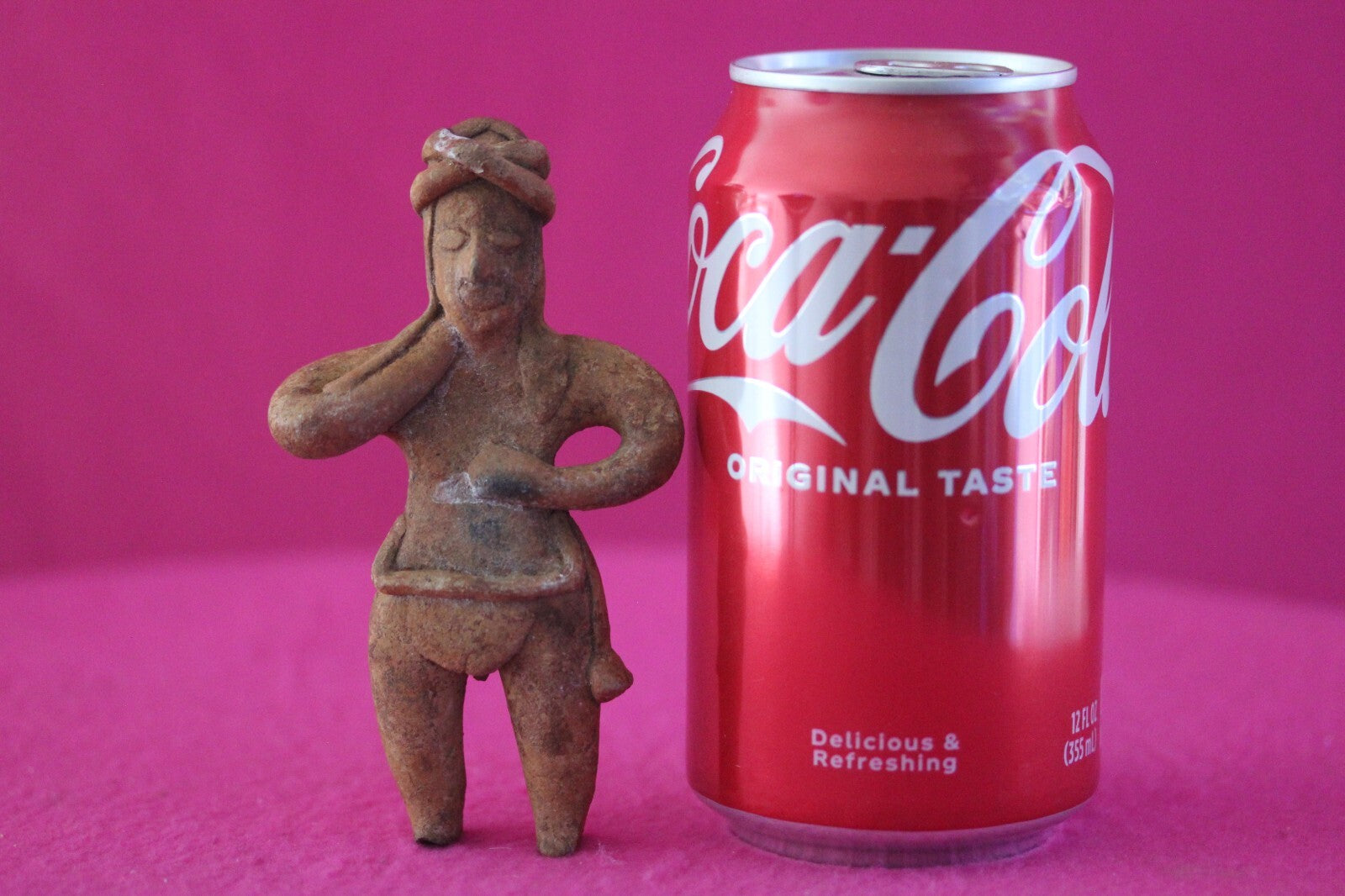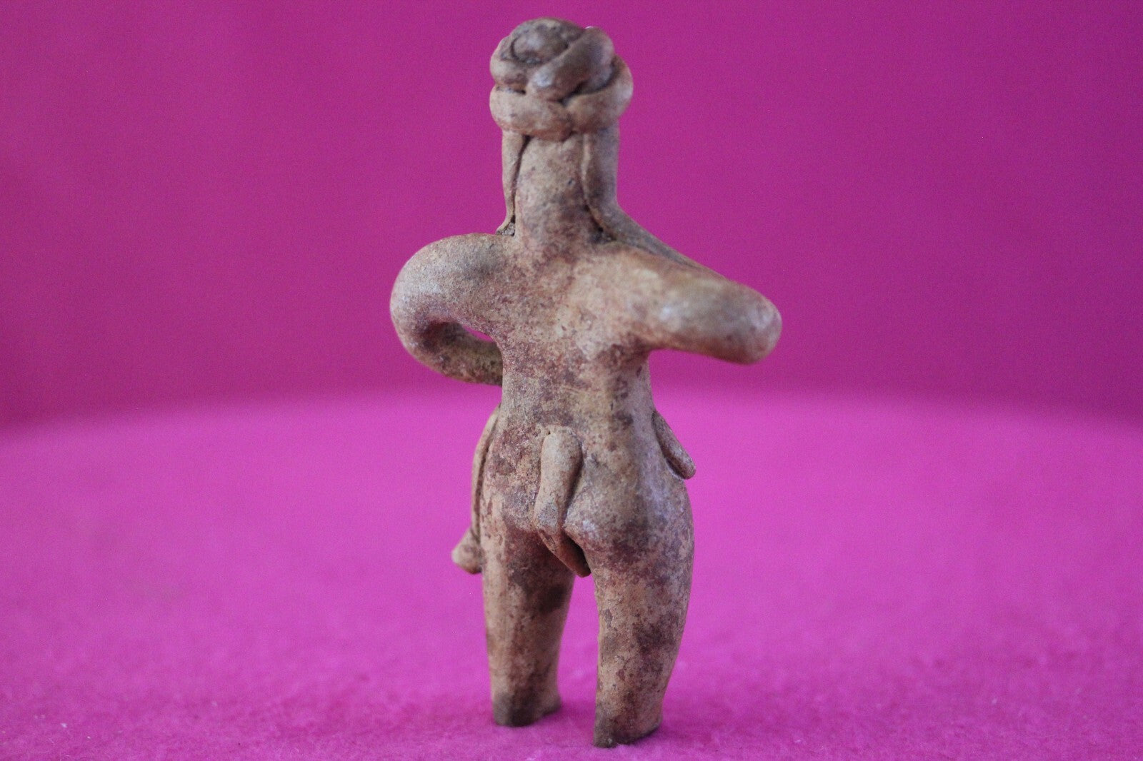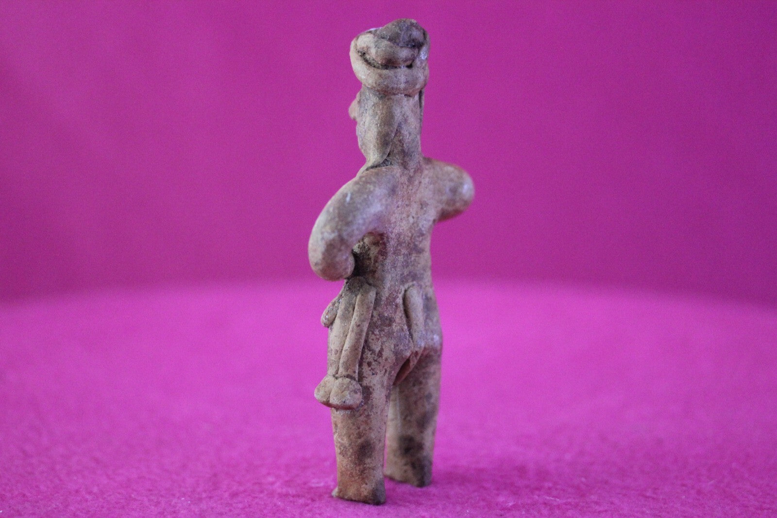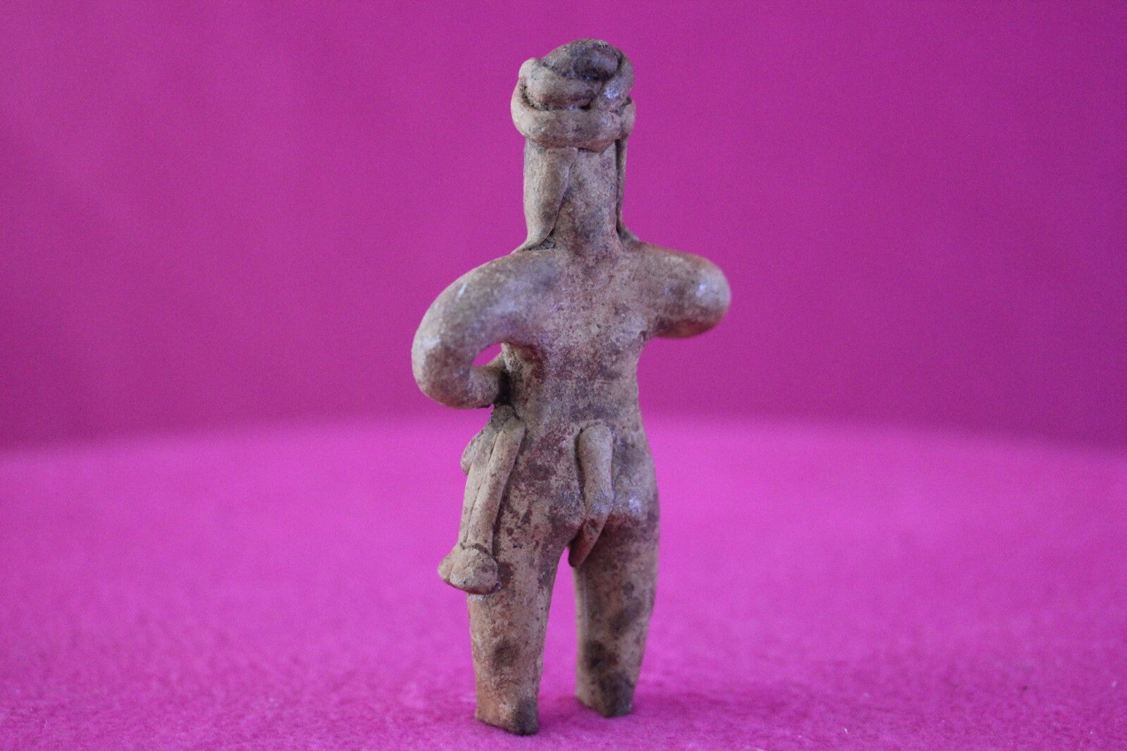 Dimensions: 4 ¼ inches tall, 2 ½ inches wide, weighs 80 grams.Description: Female tomb figure with long hair, wearing an elaborate head wrap, necklace, and a loin cloth. No repairs or restorations. Intact. Overall outstanding condition.Manganese Dioxide Reactivity Test Results: A solution of laboratory grade 40% hydrogen peroxide was applied to multiple manganese blooms that resulted in a strong chemical reaction indicating approximately 2000 years of underground burial.Provenance: Ex. Arte Primitivo Fine Art Gallery, February 2025. Ex. Private Nevada collection. Ex. Dr. David Harner collection, Arkansas, 1950’s -1960’s, acquired mid 1960’s to mid 1990’s.