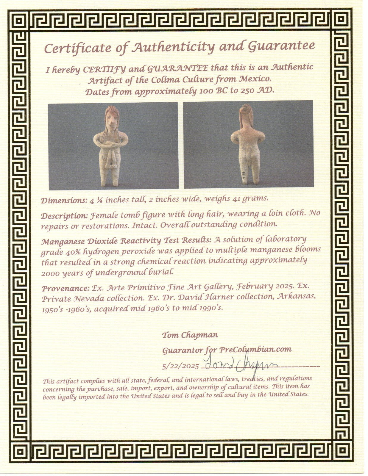 Dimensions: 4 ¼ inches tall, 2 inches wide, weighs 41 grams.Description: Female tomb figure with long hair, wearing a loin cloth. No repairs or restorations. Intact. Overall outstanding condition.Manganese Dioxide Reactivity Test Results: A solution of laboratory grade 40% hydrogen peroxide was applied to multiple manganese blooms that resulted in a strong chemical reaction indicating approximately 2000 years of underground burial.Provenance: Ex. Arte Primitivo Fine Art Gallery, February 2025. Ex. Private Nevada collection. Ex. Dr. David Harner collection, Arkansas, 1950’s -1960’s, acquired mid 1960’s to mid 1990’s.