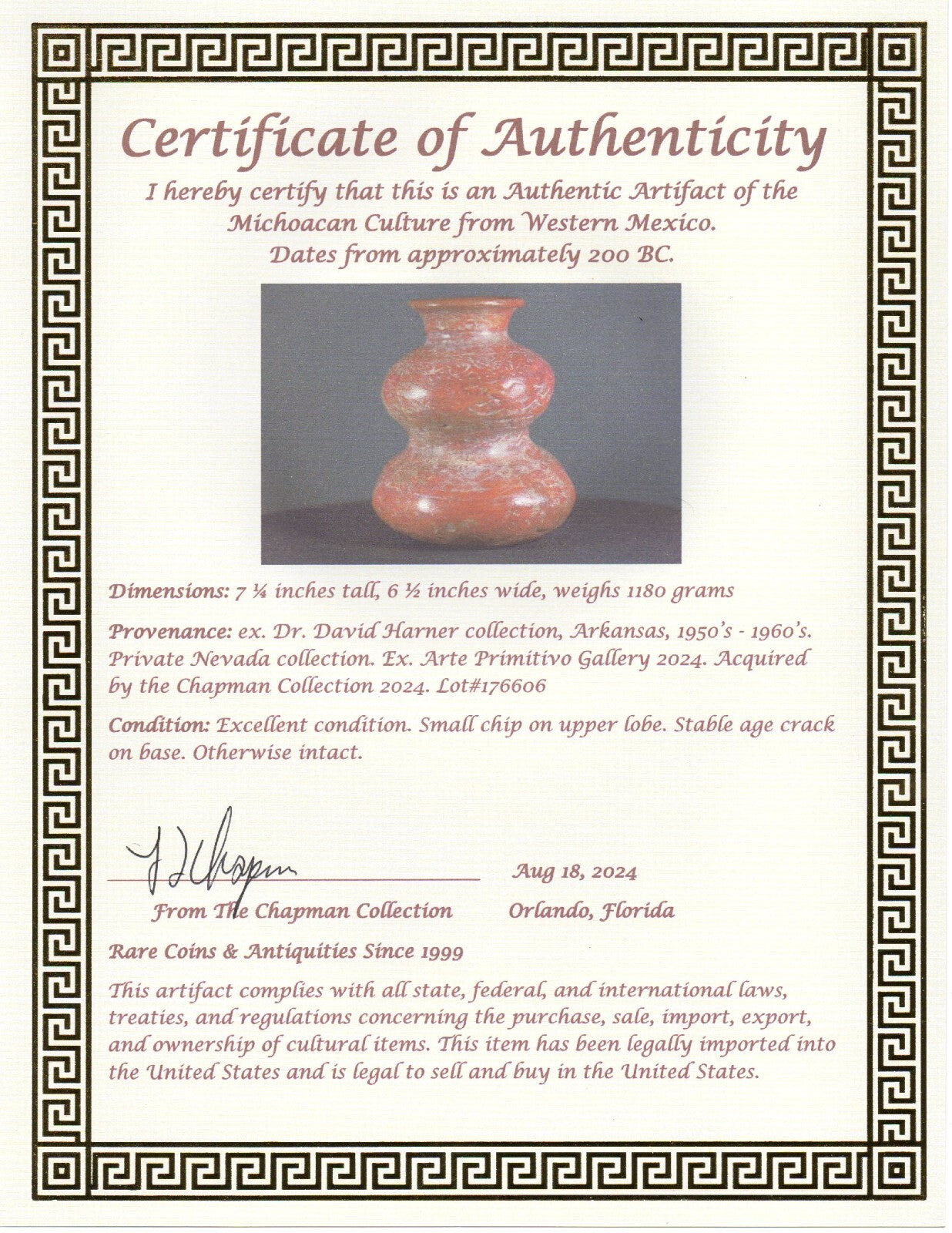 Acquired from the world renowned Arte Primitivo Gallery in Downtown Manhattan, New York City. This is the most prestigious gallery of ancient artifacts in the United States. Artifacts from Arte Primitivo are the most sought after in the world. They are instantly recognized and respected by antiquities dealers and collectors alike as being the best of the best. Artifacts that are authenticated by Arte Primitivo instantly increase in value due to their expertise and decades of experience. They are the go to experts when it comes to ancient art. Provenance: ex. Dr. David Harner collection, Arkansas, 1950’s - 1960’s. Private Nevada collection. Ex. Arte Primitivo Gallery 2024. Acquired by the Chapman Collection 2024. Lot#176606. Condition: Excellent condition. Small chip on upper lobe. Stable age crack on base. Otherwise intact.