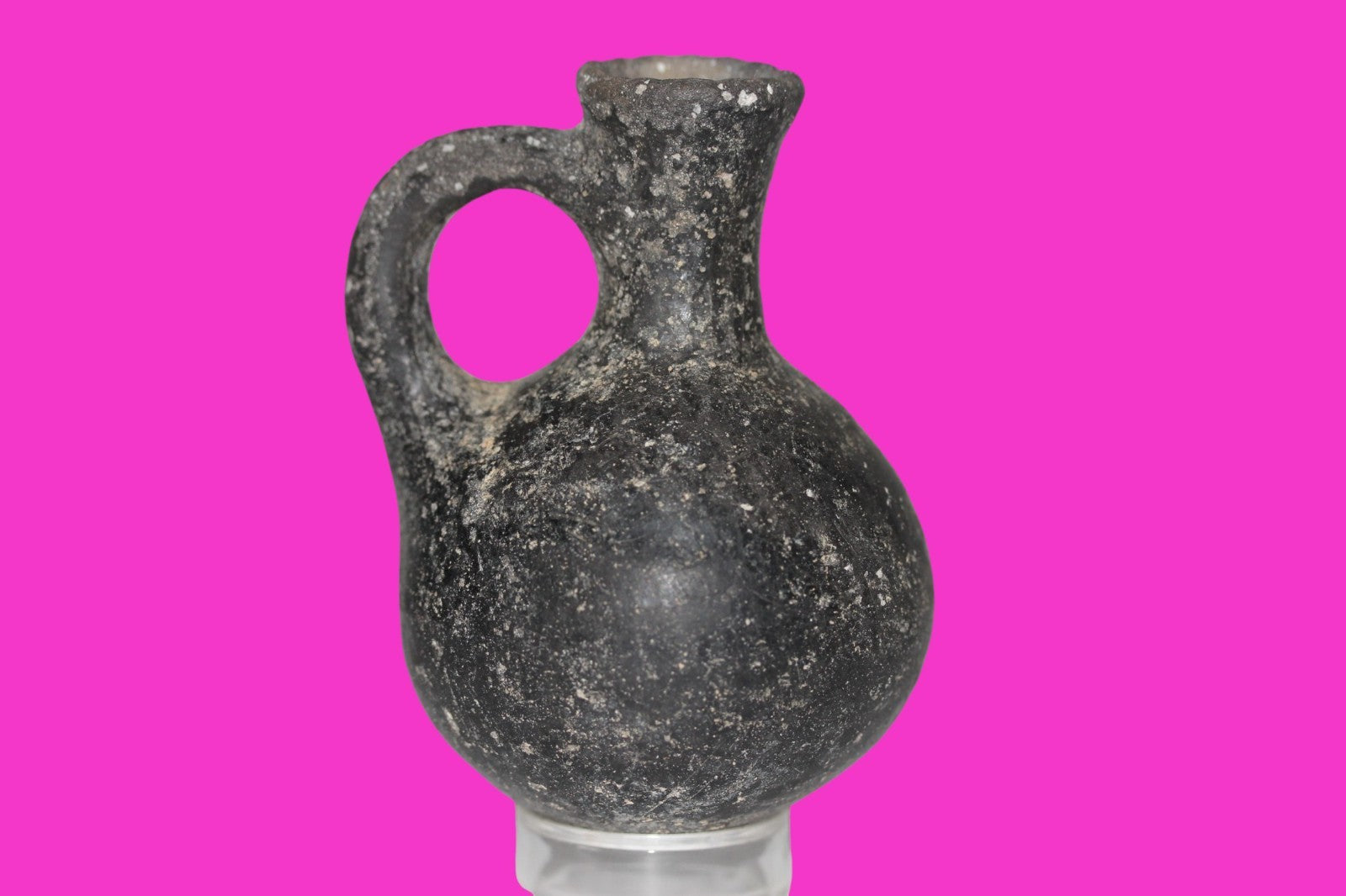 Dimensions: 3 ½ inches tall, 2 ¾ inches wide, weighs 85 grams Provenance: Ex. Private Jerusalem collection, Acquired in the aftermath of the 1967 Six Day War. Acquired by John McIntosh, MSE, MBA, Ancient Artifacts & Treasures, Winter Park, Florida in 2022. Acquired by The Artifact City collection in 2025. Description: Blackware rounded bottom juglet. Mineral deposits indicative of approximately 3000 years of underground burial. Small rim chips and surface loss. No repairs or restorations found. Overall Outstanding condition. King David is often looked upon as the most successful military conqueror in the history of the Israelite nation. By the end of his reign in 971 BC, the boundaries of Israel and the neighboring vassal kingdoms who paid tribute to David stretched across the Fertile Crescent from the Wadi of Egypt to the River Euphrates.