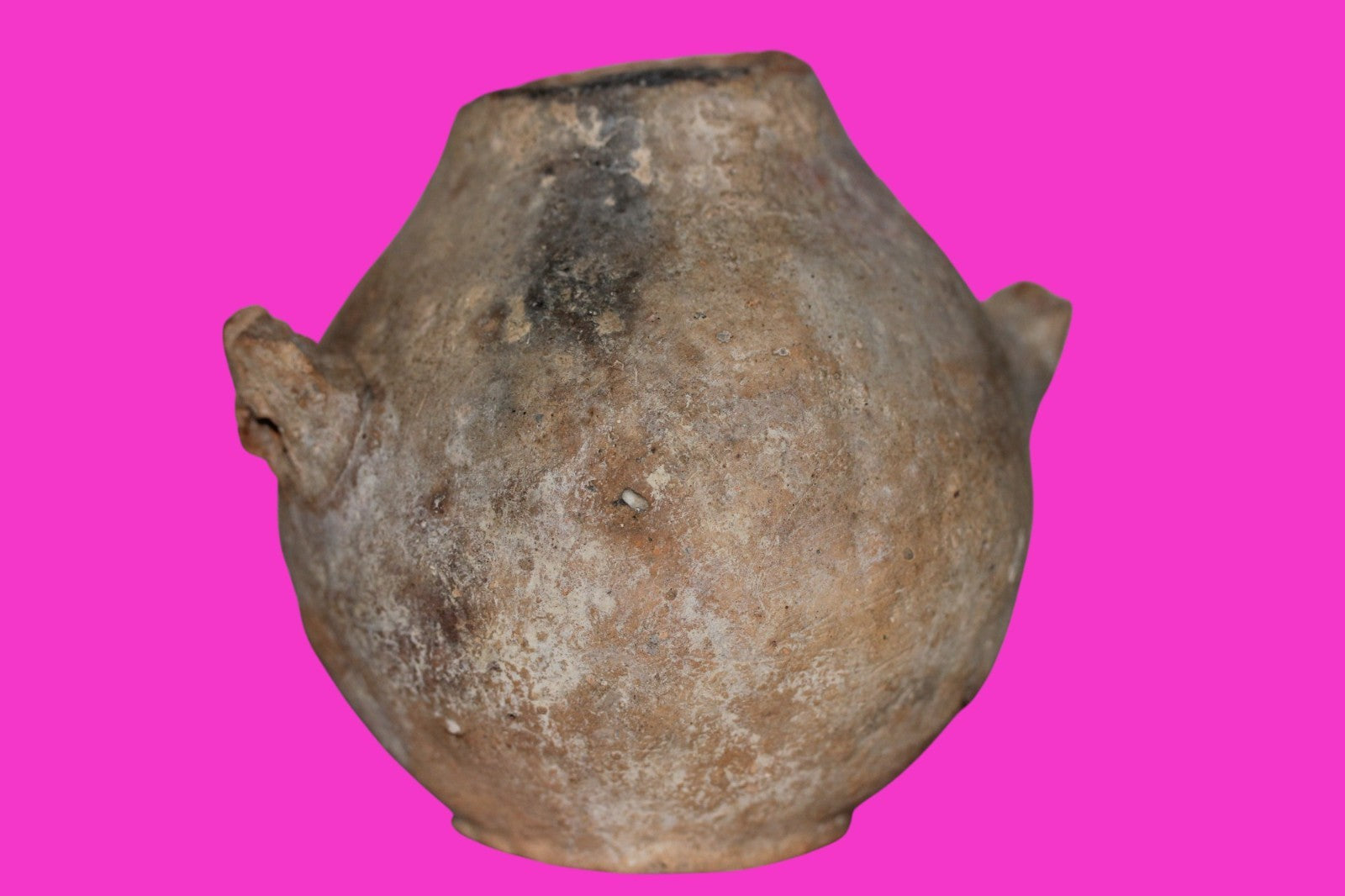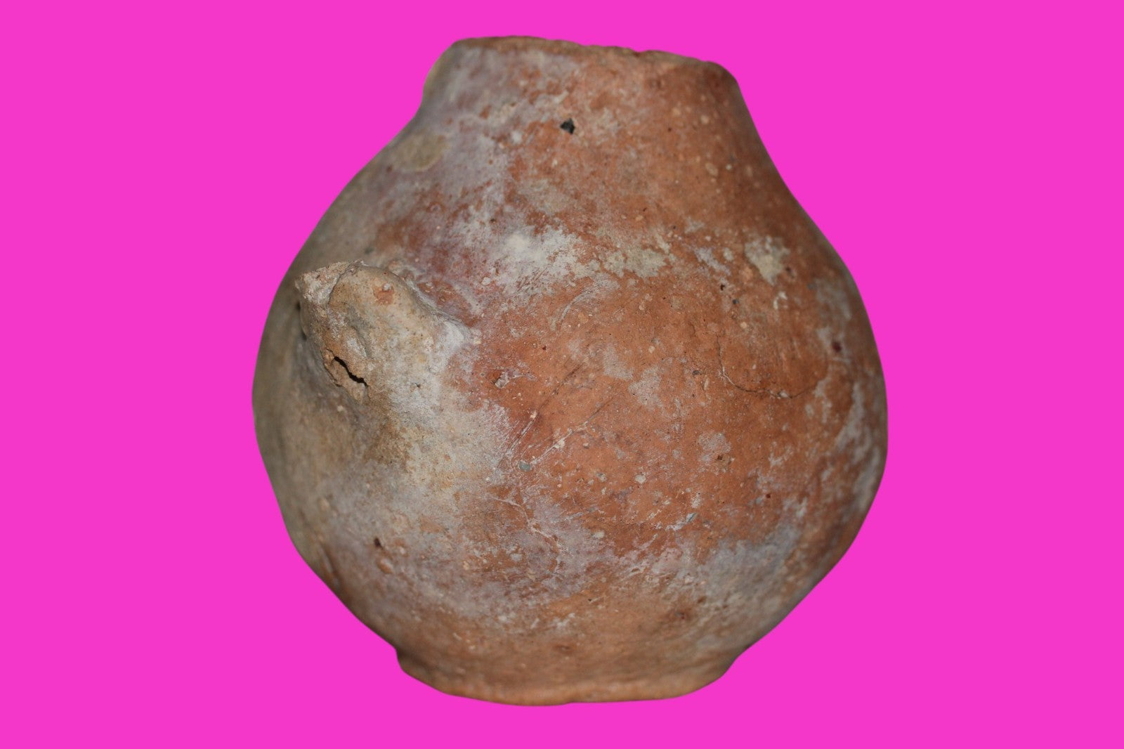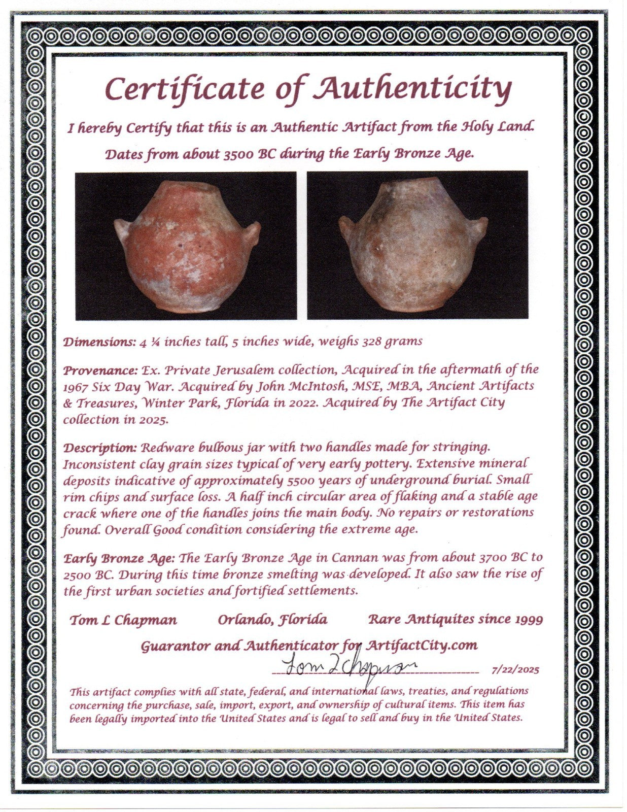 Dimensions: 4 ¼ inches tall, 5 inches wide, weighs 328 grams Provenance: Ex. Private Jerusalem collection, Acquired in the aftermath of the 1967 Six Day War. Acquired by John McIntosh, MSE, MBA, Ancient Artifacts & Treasures, Winter Park, Florida in 2022. Acquired by The Artifact City collection in 2025. Description: Redware bulbous jar with two handles made for stringing. Inconsistent clay grain sizes typical of very early pottery. Extensive mineral deposits indicative of approximately 5500 years of underground burial. Small rim chips and surface loss. A half inch circular area of flaking and a stable age crack where one of the handles joins the main body. No repairs or restorations found. Overall Good condition considering the extreme age. Early Bronze Age: The Early Bronze Age in Cannan was from about 3700 BC to 2500 BC. During this time bronze smelting was developed. It also saw the rise of the first urban societies and fortified settlements.