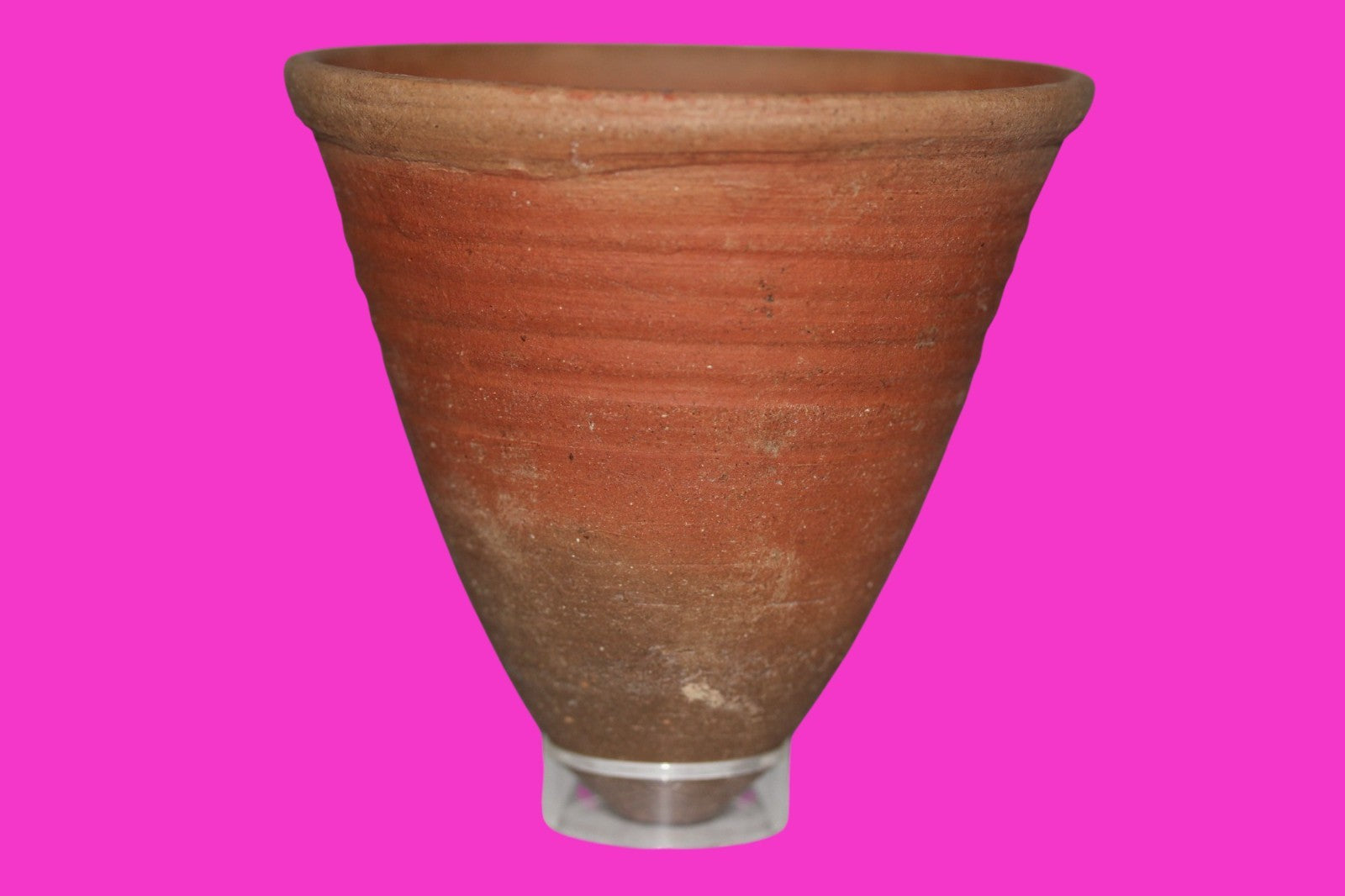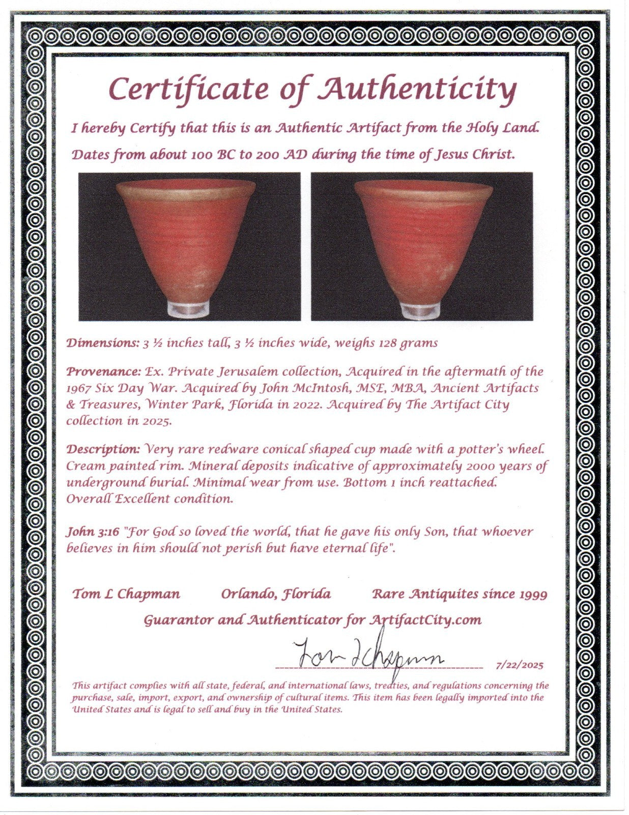 Dimensions: 3 ½ inches tall, 3 ½ inches wide, weighs 128 grams Provenance: Ex. Private Jerusalem collection, Acquired in the aftermath of the 1967 Six Day War. Acquired by John McIntosh, MSE, MBA, Ancient Artifacts & Treasures, Winter Park, Florida in 2022. Acquired by The Artifact City collection in 2025. Description: Very Rare redware conical shaped cup made with a potter’s wheel. Cream painted rim. Mineral deposits indicative of approximately 2000 years of underground burial. Minimal wear from use. Bottom 1 inch reattached. Overall Excellent condition. John 3:16 "For God so loved the world, that he gave his only Son, that whoever believes in him should not perish but have eternal life".