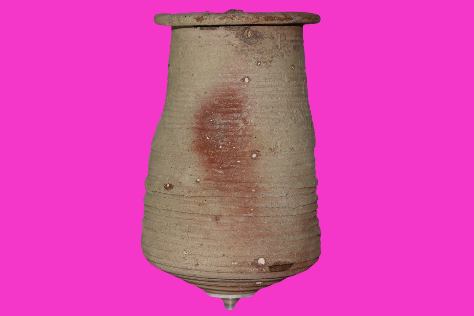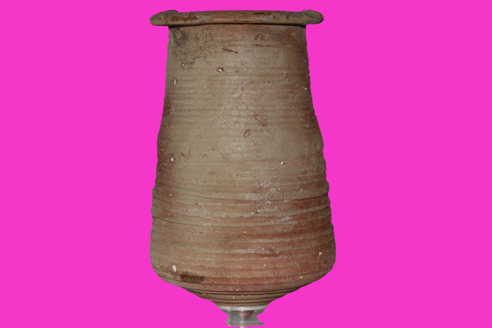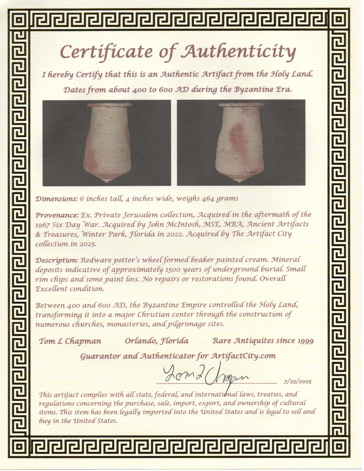 Dimensions: 6 inches tall, 4 inches wide, weighs 464 grams Provenance: Ex. Private Jerusalem collection, Acquired in the aftermath of the 1967 Six Day War. Acquired by John McIntosh, MSE, MBA, Ancient Artifacts & Treasures, Winter Park, Florida in 2022. Acquired by The Artifact City collection in 2025. Description: Redware potter’s wheel formed beaker painted cream. Mineral deposits indicative of approximately 1500 years of underground burial. Small rim chips and some paint loss. No repairs or restorations found. Overall Excellent condition. Between 400 and 600 AD, the Byzantine Empire controlled the Holy Land, transforming it into a major Christian center through the construction of numerous churches, monasteries, and pilgrimage sites.